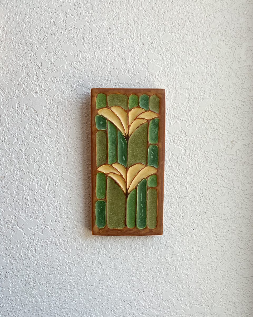 Au naturale: Before being fired in a bisque kiln, a notch is hand cut into the back of each tile. This notch can be used to hang your tile directly on the wall. In the Studio Gallery we use a simple 2″ screw straight into the wall at a 90 degree angle. The tile notch fits securely on the head of the 2″ screw and the 2″ screw holds steadfast to the wall. If the screw isn’t installed into a stud, you might need some kind of additional hardware (e.g. a drywall anchor) to stabilize the screw.