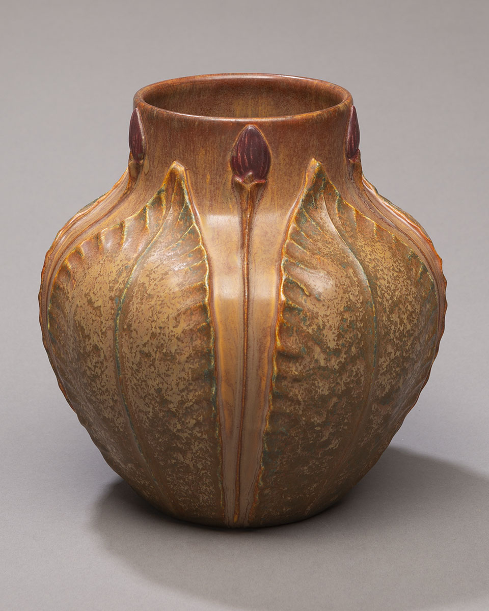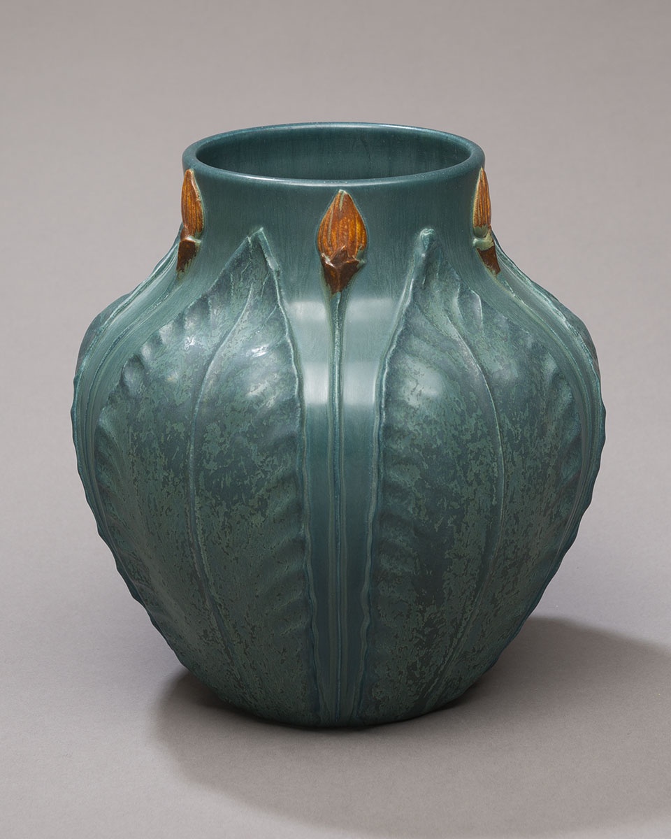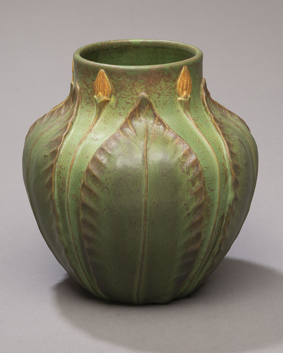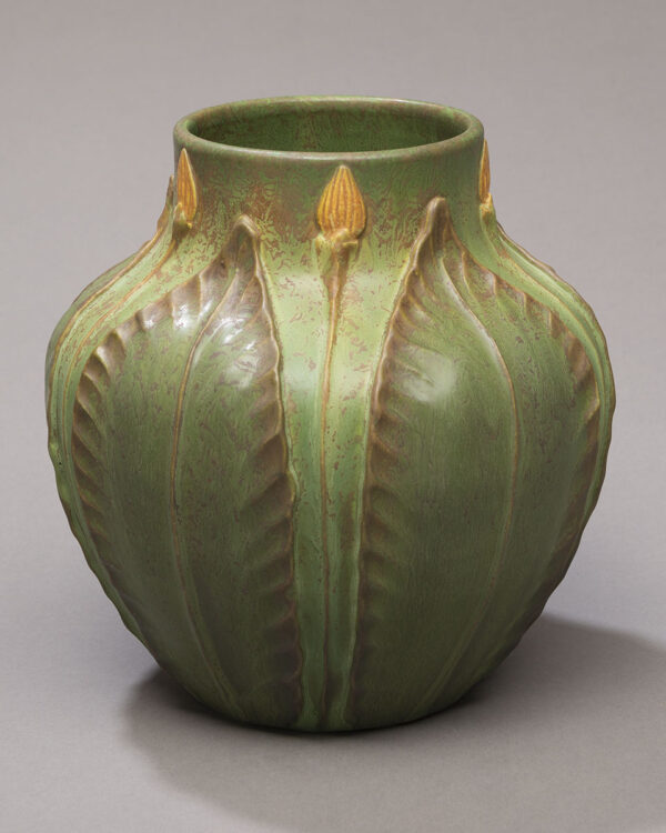 This piece pays homage to the ground-breaking artistry of the historic Grueby Faience Company. The hallmarks of this award-winning pottery were harmony and symmetry of form and sculpture presented in richly textured organic colors. This vase, along with other pieces of Grueby-revival designs in our collection, will satisfy the aesthetic requirements of even the most die-hard Arts and Crafts purist.