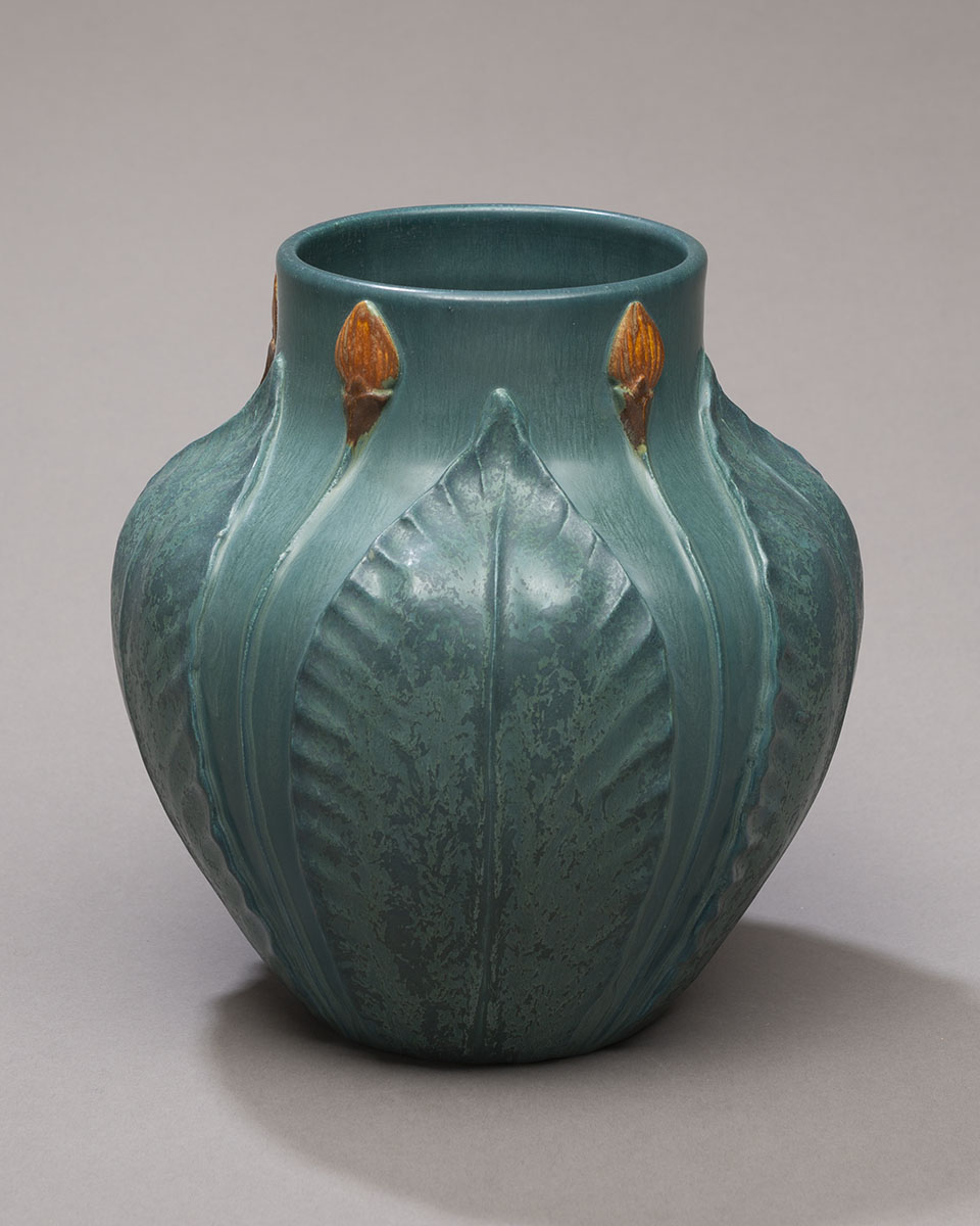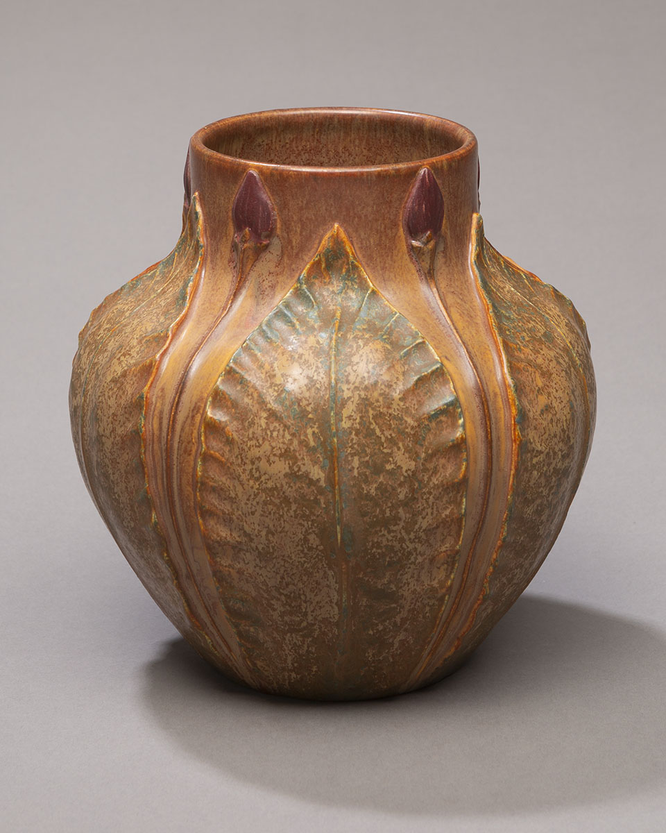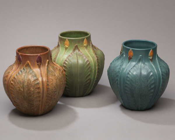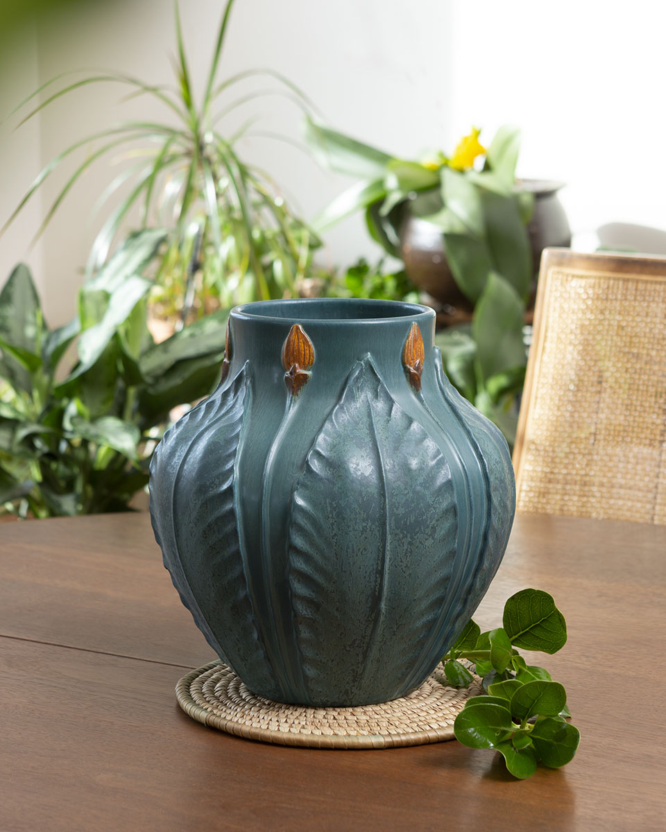 This piece pays homage to the ground-breaking artistry of the historic Grueby Faience Company. The hallmarks of this award-winning pottery were harmony and symmetry of form and sculpture presented in richly textured organic colors. This vase, along with other pieces of Grueby-revival designs in our collection, will satisfy the aesthetic requirements of even the most die-hard Arts and Crafts purist.