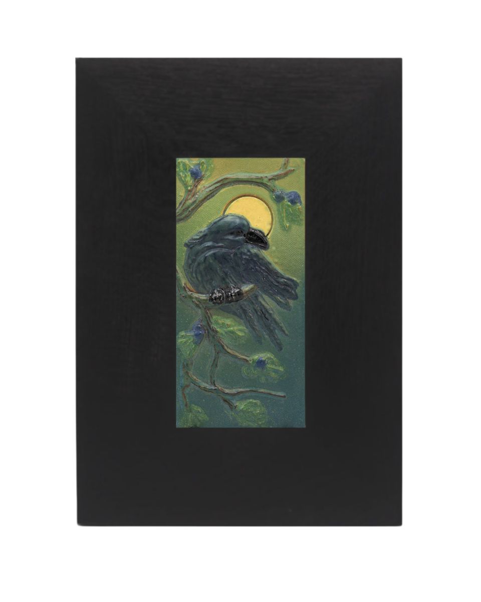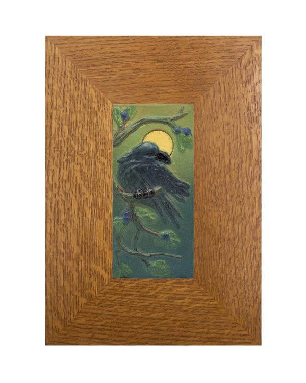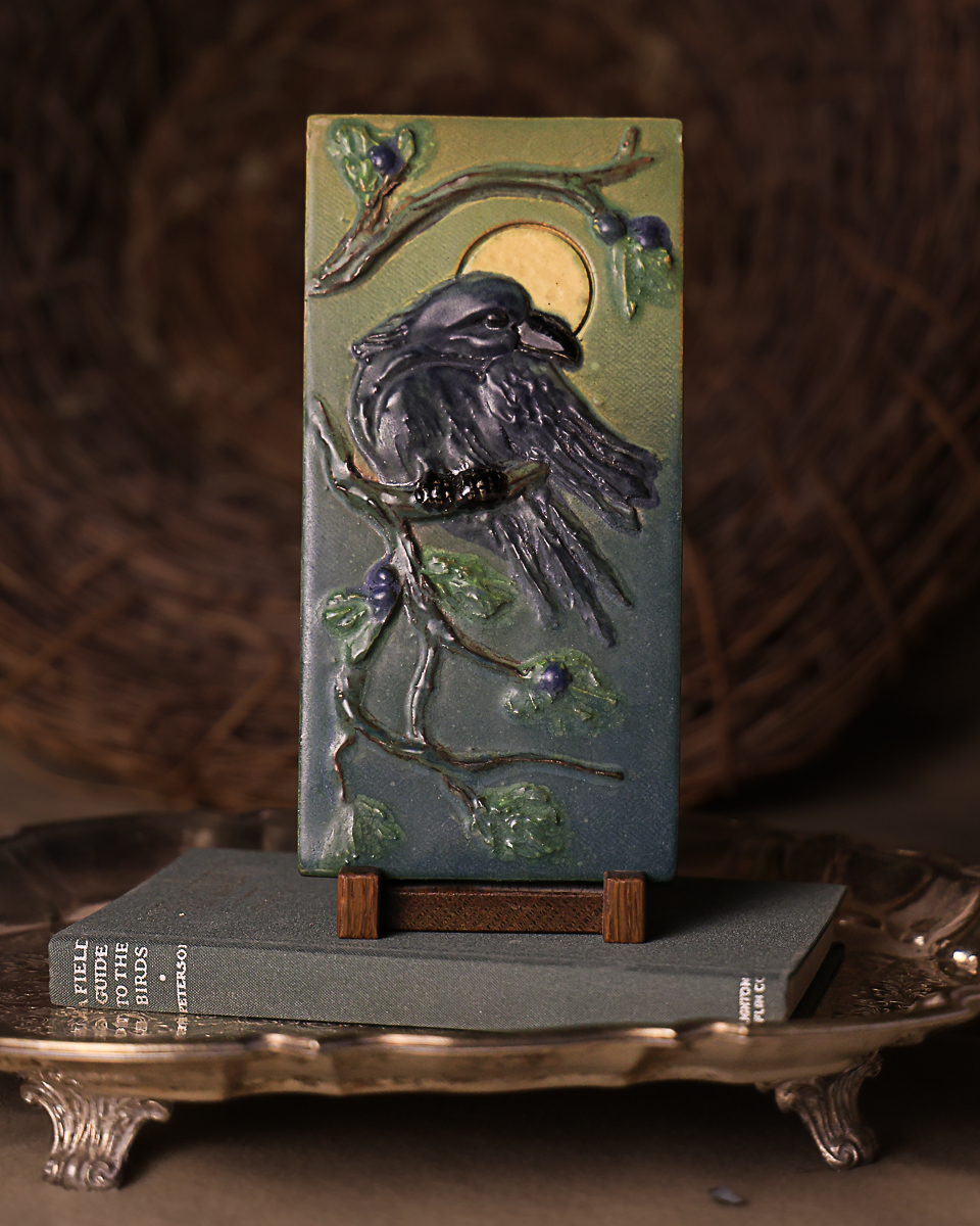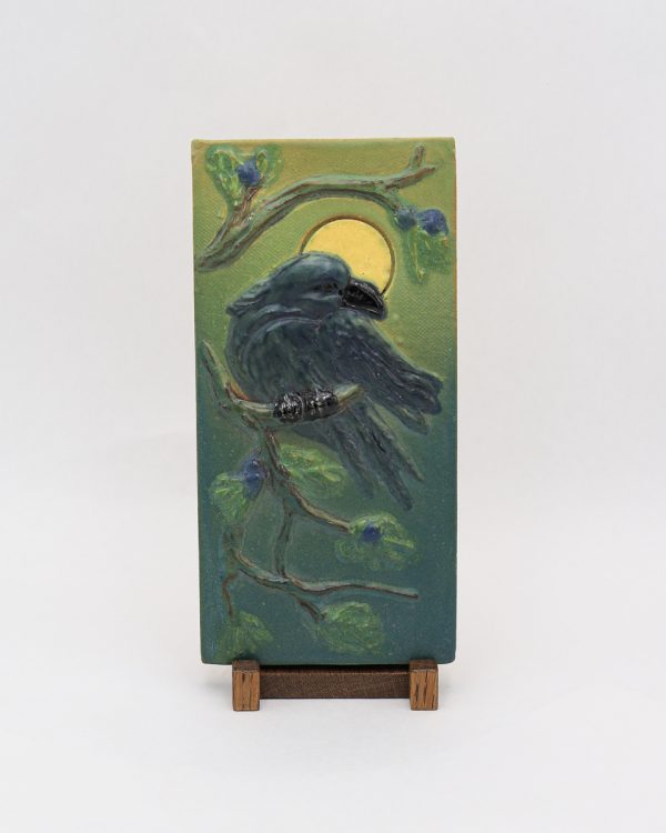 A companion to our popular Alchemy Vase, this tile captures the same moody, twilight scene in low relief. A raven perches on a juniper branch beneath a luminous moon, its dark feathers rendered in rich detail against a backdrop of soft green and dusky blue. Berries and leaves frame the composition, adding depth and color. Like the vase that inspired it, the Alchemy Tile embodies the magic and mystery of nightfall — now in a format perfect for hanging on a wall.