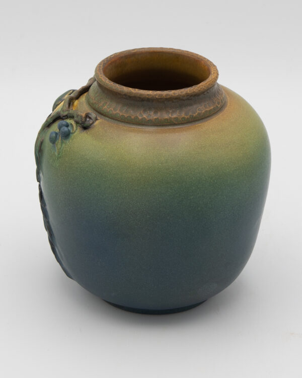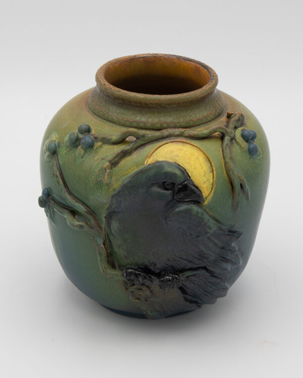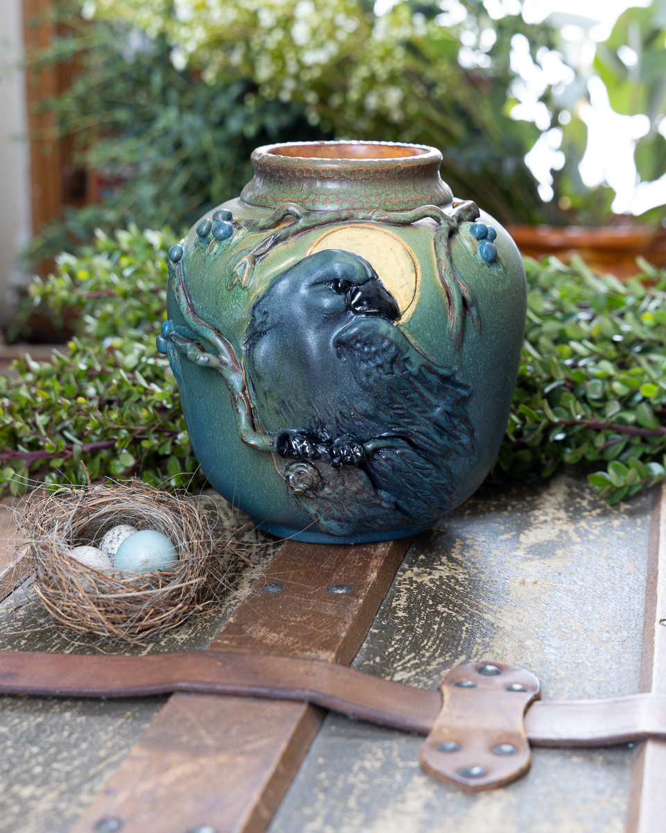 This striking vase captures the essence of twilight’s transitions, featuring a hand-sculpted raven in low relief, perched amidst juniper branches against a luminous moon. The piece is brought to life through softly layered glazes in olive green with touches of gold and deep blue, creating a rich interplay of evening hues. More than just a vase, Alchemy symbolizes the shifting hours and embodies the magic and mystery of nightfall.