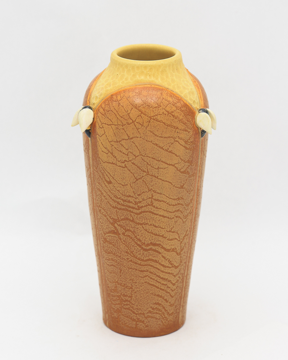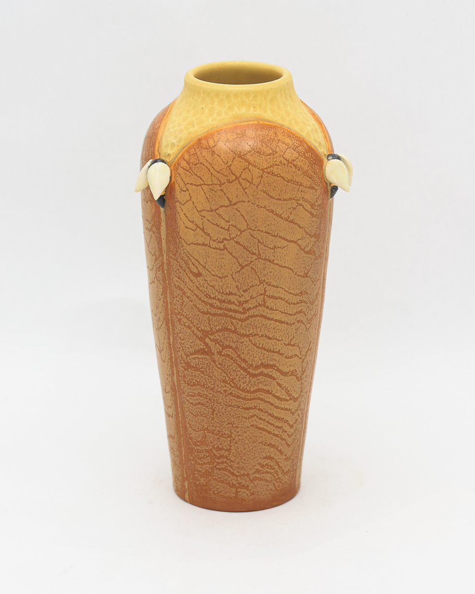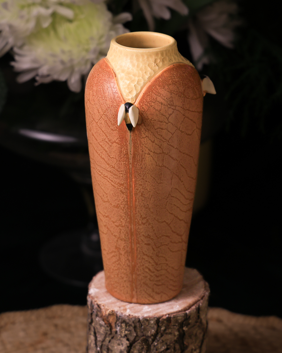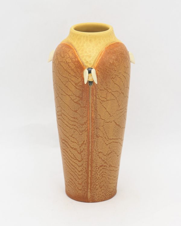 An apiary is where beehives are kept — a place of quiet industry and golden reward. Three hand-sculpted bees rest at the shoulder of this elegant, architectural form, their delicate wings peeking out from between tall panels. This limited-edition glaze variation trades the honey-toned Wheat of our NEW! 2026 Studio Collection piece for something deeper and more evocative — rich Pumpkin layered with yellow crackle that suggests the weathered comb of an ancient hive, brightening to soft yellow at the hammered neck.