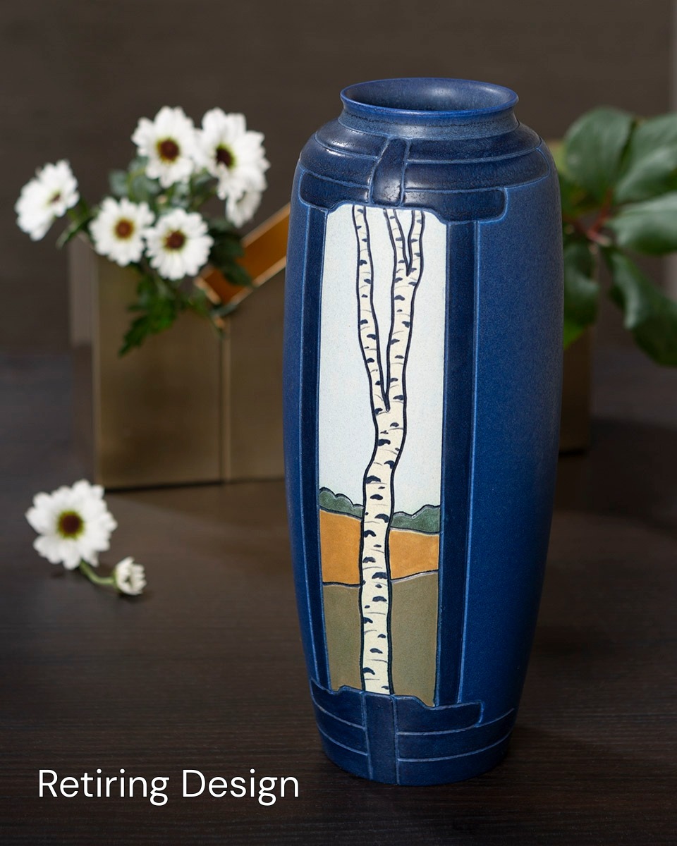 The Birch Vase invites our gaze to a window which perfectly frames a birch tree amidst a rolling landscape. The architectural detail on the form evokes the rounded timbers of the historic Greene & Greene architecture, enhancing the illusion that we are inside looking out. Full of contrast and offered in four striking colors, this vase makes a bold statement in any decor.
