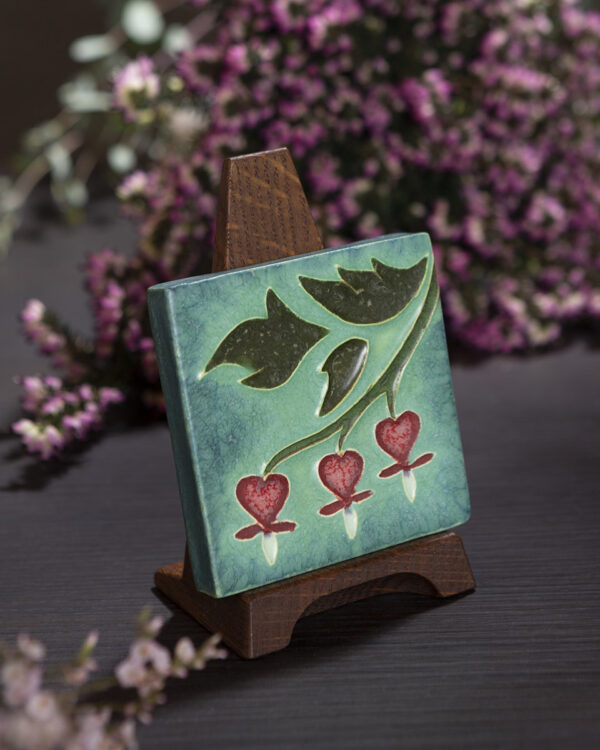 Is there any flower more recognizable than the bleeding heart with their gently arching stems and characteristic flower? This beautiful tile captures its essence—complete with sweetness and nostalgia. Stand not included.