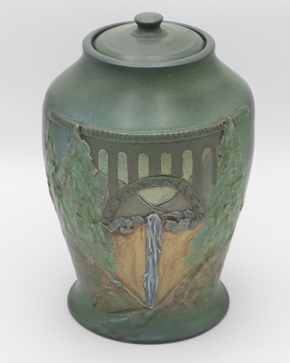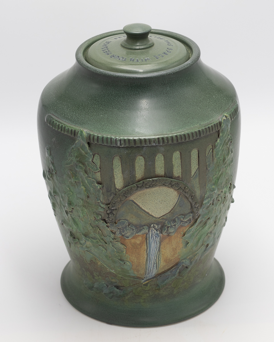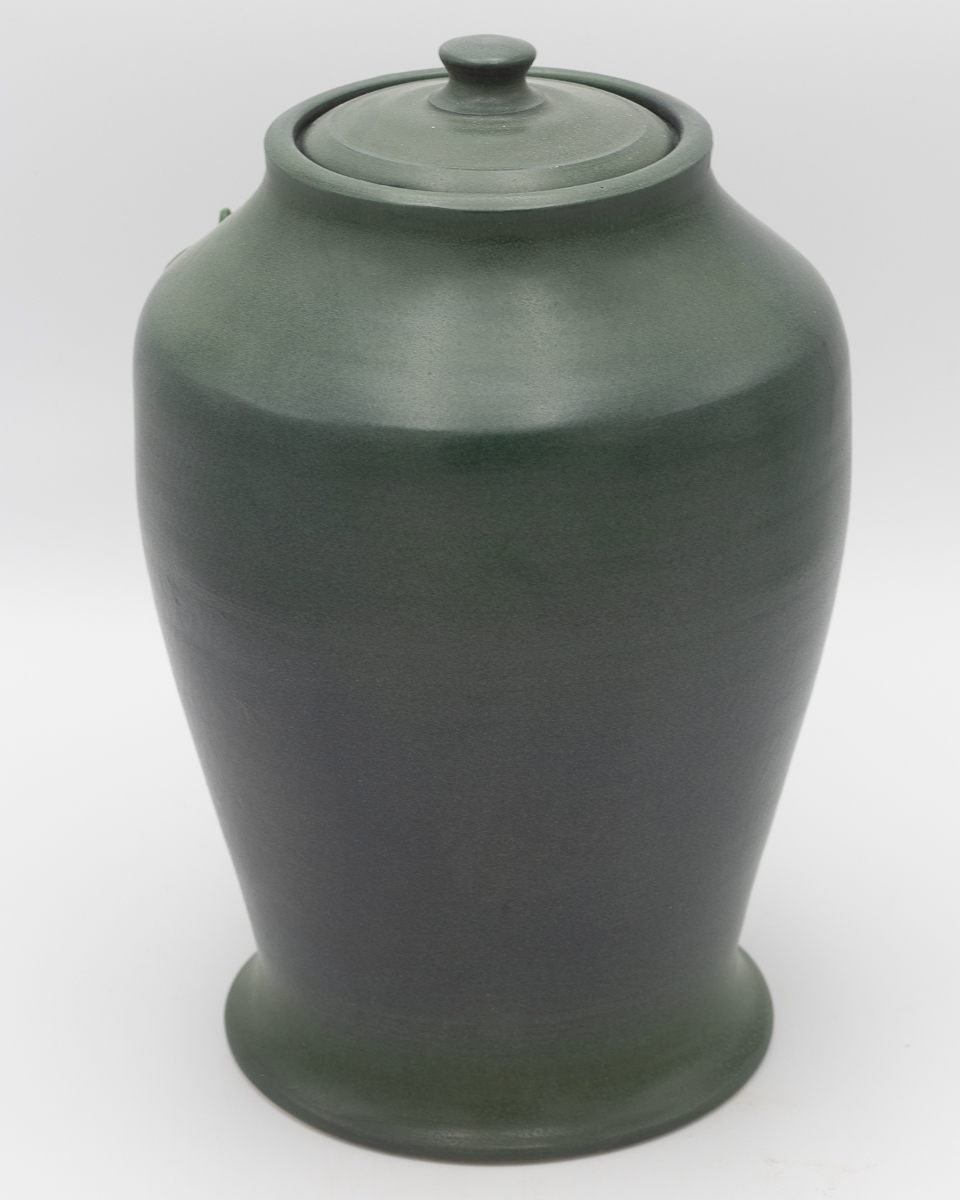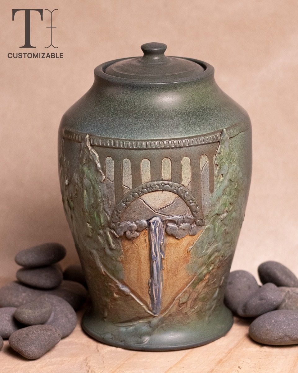 This Arts & Crafts-inspired piece offers a serene tribute to your loved one, featuring hand-sculpted relief decoration of a peaceful waterfall framed by classical arches and verdant foliage. The matte green glaze evokes moss-covered stone and tranquil forest settings, while the flowing water and golden basin create a sanctuary of natural beauty.