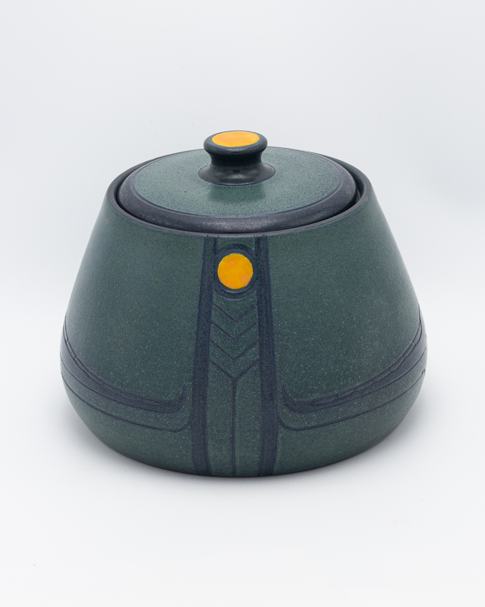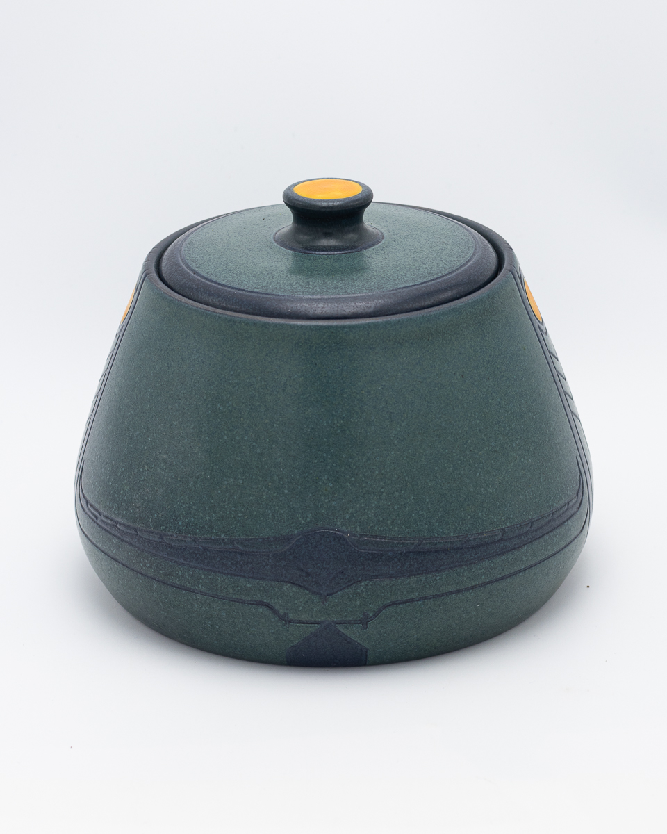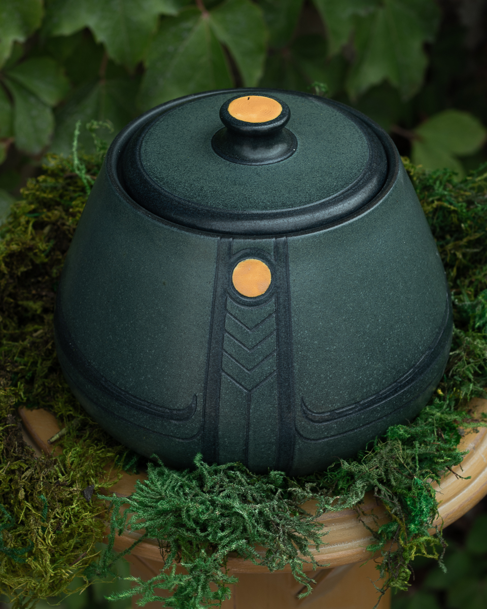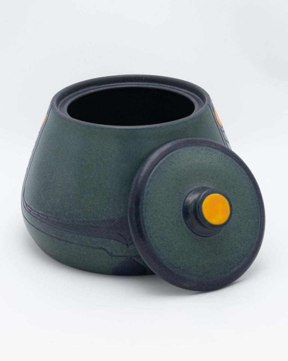 For his milestone 10th anniversary piece, Alek created the Broadwing Jar—a deeply personal tribute to the person who first introduced him to ceramics. This lidded vessel showcases his mastery of carved line work with an elegant design inspired by broad-winged birds in flight, featuring intricate incised patterns that create geometric wing motifs highlighted by golden accents against the rich teal glaze. The piece honors Ric Lamore, a potter of 50 years whose studio is called Broadwing Clay, and who has been a mentor and inspiration throughout Alek’s journey.