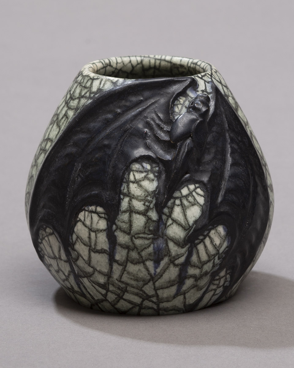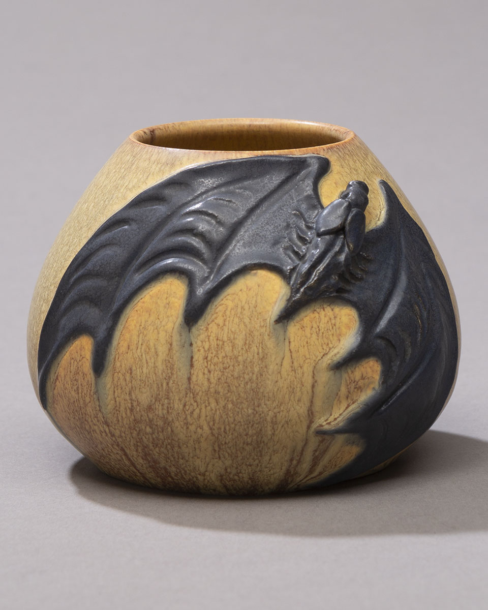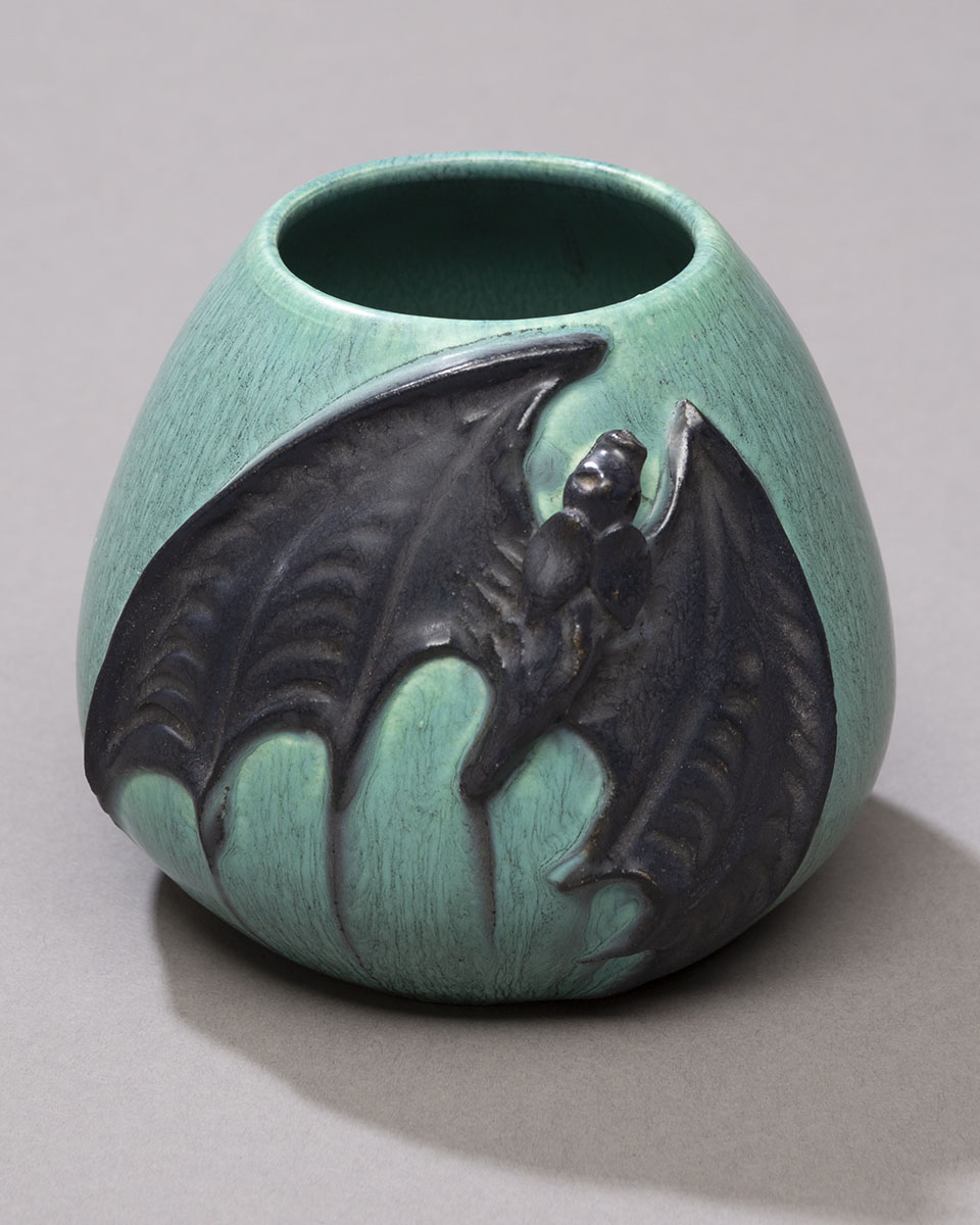 Warm weather and dusky skies beckon Wisconsin bats to begin their swooping ritual. These hypnotic creatures, descending from the trees and arching across the sky inspired this bat vase. Dramatic glazes and a delicately sculpted bat make this a moody, impactful piece.