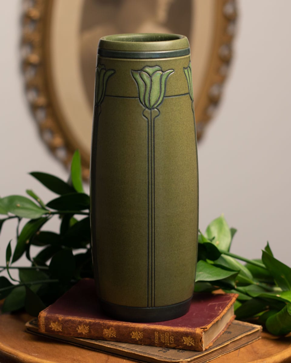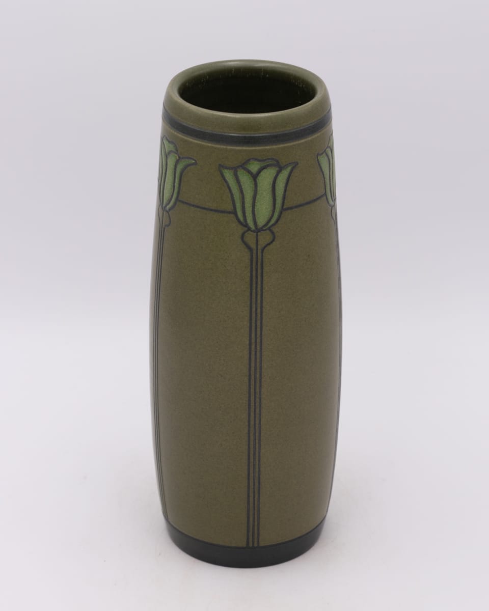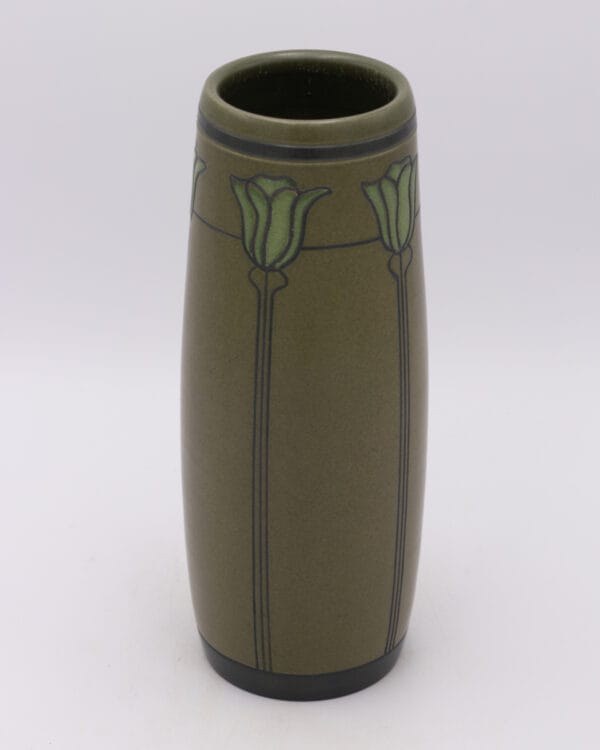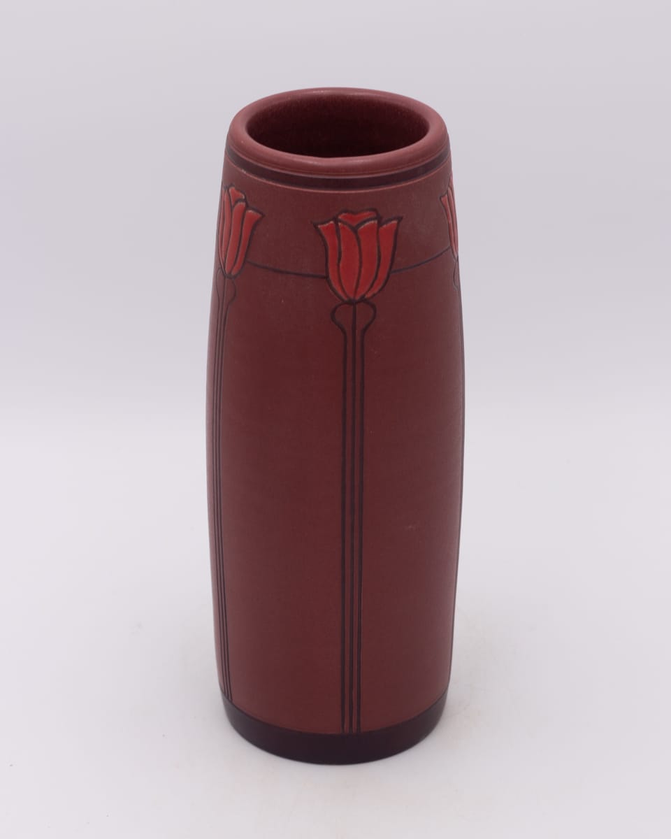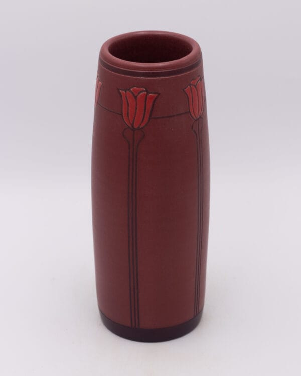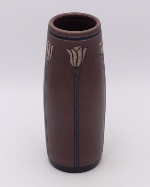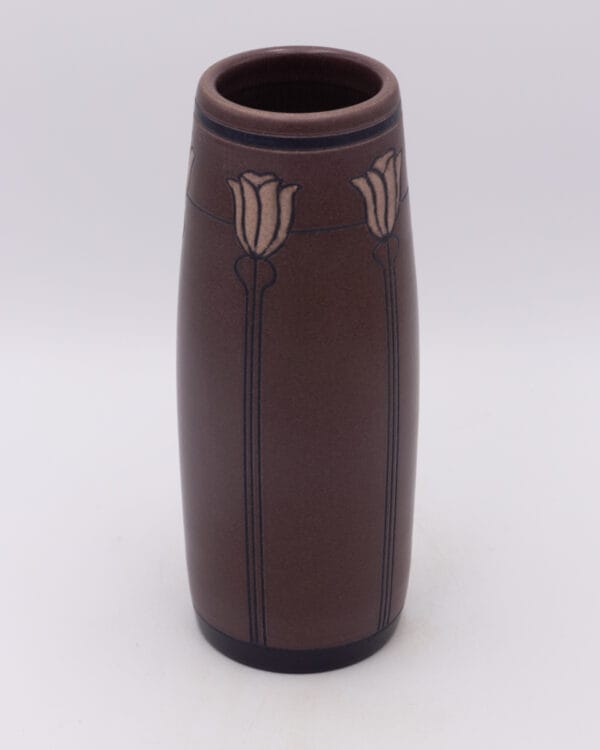 Visual rhythm creates a ceramic melody in the Canon Vase. Here, five hand-carved tulips encircle a graceful, understated form. The piece is glazed in three different tonal color schemes–Chestnut, Crystalline Purple, and Cranberry and coordinates with designs from our musically-inspired Rhythm Line. The pieces in our Rhythm Line forego traditional sculptural elements in favor of streamlined forms, artistic abstractions, and incised, patterned black linework reminiscent of a musical staff.