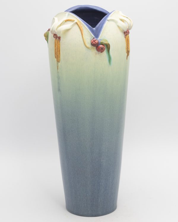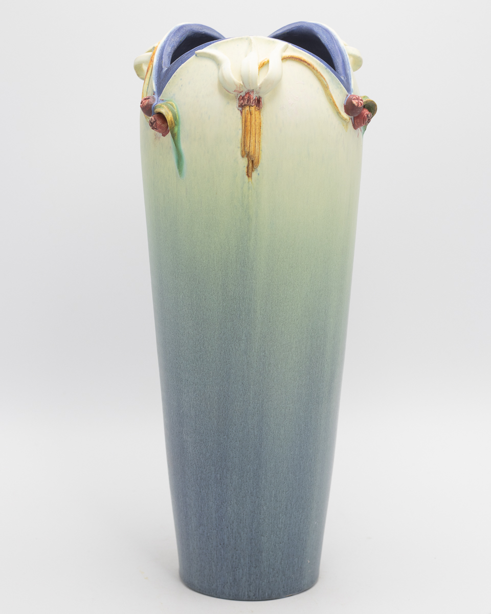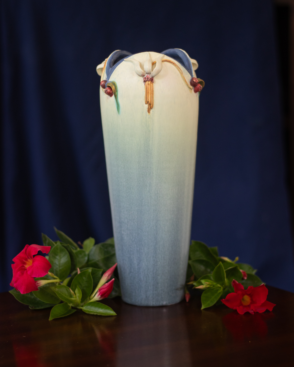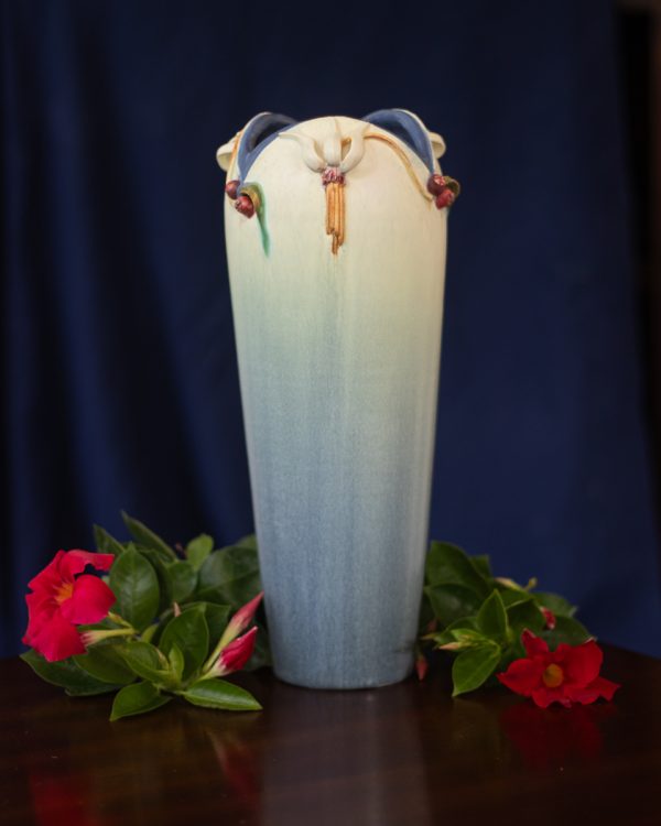 The Cranberry Frost Vase celebrates winter’s most festive berry in an elegant, elongated form. Its graceful silhouette features hand-sculpted cranberry blossoms in high relief, their delicate petals unfurling in shades of coral and cream with golden stamens against a background that transitions from soft ivory to misty blue. This vase brings botanical beauty to winter decor, celebrating the crimson fruit that adds color and brightness to the season’s table.
