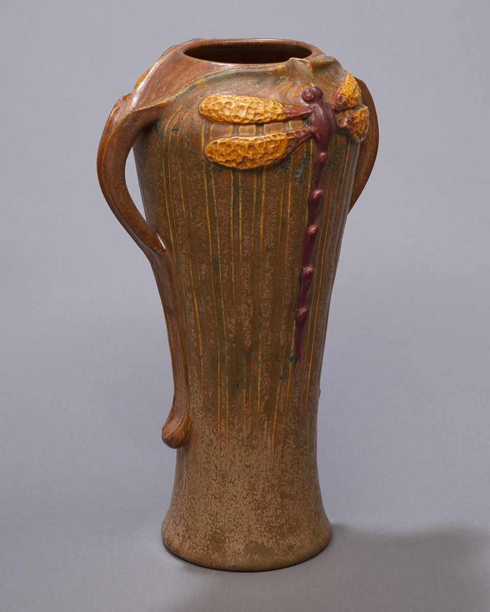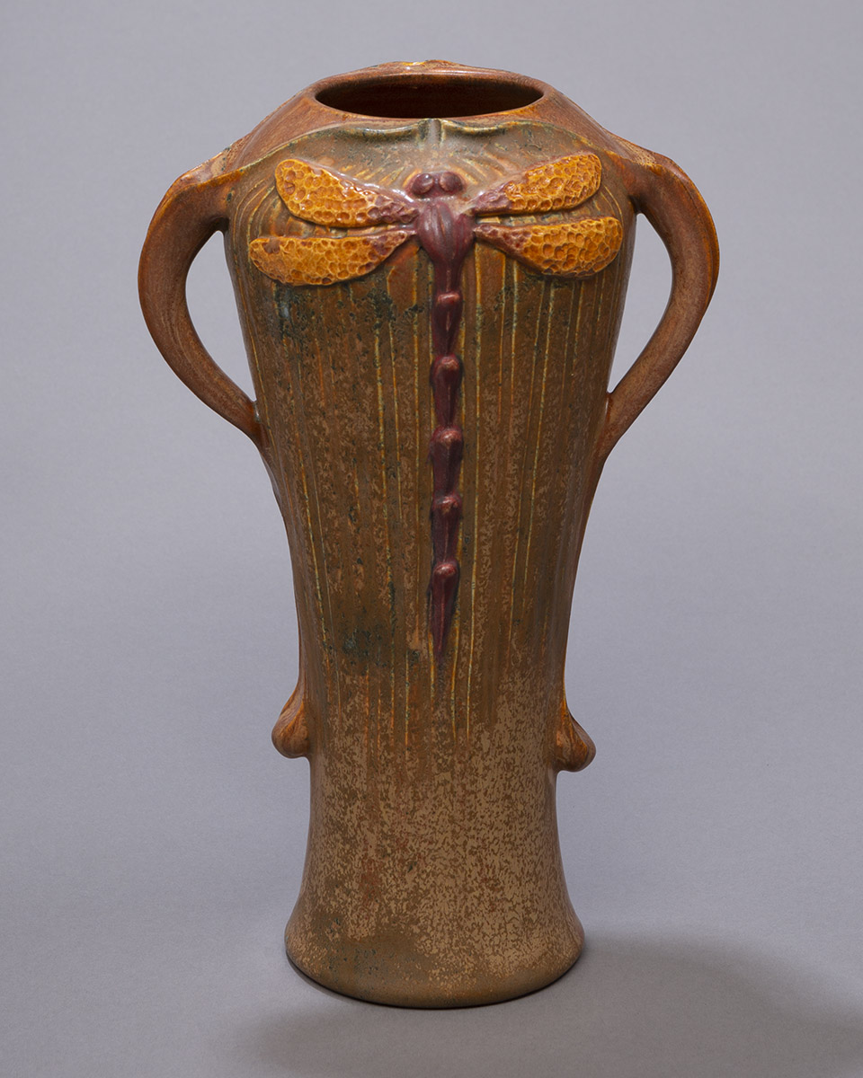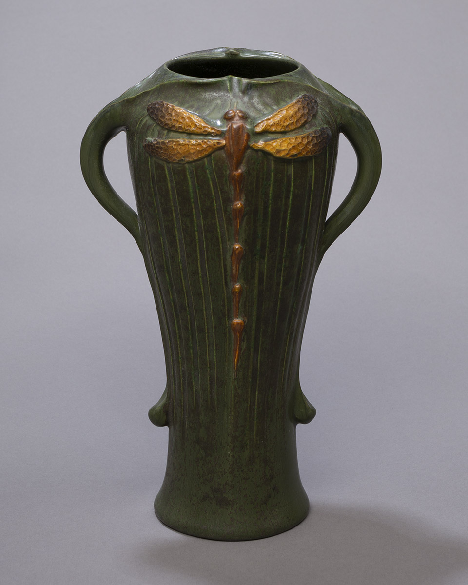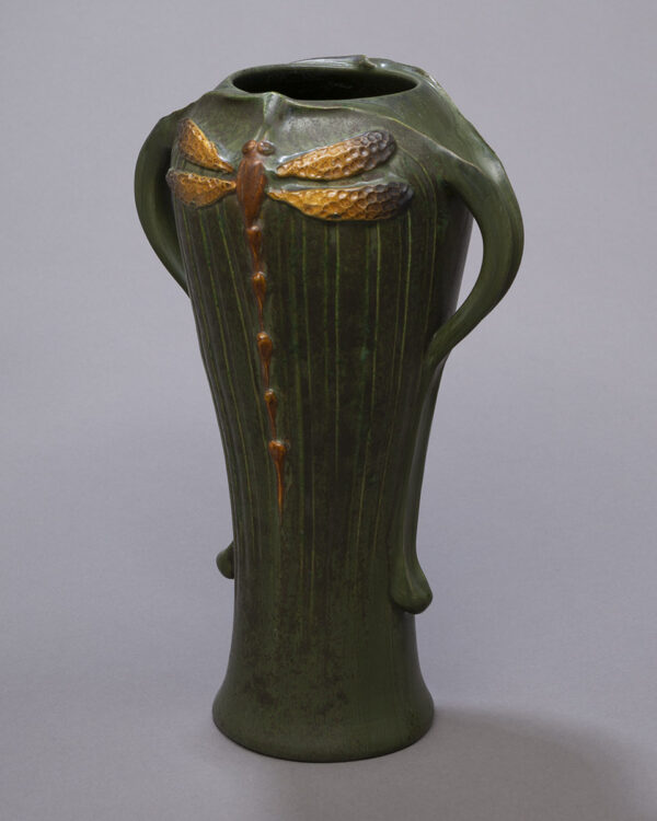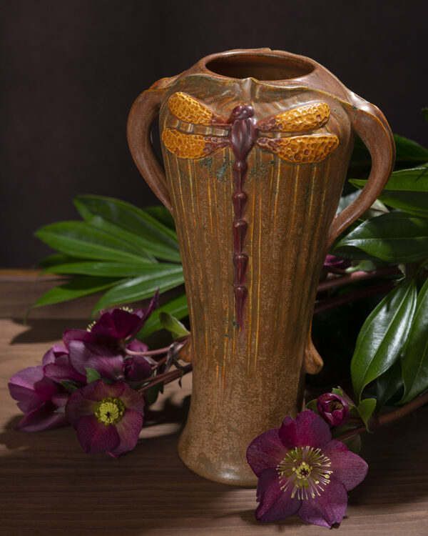 The Dragonfly Duet Vase was inspired by a retired Ephraim vase from 2009–The Legacy Vase. A dragonfly motif applied to the Legacy Vase design, with its sturdy handles and bold leaf sculpture, makes for something altogether new. This piece has a metalwork quality that is enhanced by an innovative glaze technique.