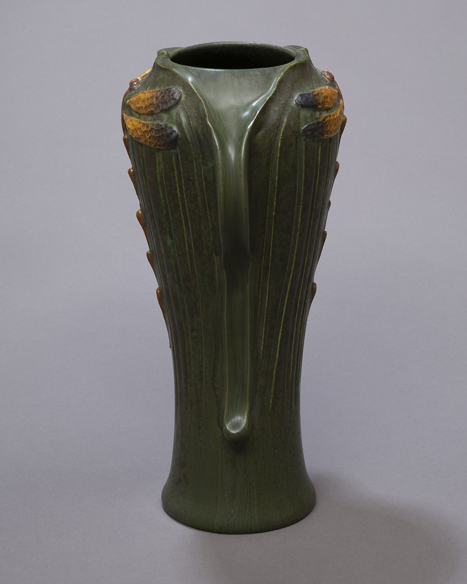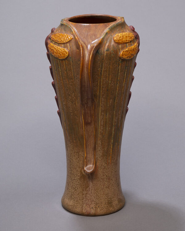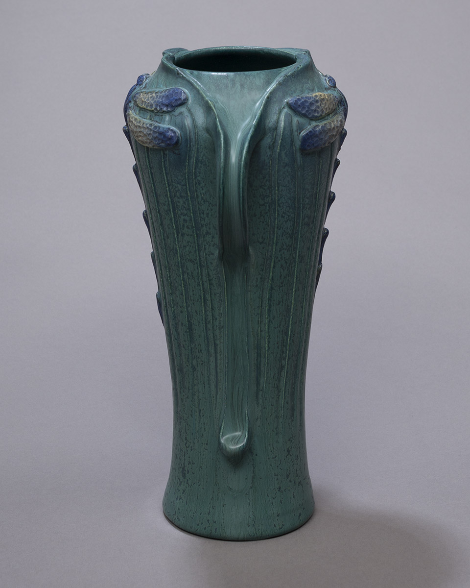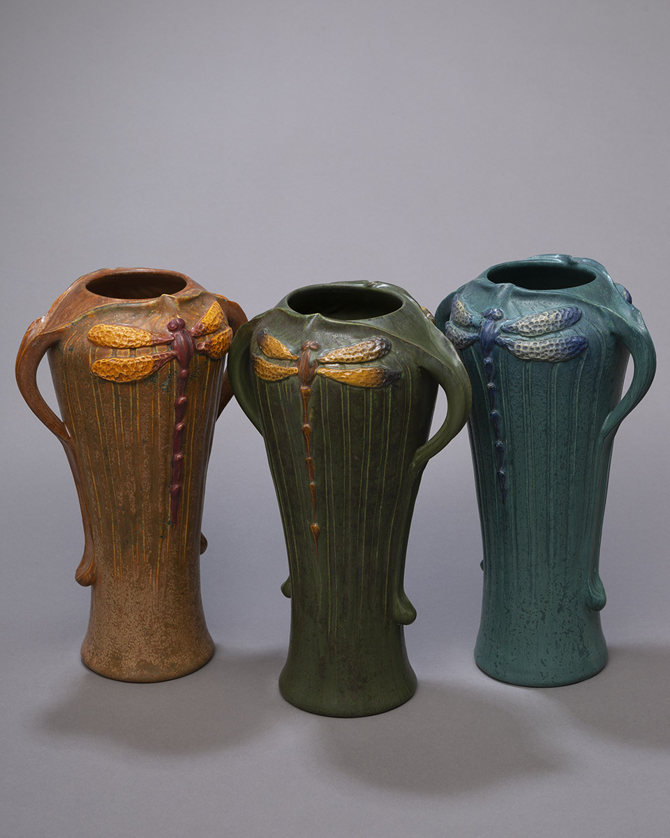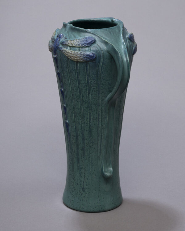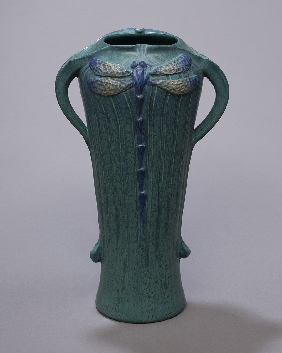 The Dragonfly Duet Vase was inspired by a retired Ephraim vase from 2009–The Legacy Vase. A dragonfly motif applied to the Legacy Vase design, with its sturdy handles and bold leaf sculpture, makes for something altogether new. This piece has a metalwork quality that is enhanced by an innovative glaze technique.