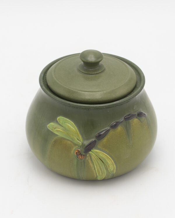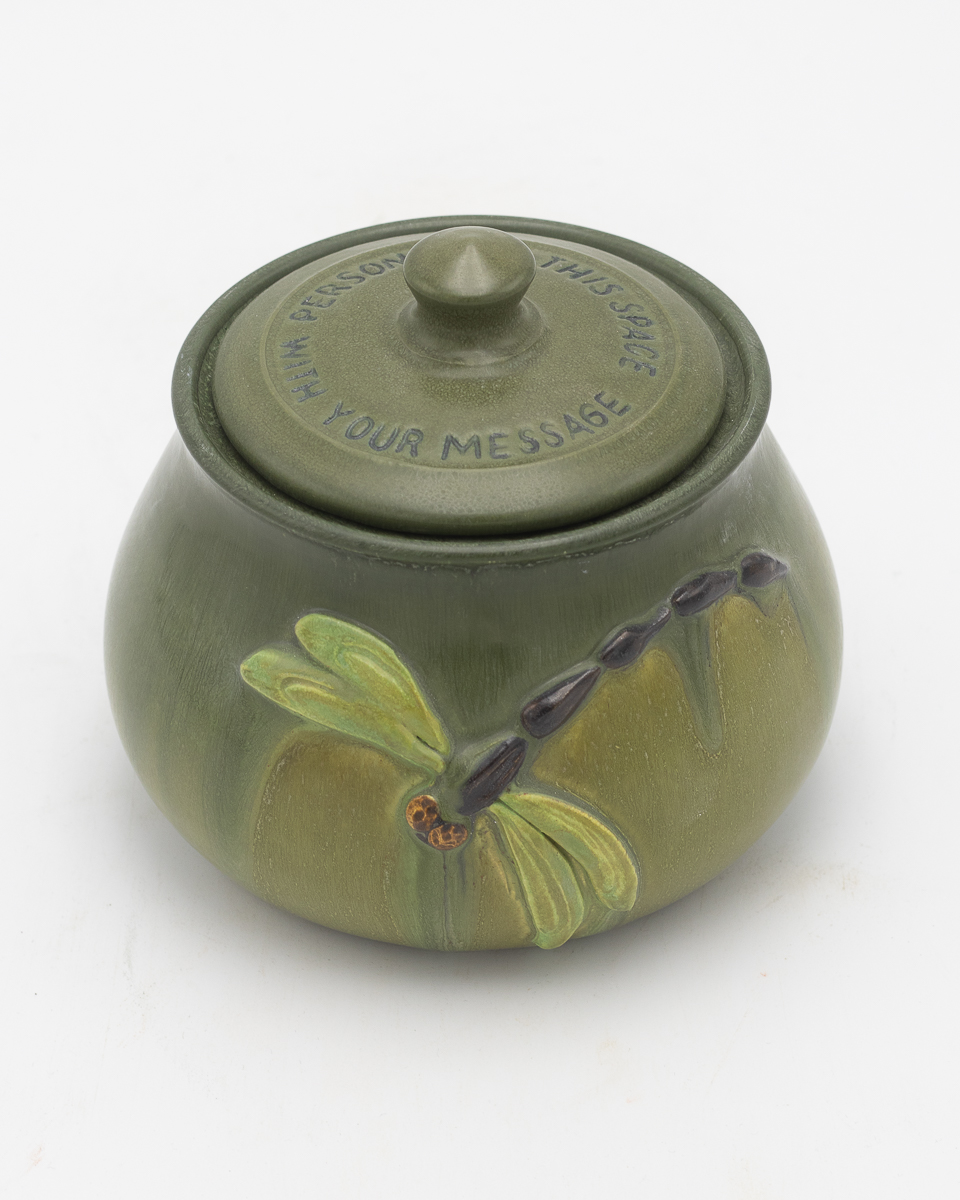 A sculptural dragonfly alights on this rounded vessel, its stylized wings and body rendered in vibrant greens and deep black against an earthy olive glaze. The graceful curves of this intimate vessel create a perfect canvas for this symbol of transformation and spiritual journey, honoring cherished memories with artistic elegance and natural harmony.