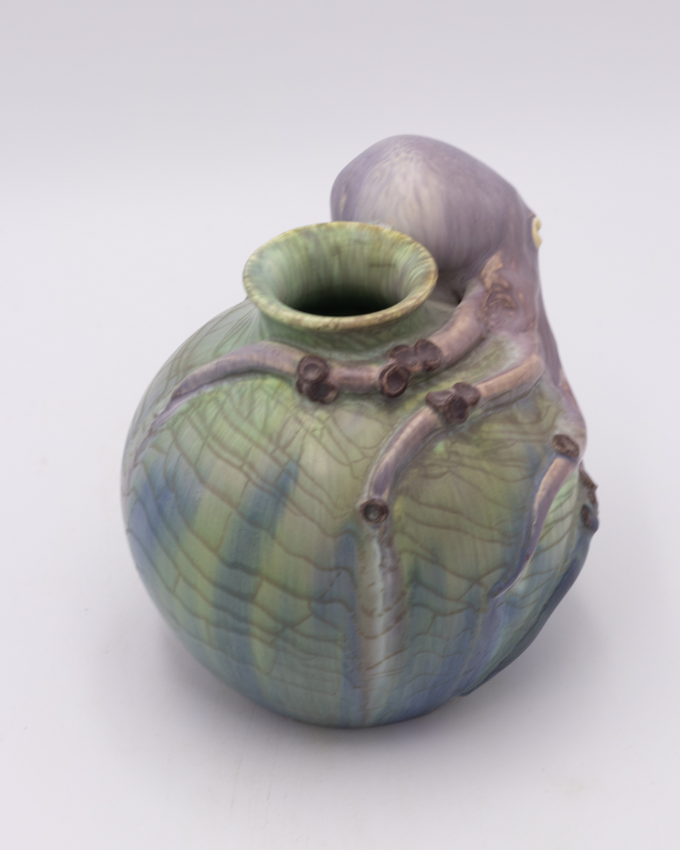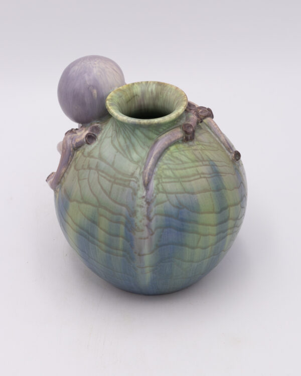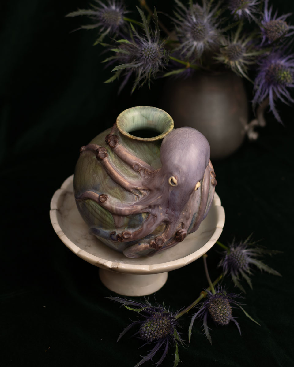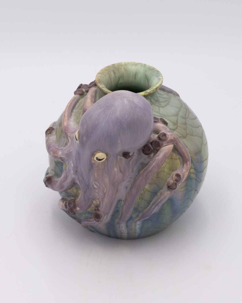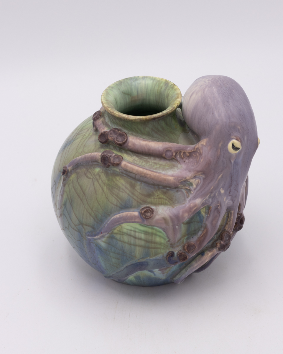 Octopuses, with their expressive limbs and amorphous forms, are a favorite motif in the studio. Here, an octopus wraps around a form, giving the impression of movement. The Ebb and Flow Vase is glazed in a watery, pastel palette with a crackle finish.