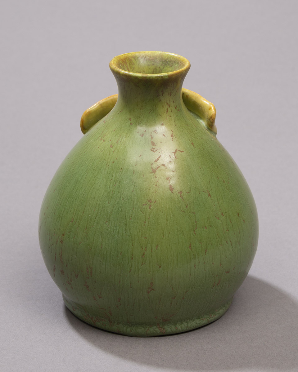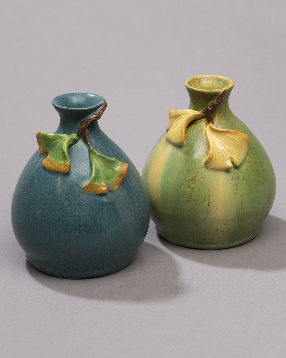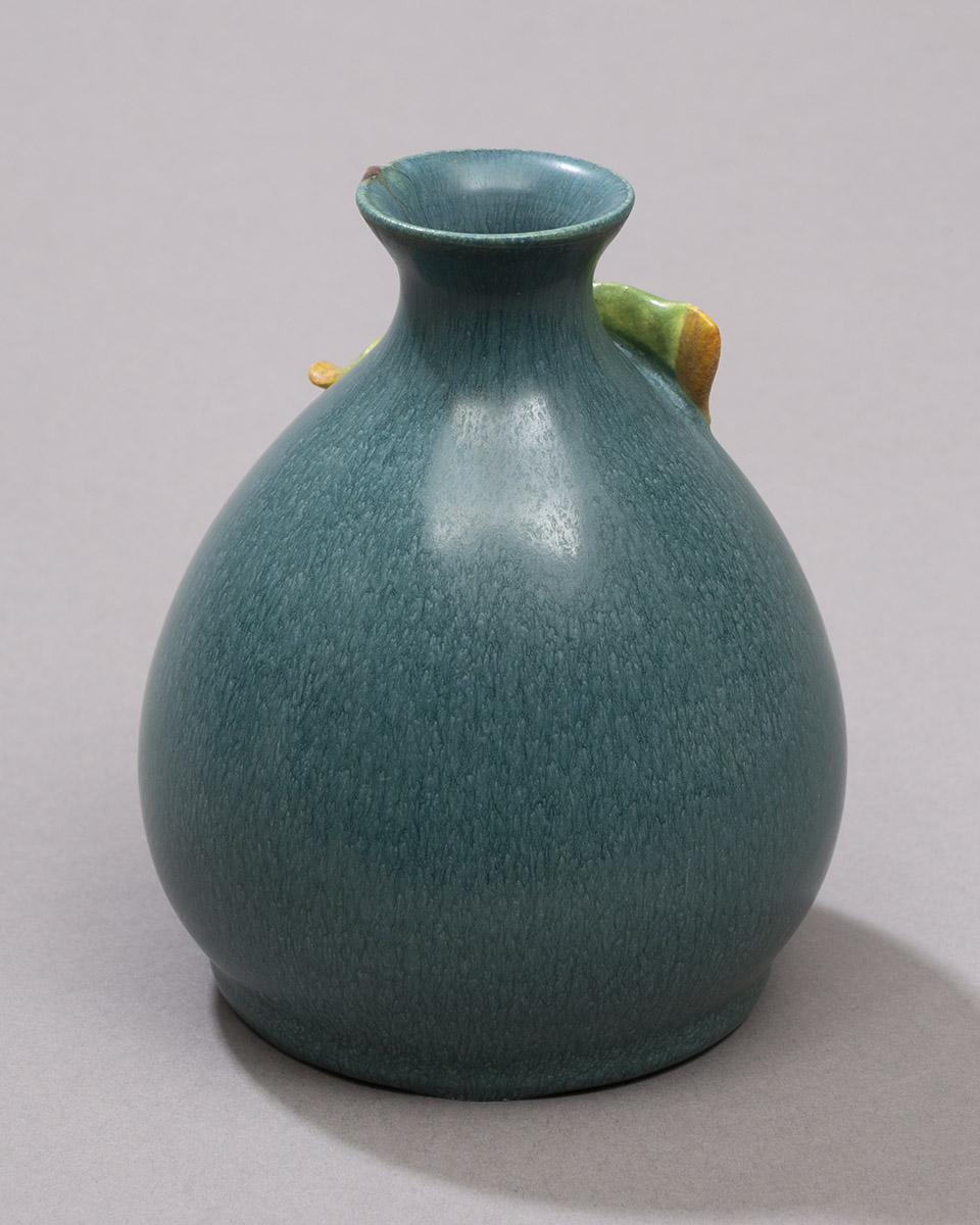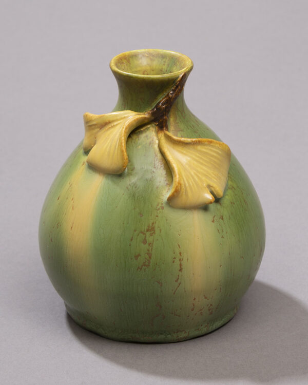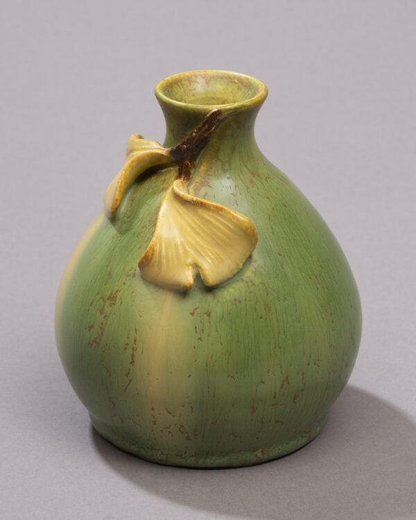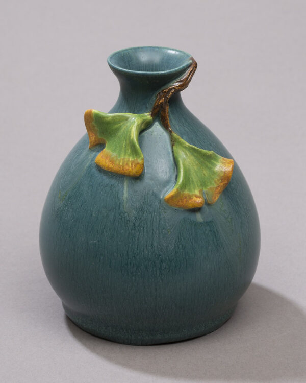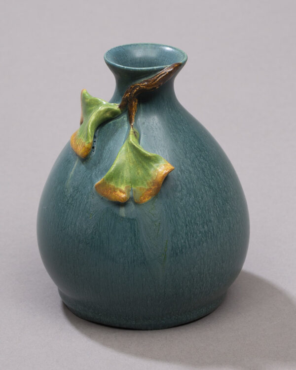 This sweet piece is larger than some of our usual miniatures, but smaller than the typical cabinet vase. Two delicate, understated ginkgo leaves flutter at the neck of this small bottle form. We offer the Ginkgo Pawn Bottle in two traditional Ephraim glaze variations—warm Algae and cool Teal—making this piece an easy addition to your existing collection.