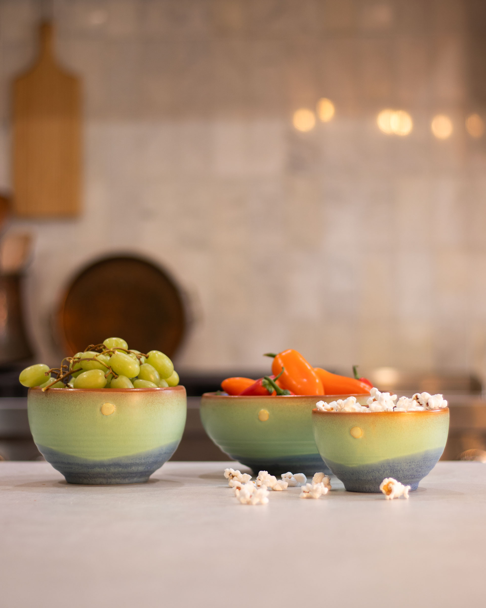 Scape Bowls feature our signature landscape design in an aquatic color scheme of soft blue and green tones. The bowls in this series have been designed to nest together as a set or stand alone, depending on your preference.
