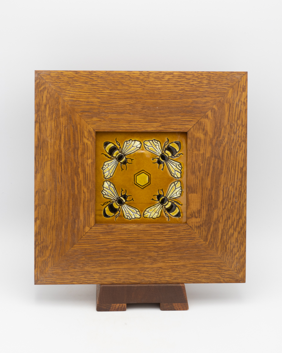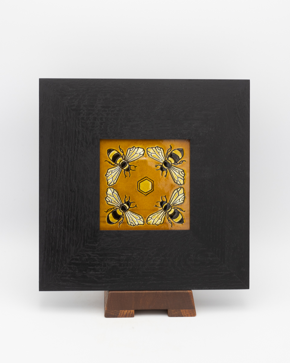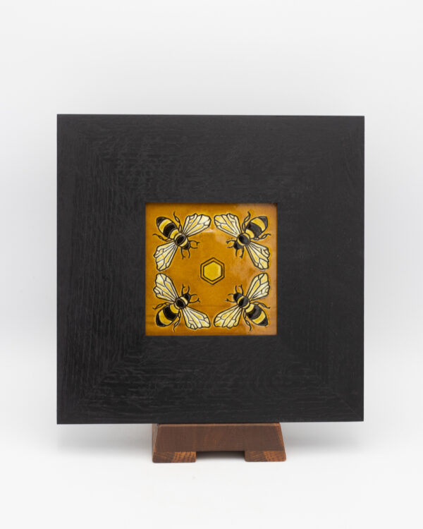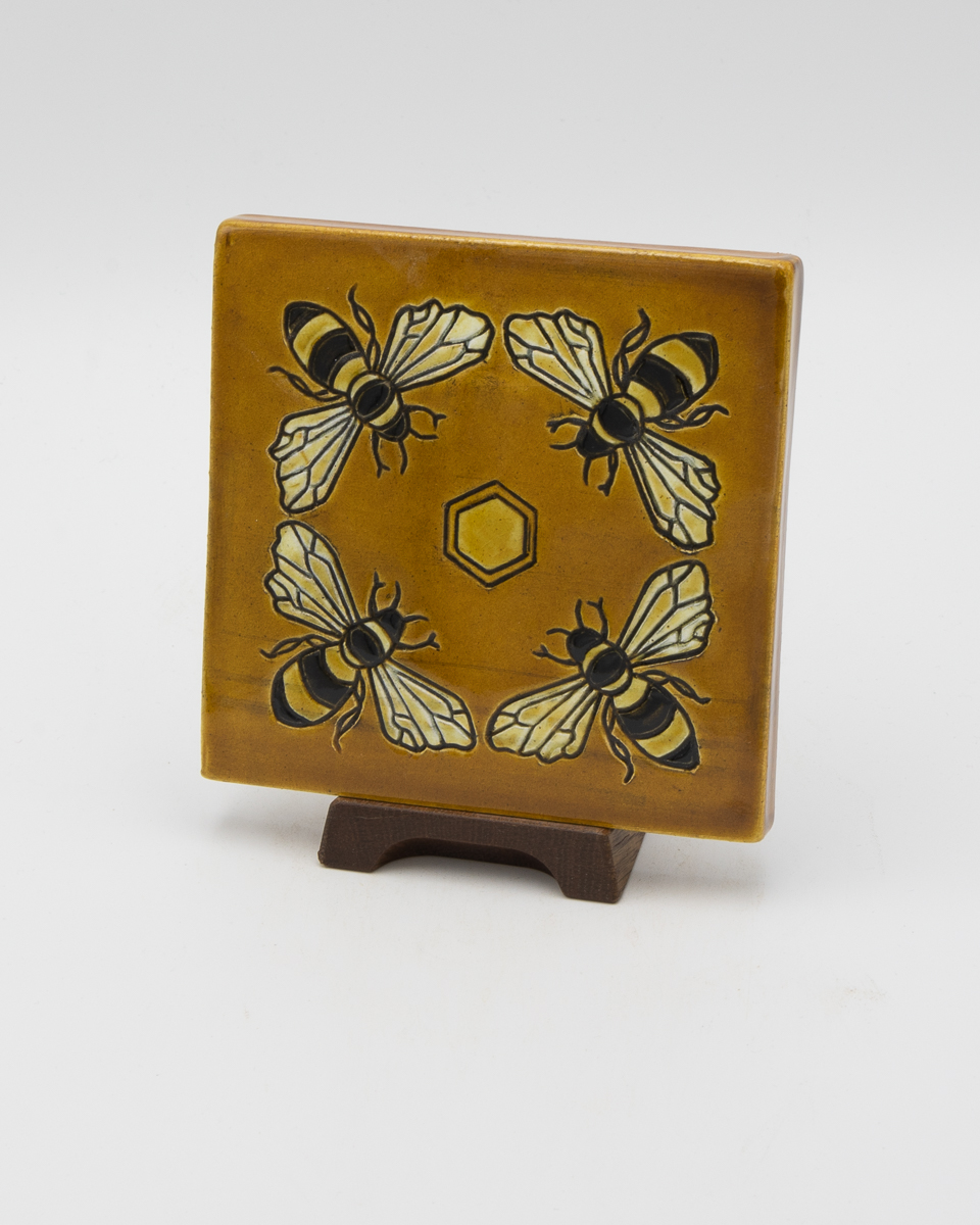 Four honey bees circle a central hexagon in perfect symmetry, their detailed wings and bodies creating a mesmerizing pattern against a warm glossy amber background glaze. Like its namesake, this elegant composition reveals new details with each viewing, from the intricate wing patterns to the geometric harmony of the design.