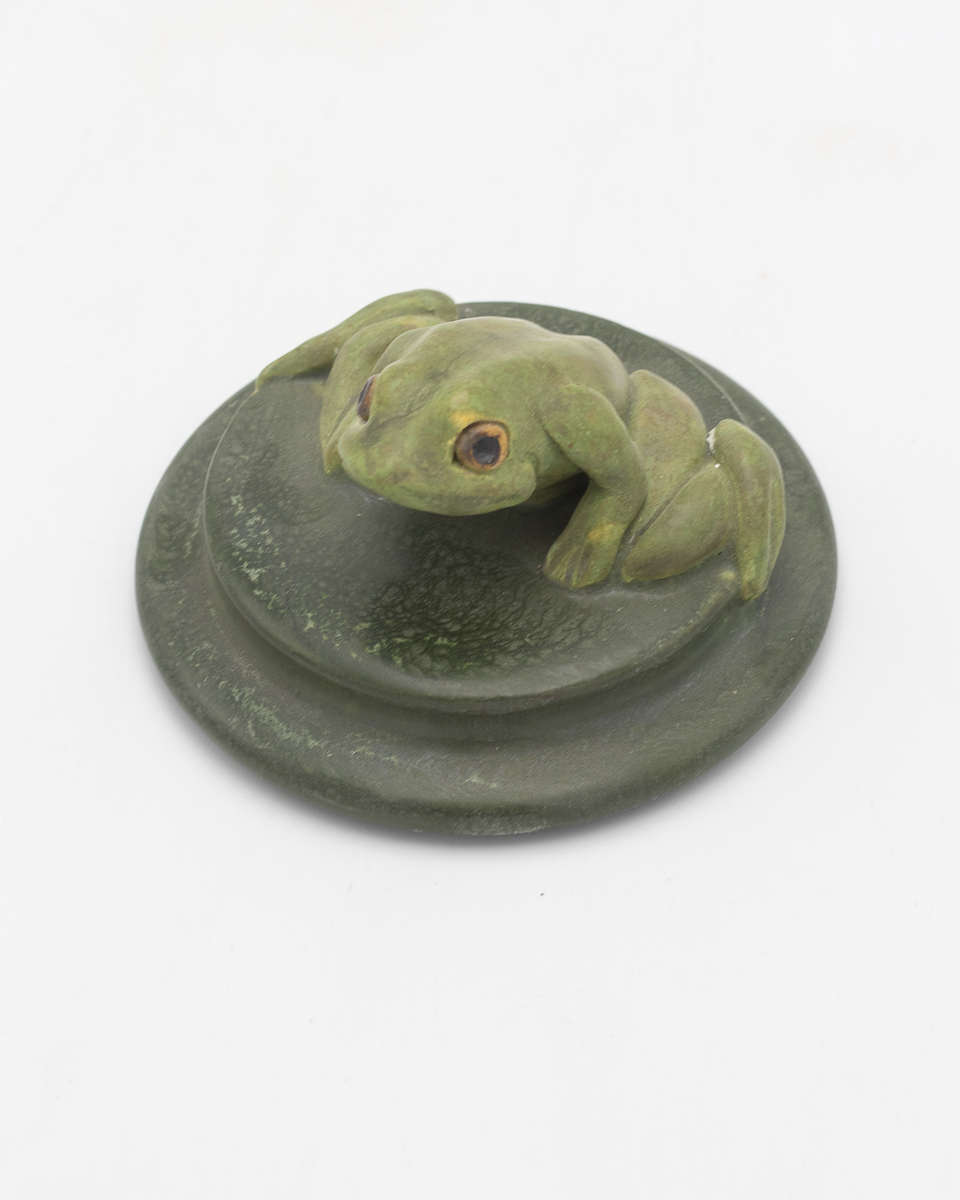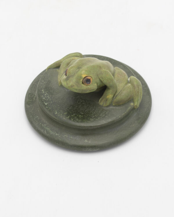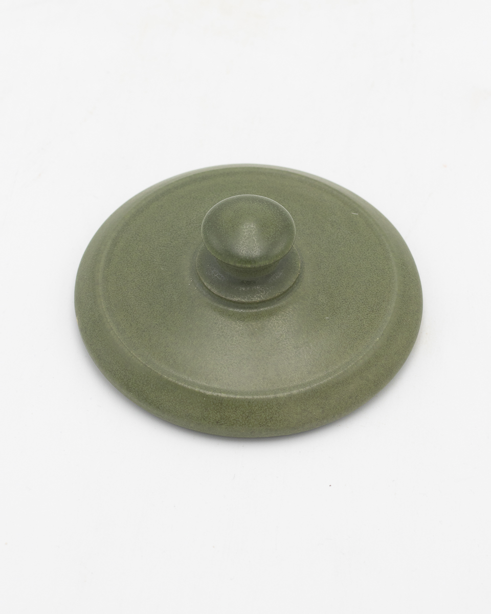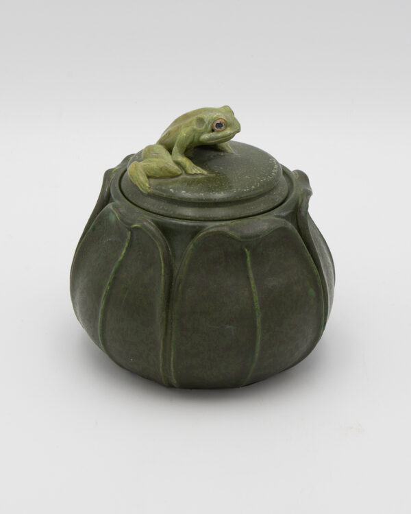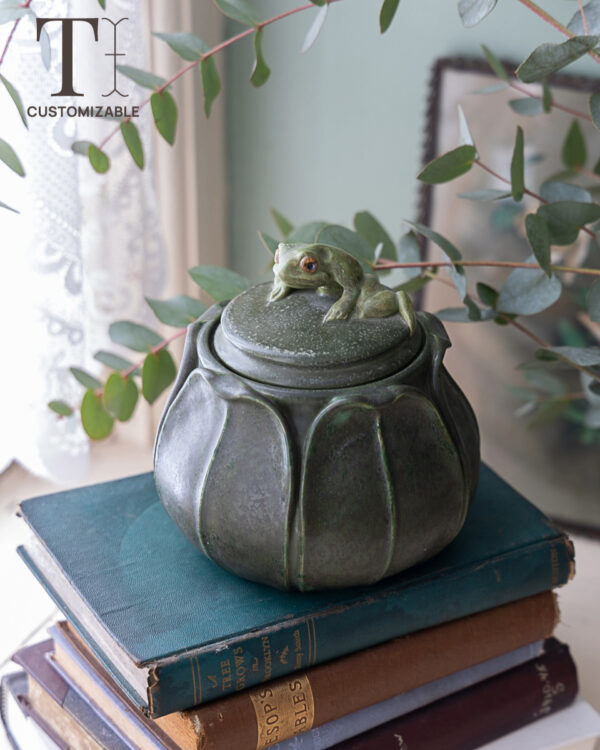 This piece celebrates both artistry and whimsy. The vessel’s surface is adorned with a rhythmic pattern of sculpted leaves, each one carefully rendered by hand and finished in rich, earthy green glazes. Choose the lid that suits you—standard, customized, or hand-sculpted frog, full of personality, that keeps watch from its perch atop this distinctive lidded jar.