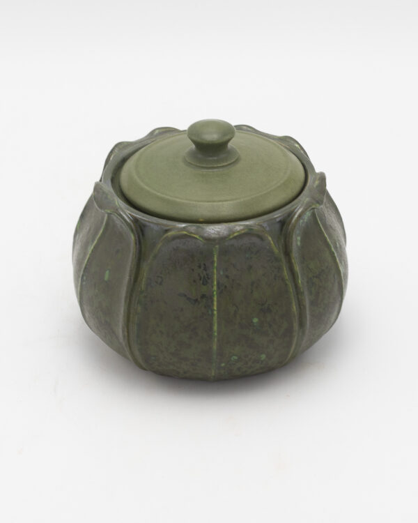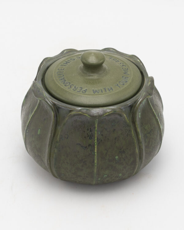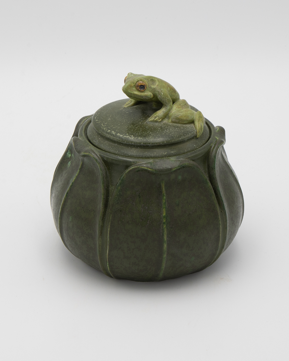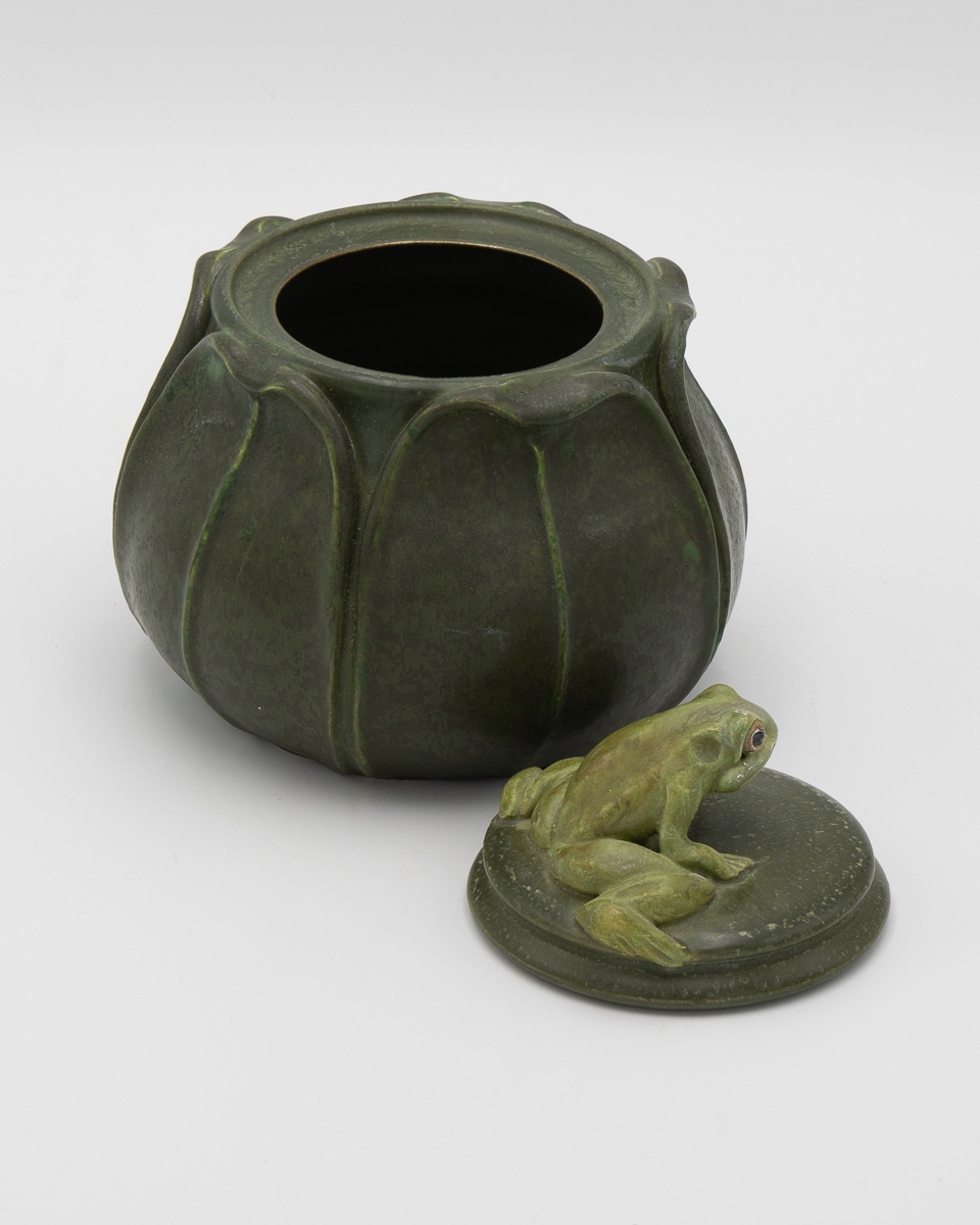 This piece celebrates both artistry and whimsy. The vessel’s surface is adorned with a rhythmic pattern of sculpted leaves, each one carefully rendered by hand and finished in rich, earthy green glazes. Choose the lid that suits you—standard, customized, or hand-sculpted frog, full of personality, that keeps watch from its perch atop this distinctive lidded jar.