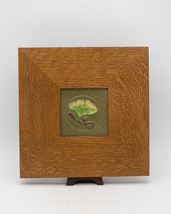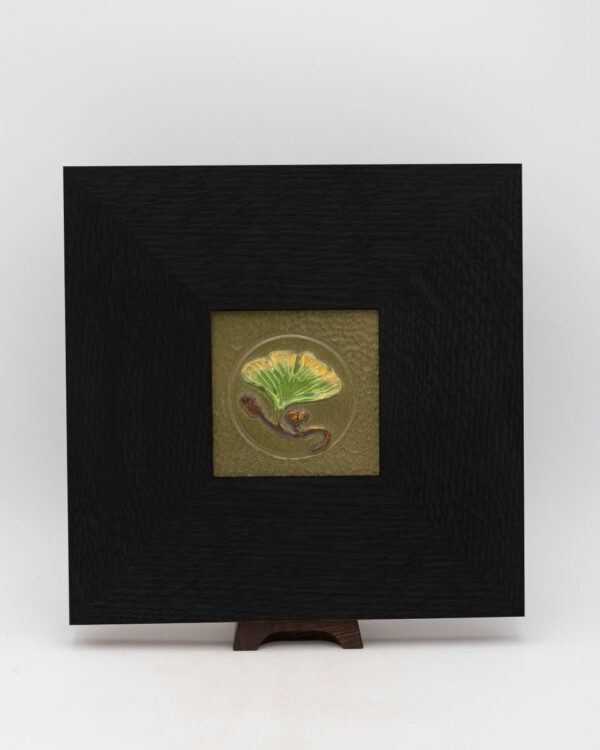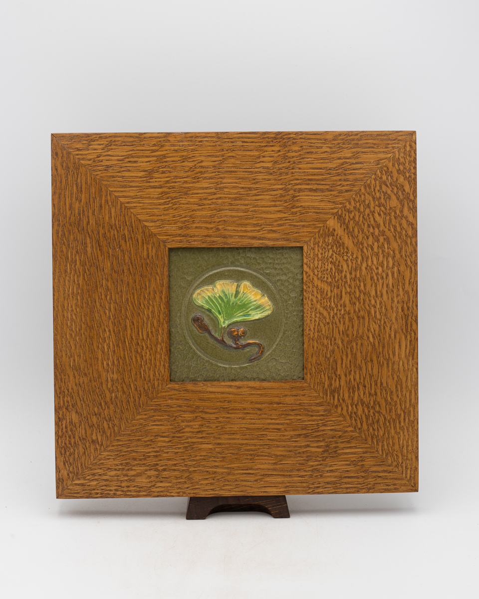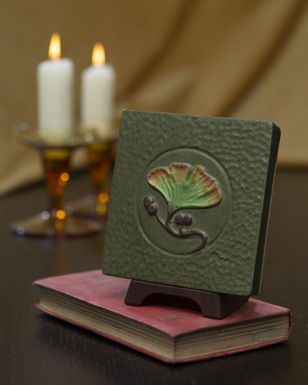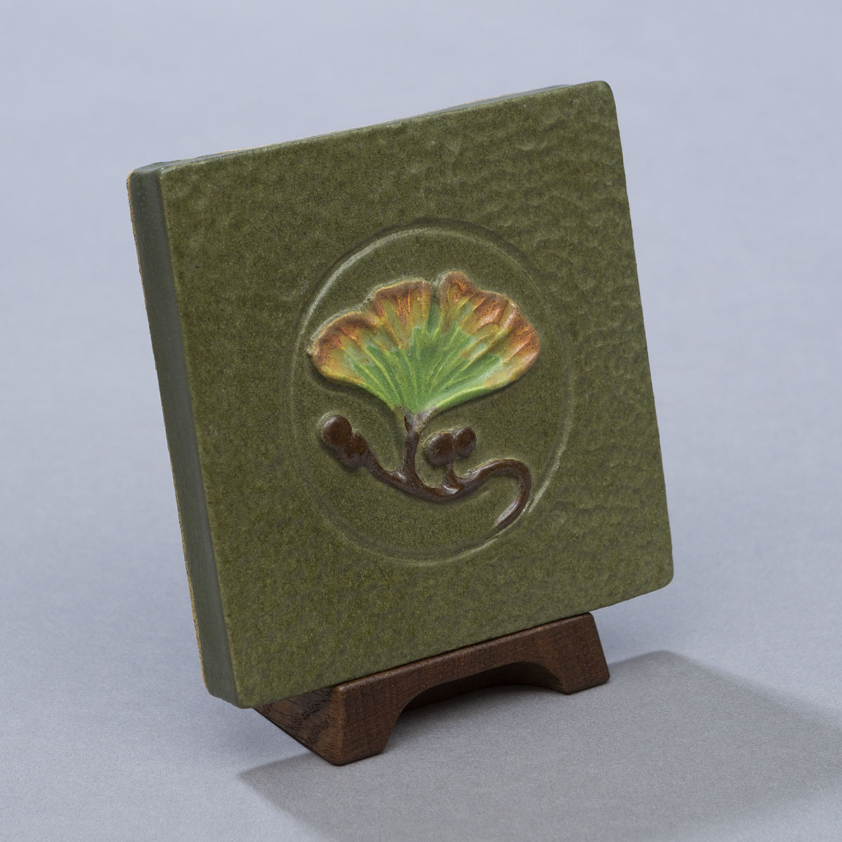 Inspired by our retired three inch Craftsman Ginkgo Tile, this four inch version combines architectural elements borrowed from Arts & Crafts metalwork with a small ginkgo leaf medallion.