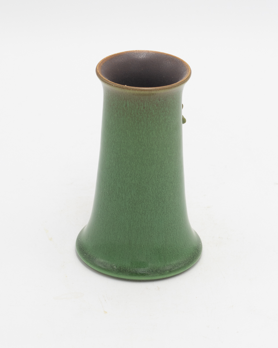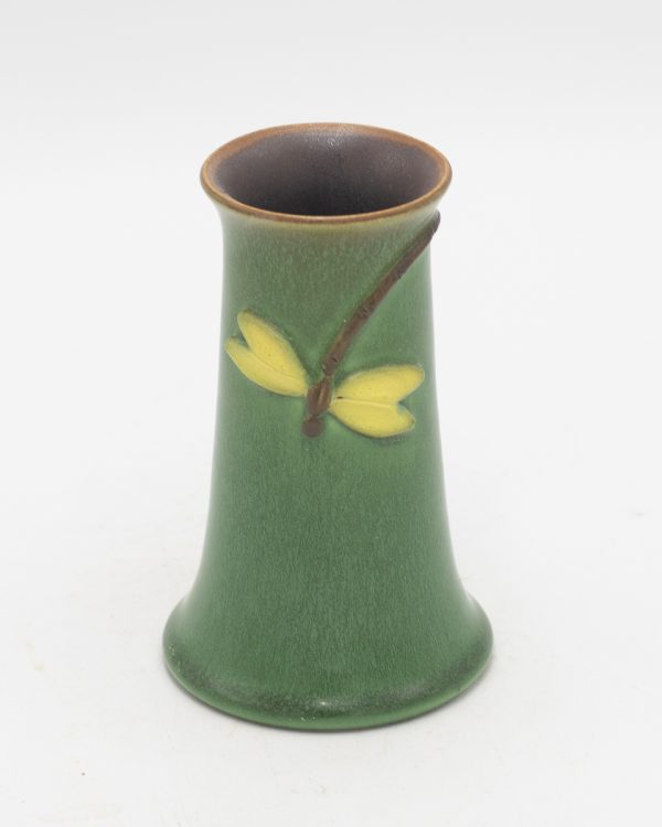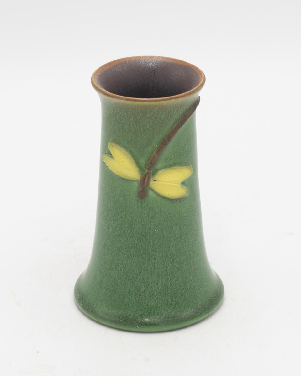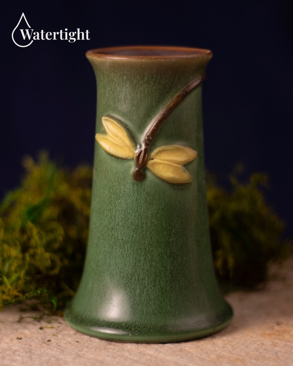 The Meadow Dance Vase captures a fleeting summer moment with a delicate dragonfly rendered in warm tones against our signature green glaze. Its graceful cylinder form welcomes your wildflower bouquets!