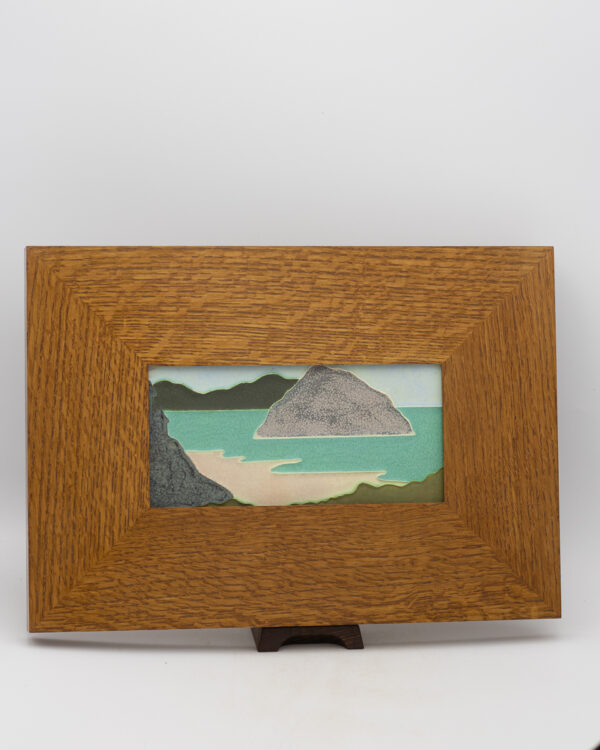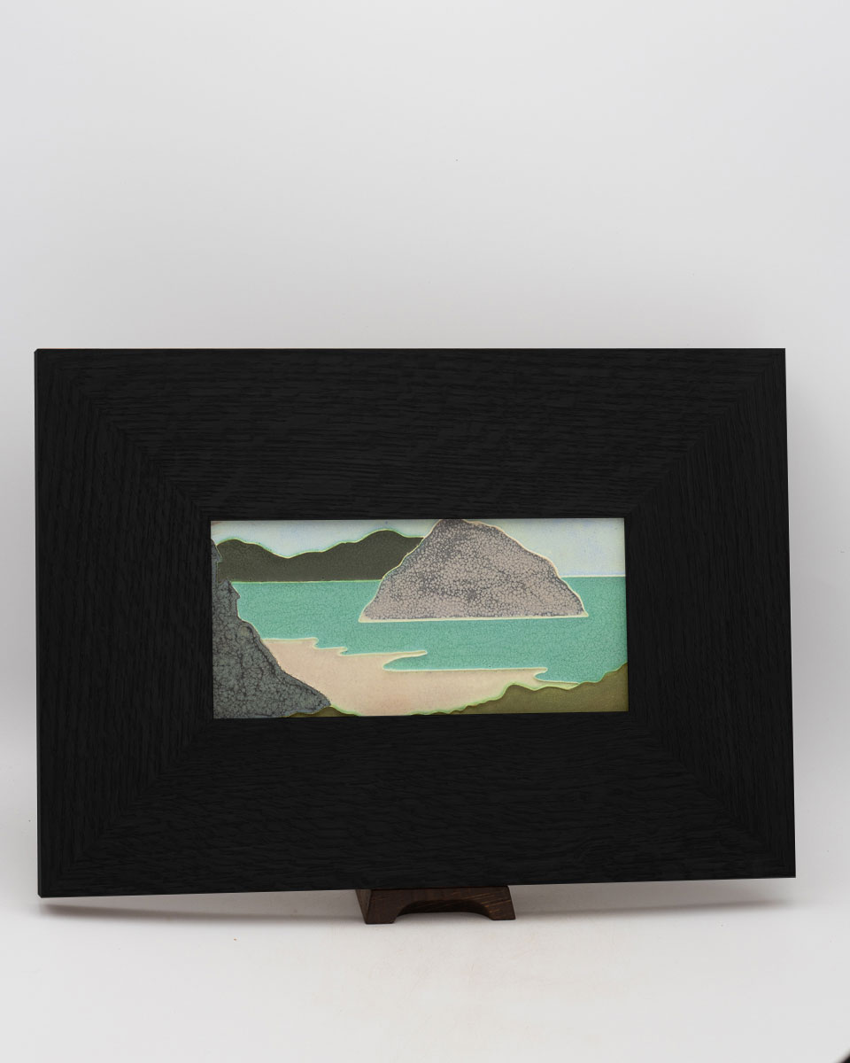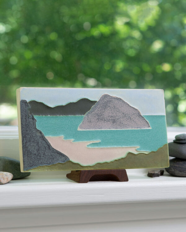Defined by the prominent Morro Rock, a 576 foot high volcanic rock in the harbor, Morro Bay is a quaint town on California’s scenic Central Coast. This tile depicts Morro Rock, the coastline, and the silhouetted architecture of the small harbor town located a short drive from our West Coast Gallery.