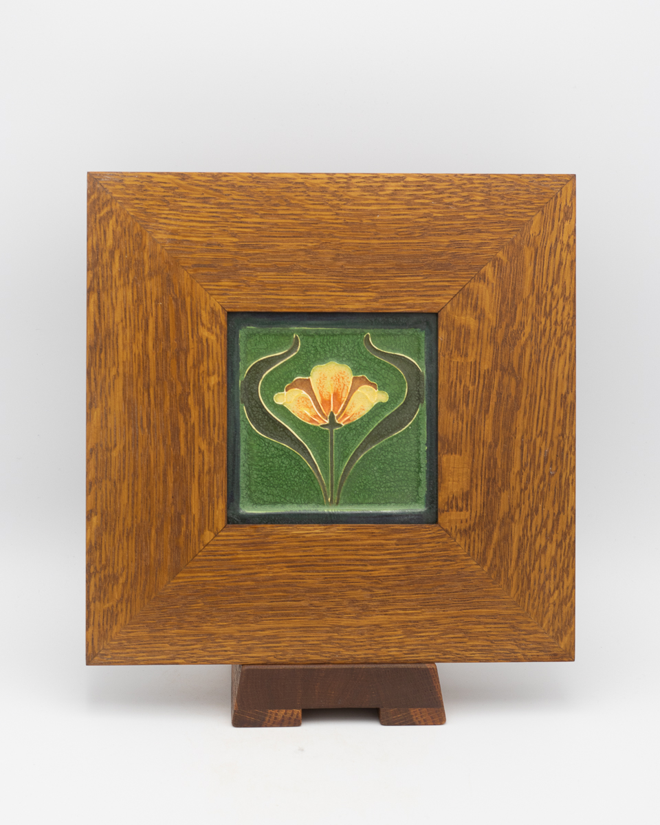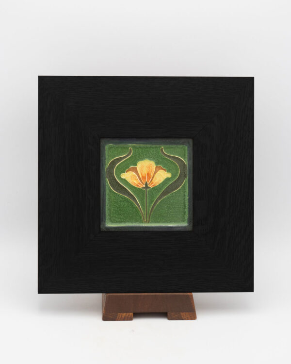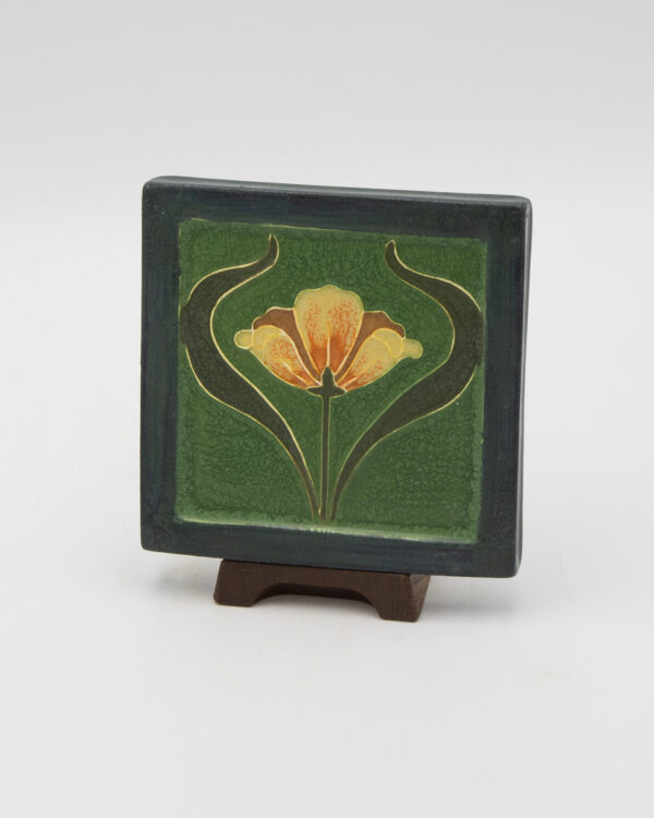 A single California poppy blooms within sinuous curves that frame and echo its natural beauty. The flower’s warm orange petals glow upon a deep green background, as delicate golden lines trace the flowing composition. This work captures both the poppy’s simple beauty and its inherent grace.