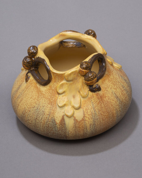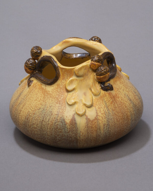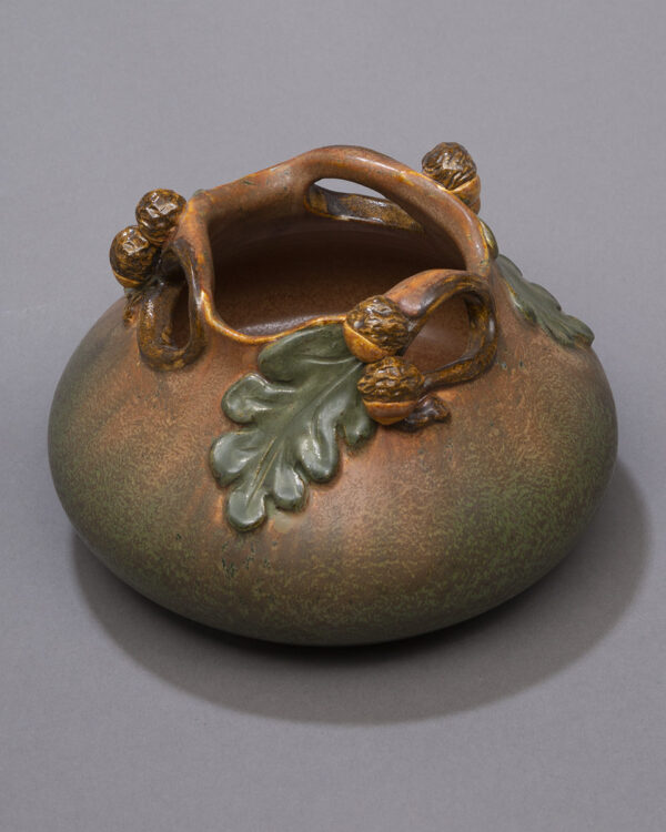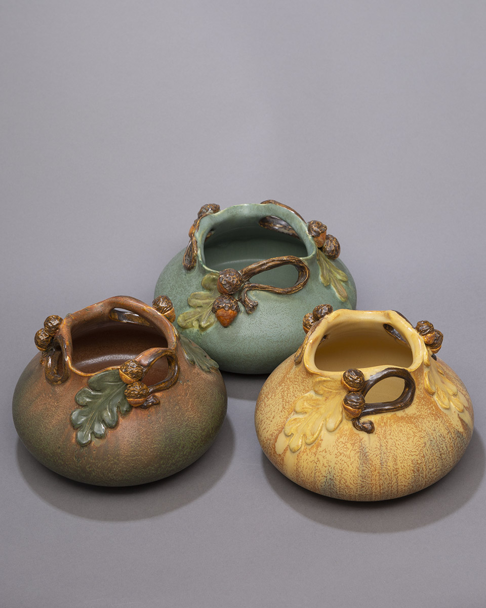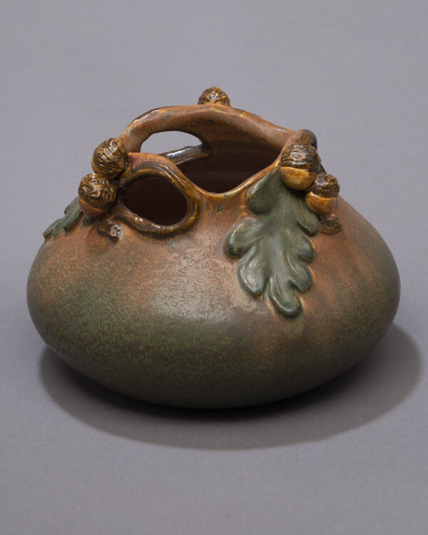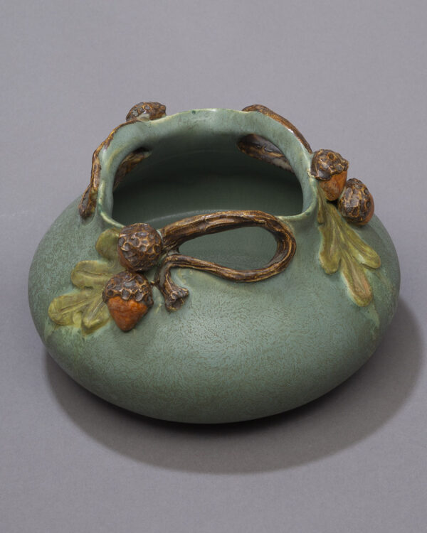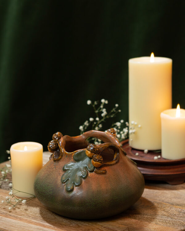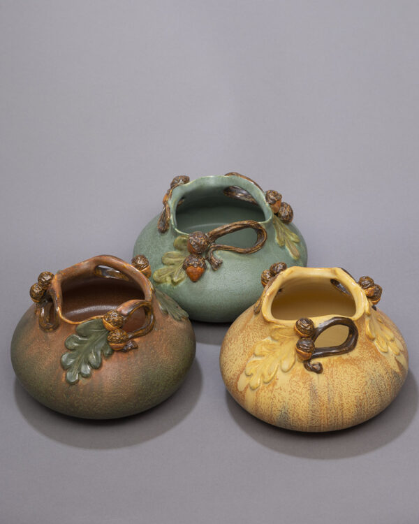 We designed the Oak Branch Bowl in the style of our popular, retired Gingko Branch and Pine Branch Vases. These three designs feature arboreal motifs that wrap around the rim, forming branch handles to create a sculptural piece. The twining design combined with our flowing, blended glazes, means each of these pieces is truly an original work of art.