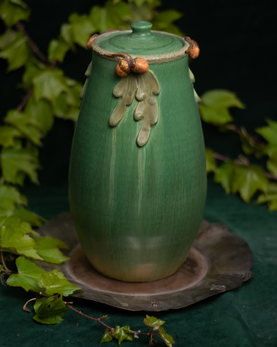 Oak leaves and acorns cascade gracefully down this forest green vessel, their sculptural forms alive with woodland memory. Rich brown acorns nestle at the rim, promising renewal with quiet certainty. The slender, elegant silhouette rises with purposeful dignity, embodying the strength and patience of the ancient oak.