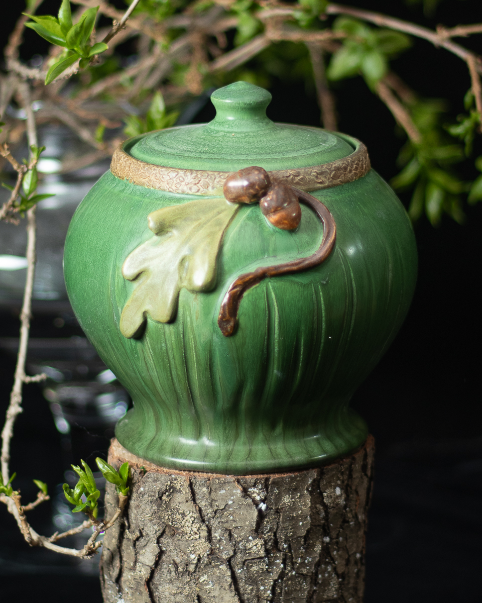 Oak leaves and acorns rest at the rim of this verdant green vessel, their hand-sculpted forms capturing forest wisdom in clay and glaze. Warm brown embellishments encircle the rim, while the flowing green glaze beneath suggests gentle movement. This intimate piece honors the ancient oak’s legacy—offering both beauty and reverence in a form that celebrates life’s quiet dignity.