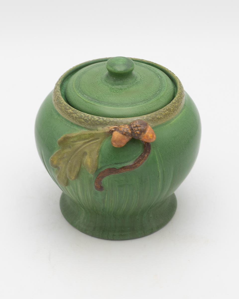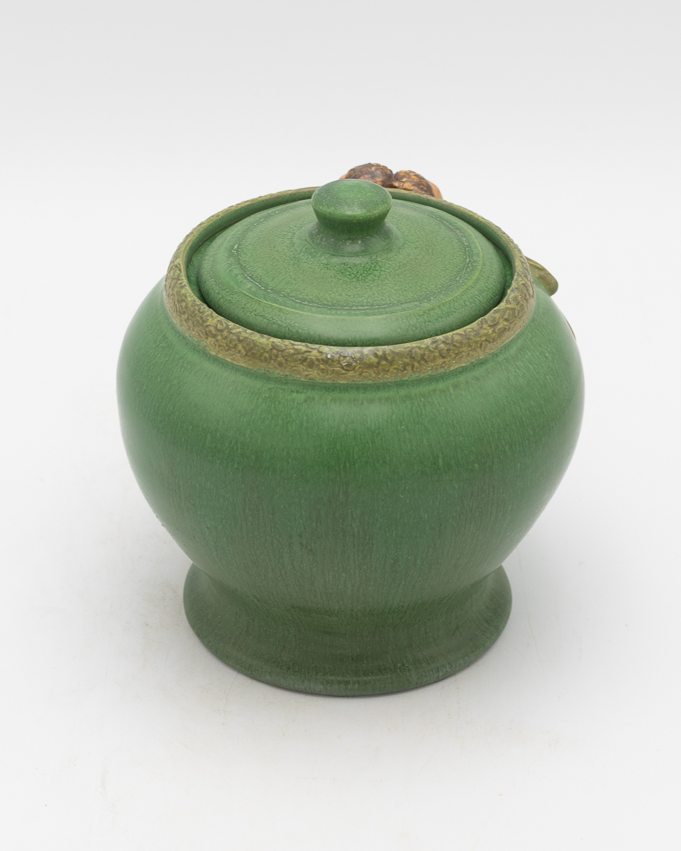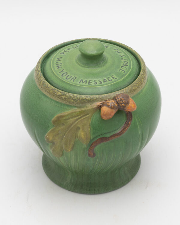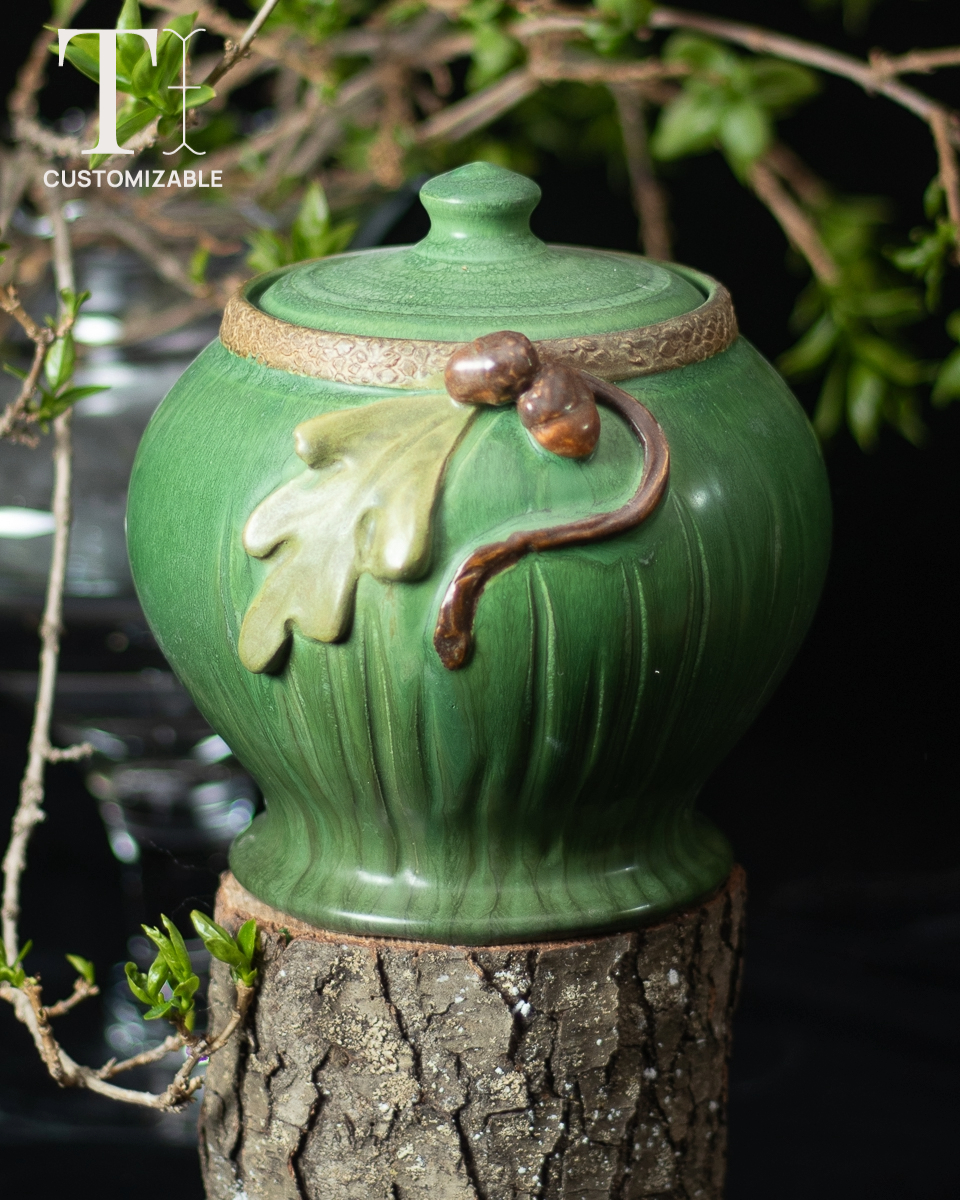 Oak leaves and acorns rest at the rim of this verdant green vessel, their hand-sculpted forms capturing forest wisdom in clay and glaze. Warm brown embellishments encircle the rim, while the flowing green glaze beneath suggests gentle movement. This intimate piece honors the ancient oak’s legacy—offering both beauty and reverence in a form that celebrates life’s quiet dignity.