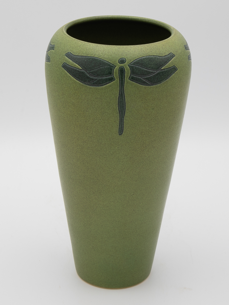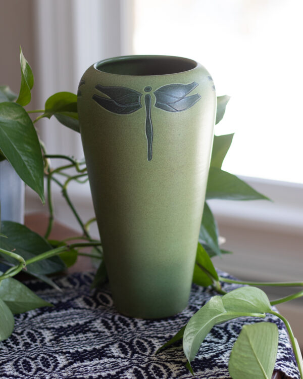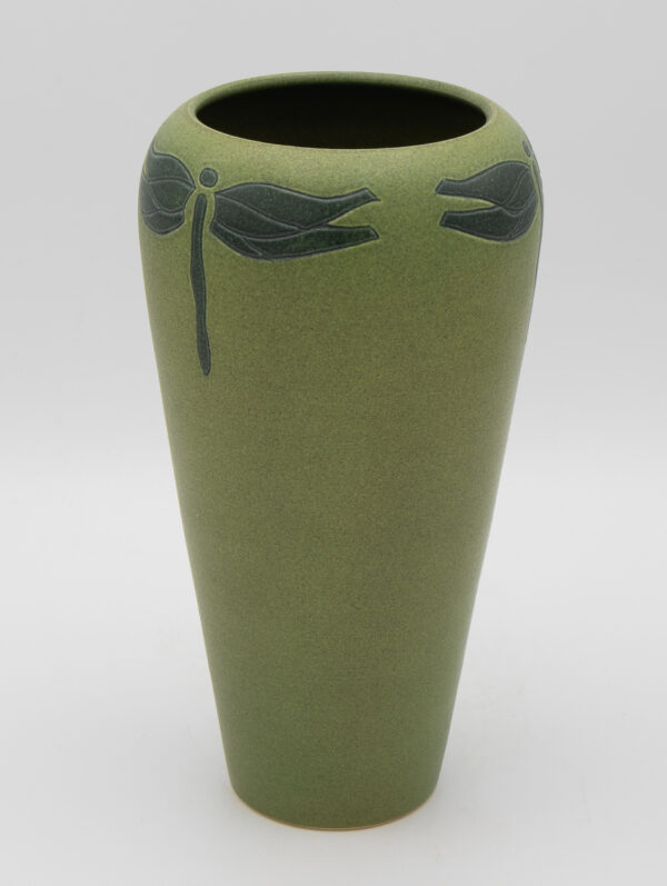 Stylized dragonflies hover within a pristine field of green, their wings captured in perfect reduction. The clean lines and balanced composition embody principles of simplicity and grace. Hand-carved details in contrasting deep green create a striking silhouette on this timeless form.