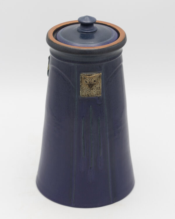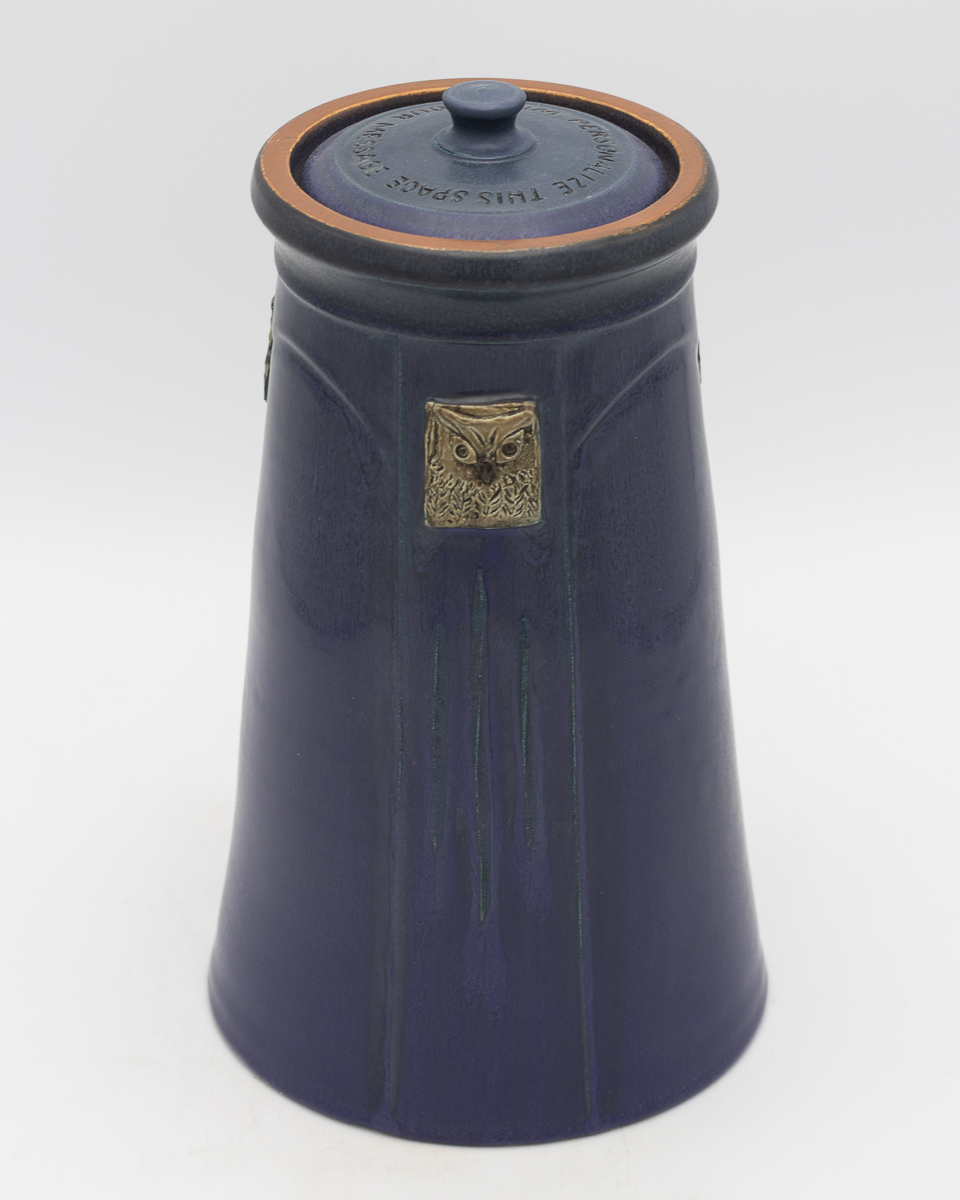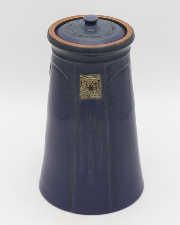 Three watchful owls offer quiet vigilance on this tall, tapered vessel. Subtle vertical impressions frame the guardian bird, creating architectural interest against the rich glaze background. Available in a rich green or deep indigo glaze with earth-toned accents, this dignified form stands as a sentinel of memory—embodying wisdom, protection, and the enduring connection between the seen and unseen worlds.