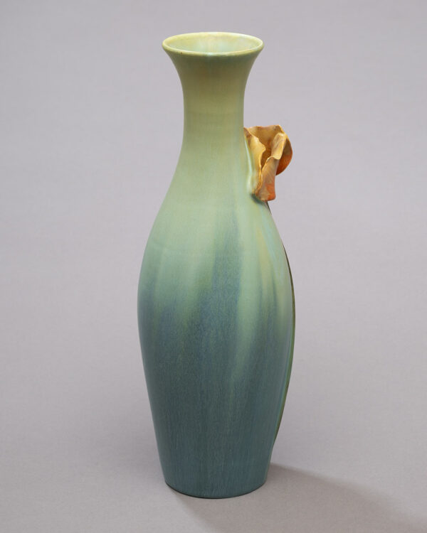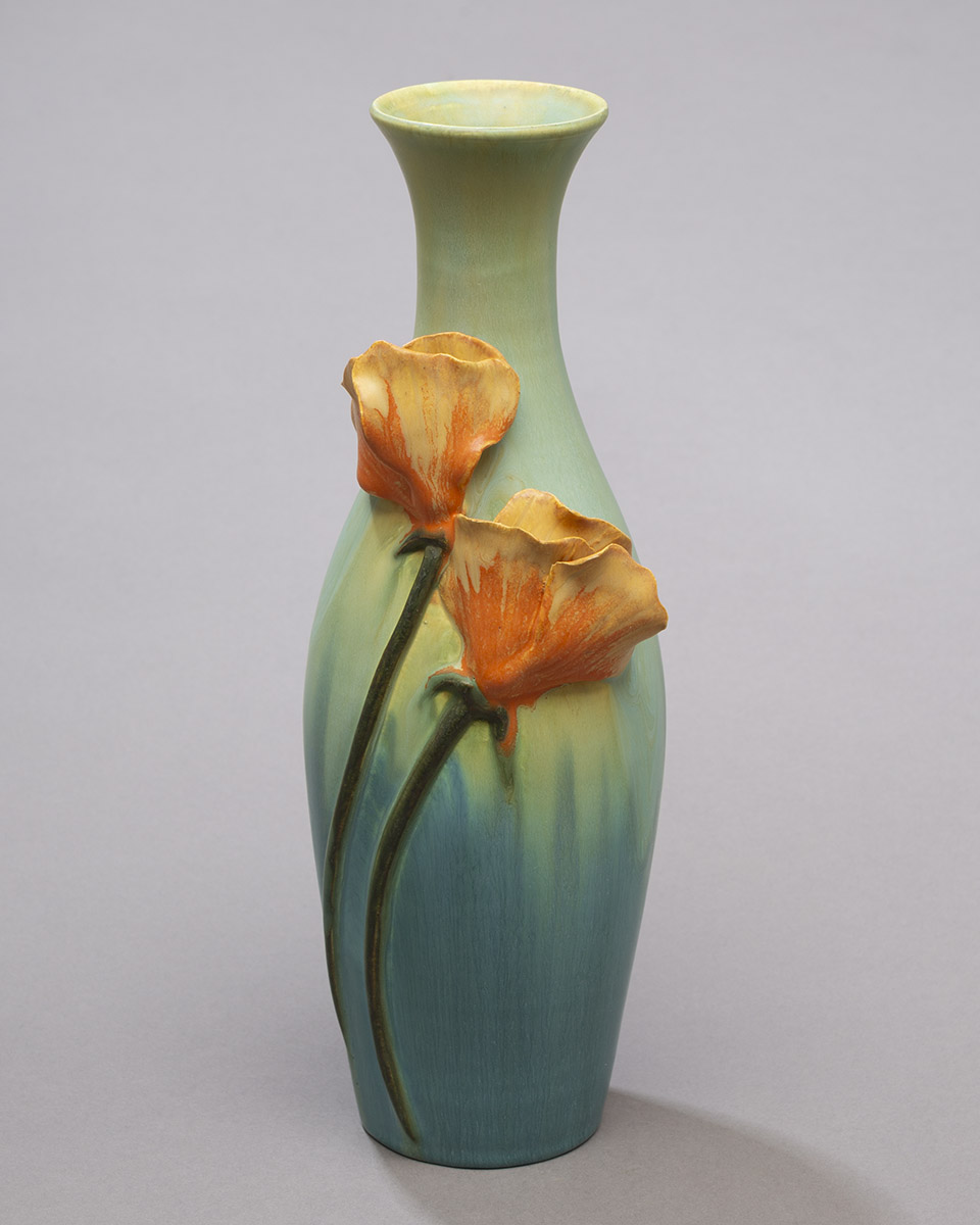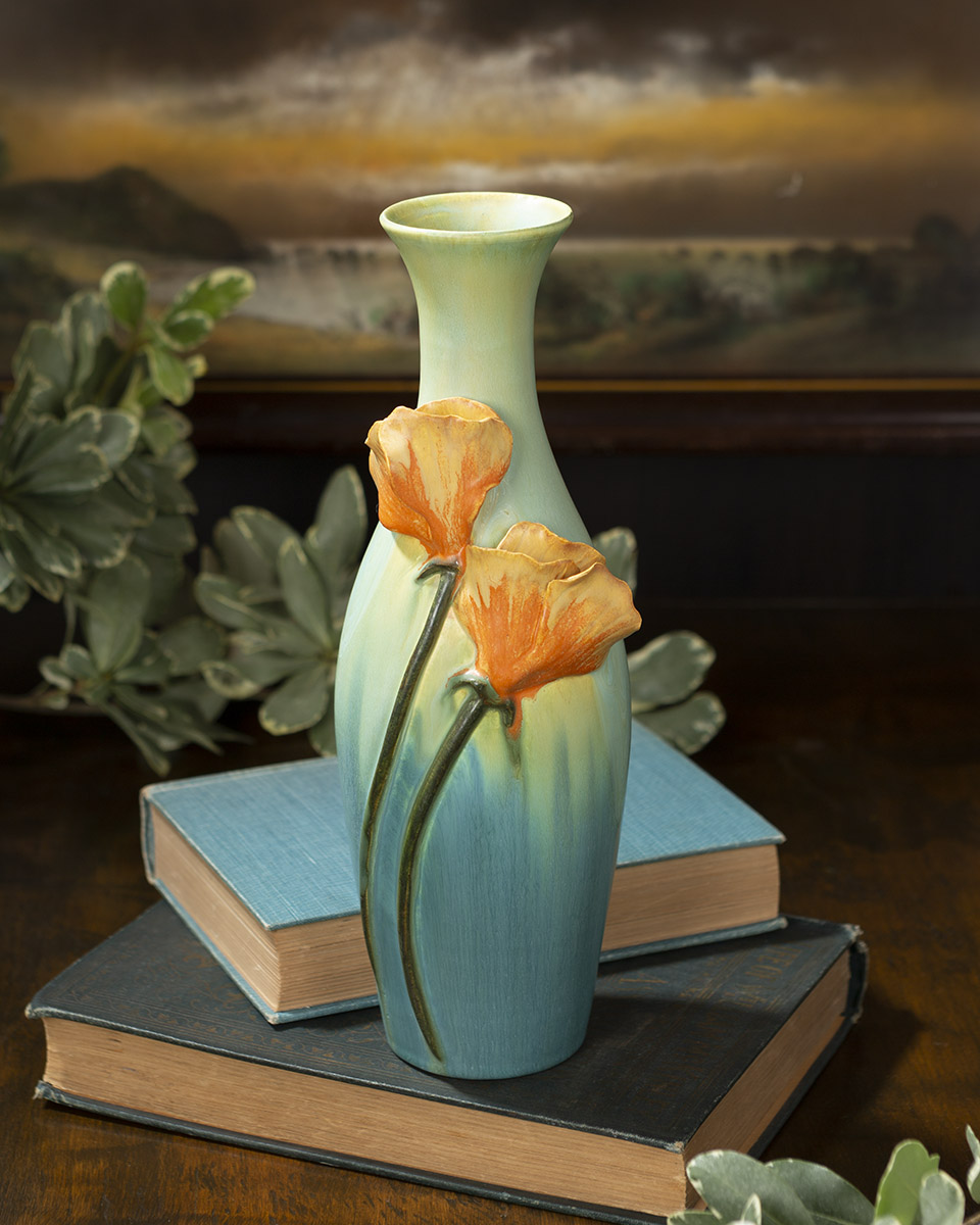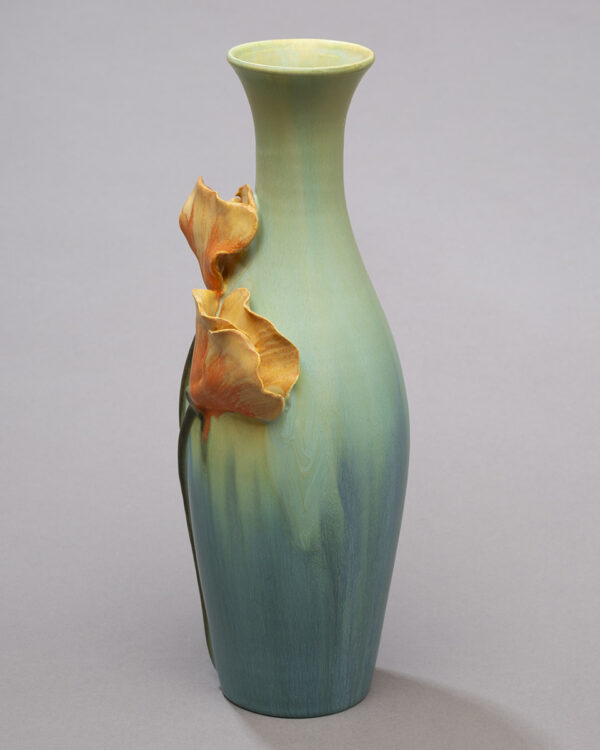 Since opening the Ephraim Pottery West Coast Gallery in 2012, we have become more familiar with the variety of California’s natural beauty, and local customers encouraged us to create a piece featuring their state flower, the California Poppy. Here, golden-edged orange poppies flutter in high relief on the side of a slim bottle glazed in aquamarine tones which evoke the Pacific Ocean.