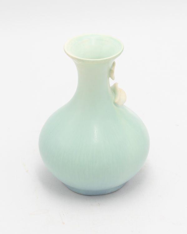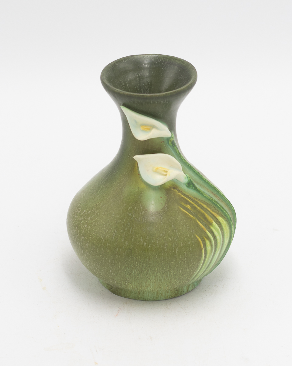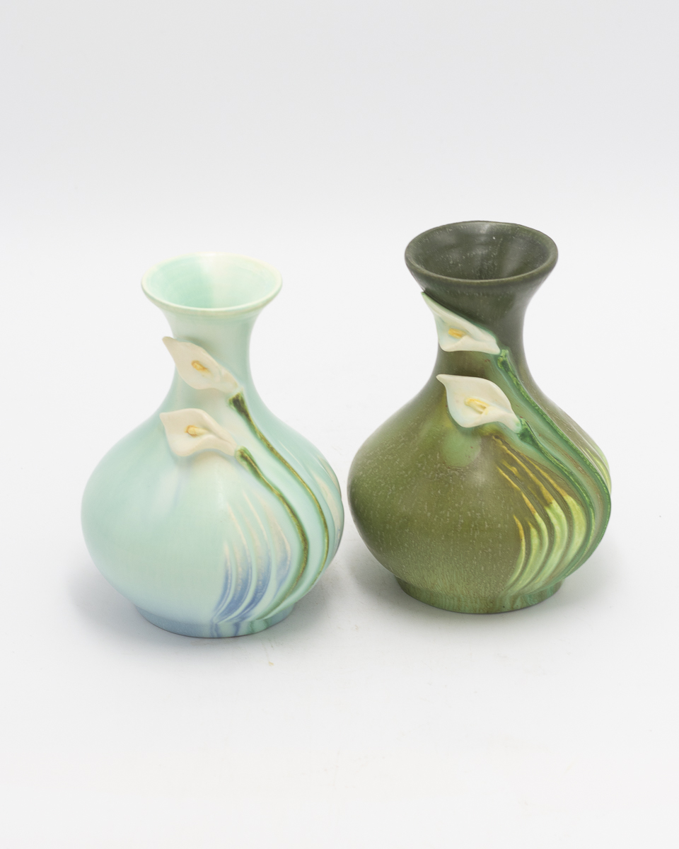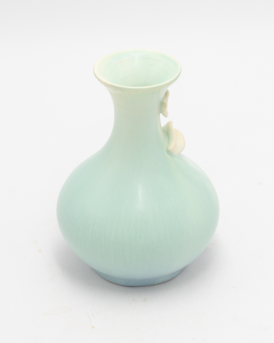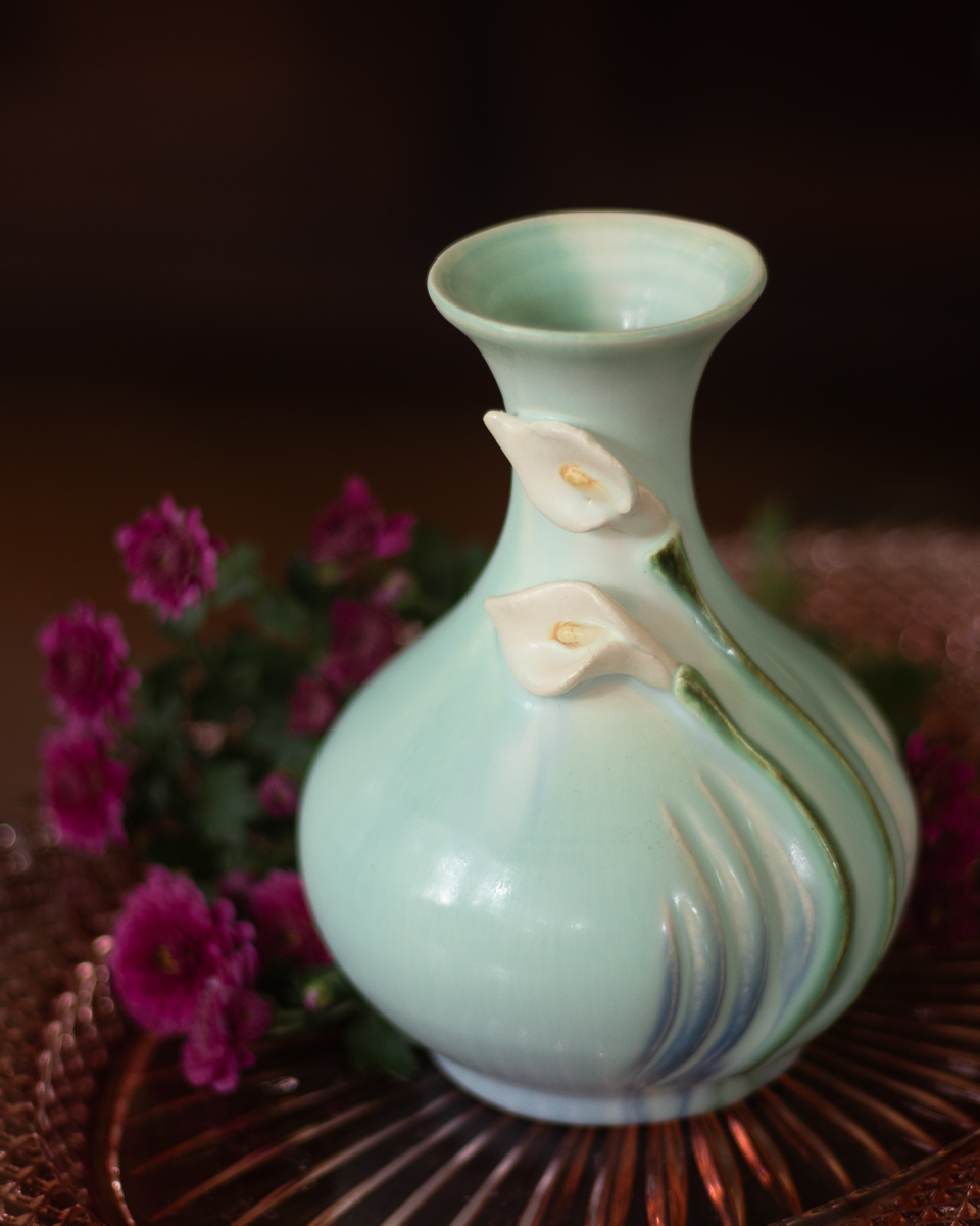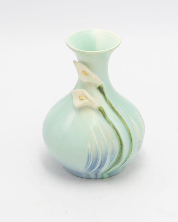 The Peaceful Cabinet Vase celebrates quiet elegance through simplified, organic forms. This beautifully proportioned piece features a bulbous body with deeply carved, flowing lines that echo natural growth patterns, crowned with a gently flared rim and adorned with hand-sculpted calla lily blooms in high relief. Available in two complementary glaze combinations—one in soft aqua, the other in olive green—this vase embodies the serene symbolism of the calla lily: peace, purity, and grace. The compact size makes it ideal for cabinet displays or intimate arrangements where simplicity speaks volumes.