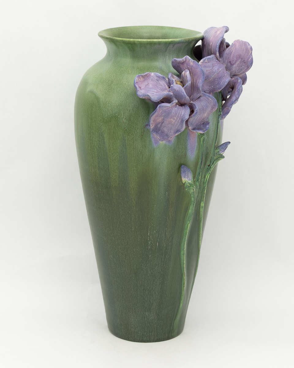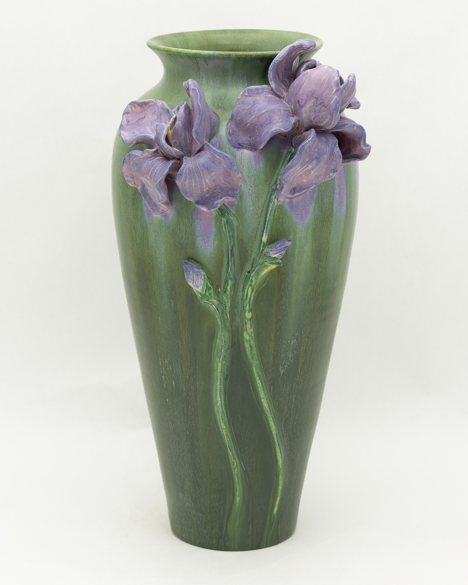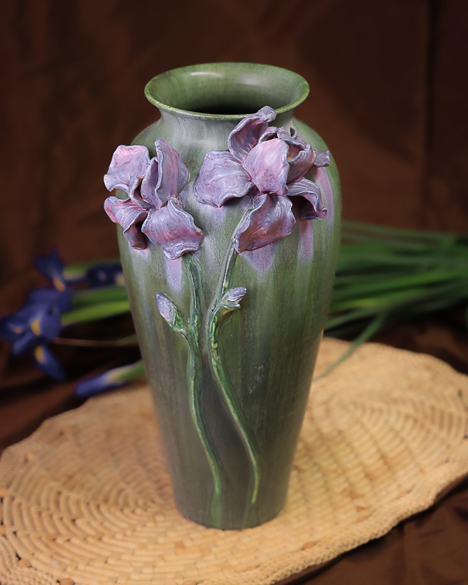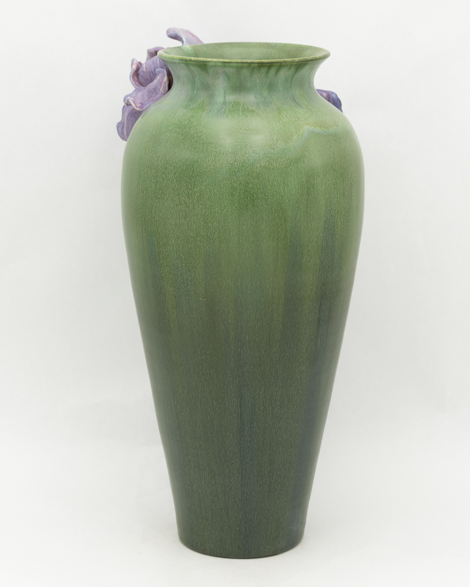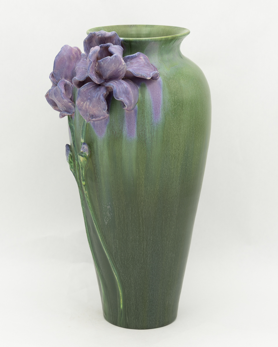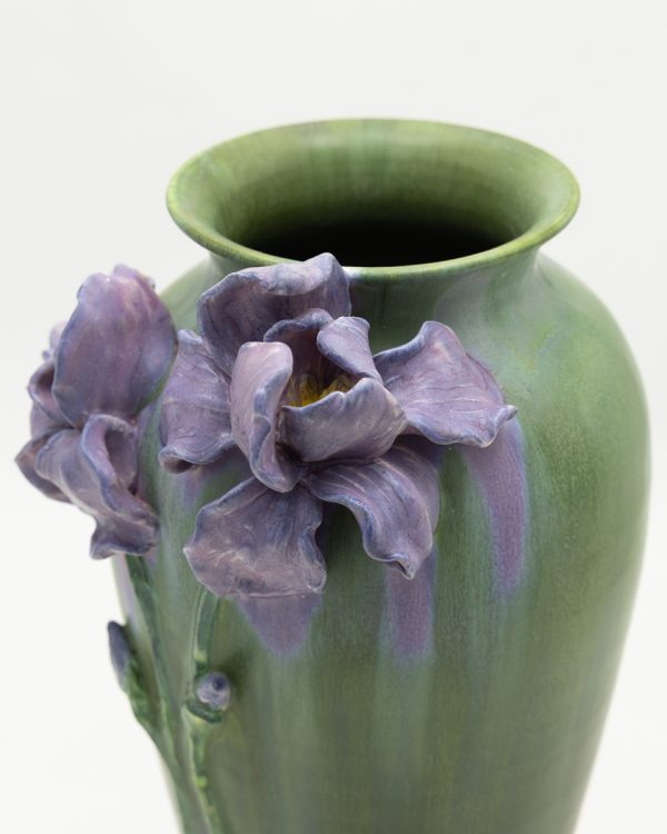 Bold, high-relief sculpture is a signature of our studio, and few motifs showcase this better than the iris. Collectors may recall “Laura’s Vase” — our celebrated 2015 design featuring dramatic iris sculpture that became an instant favorite. The Perennial Iris Vase revisits that beloved inspiration in a striking new form, this time rendered in rich purple and violet tones that showcase our evolving glaze mastery. Two irises rise on graceful stems, their ruffled petals sculpted individually by hand with expressive dimensionality. Set against a flowing matte green glaze, the blooms command attention on this tall, elegant form. Like the flower itself, some inspirations return season after season — each time revealing something new.