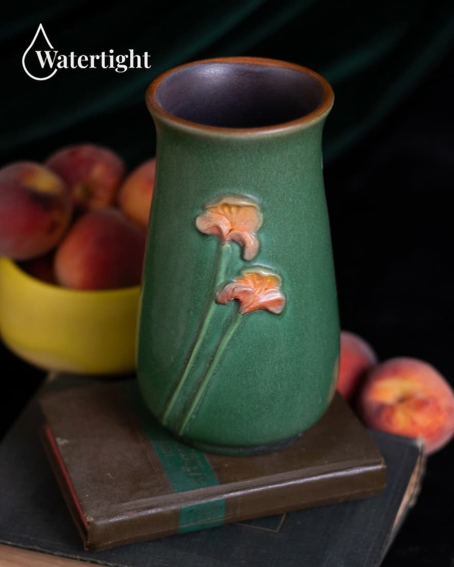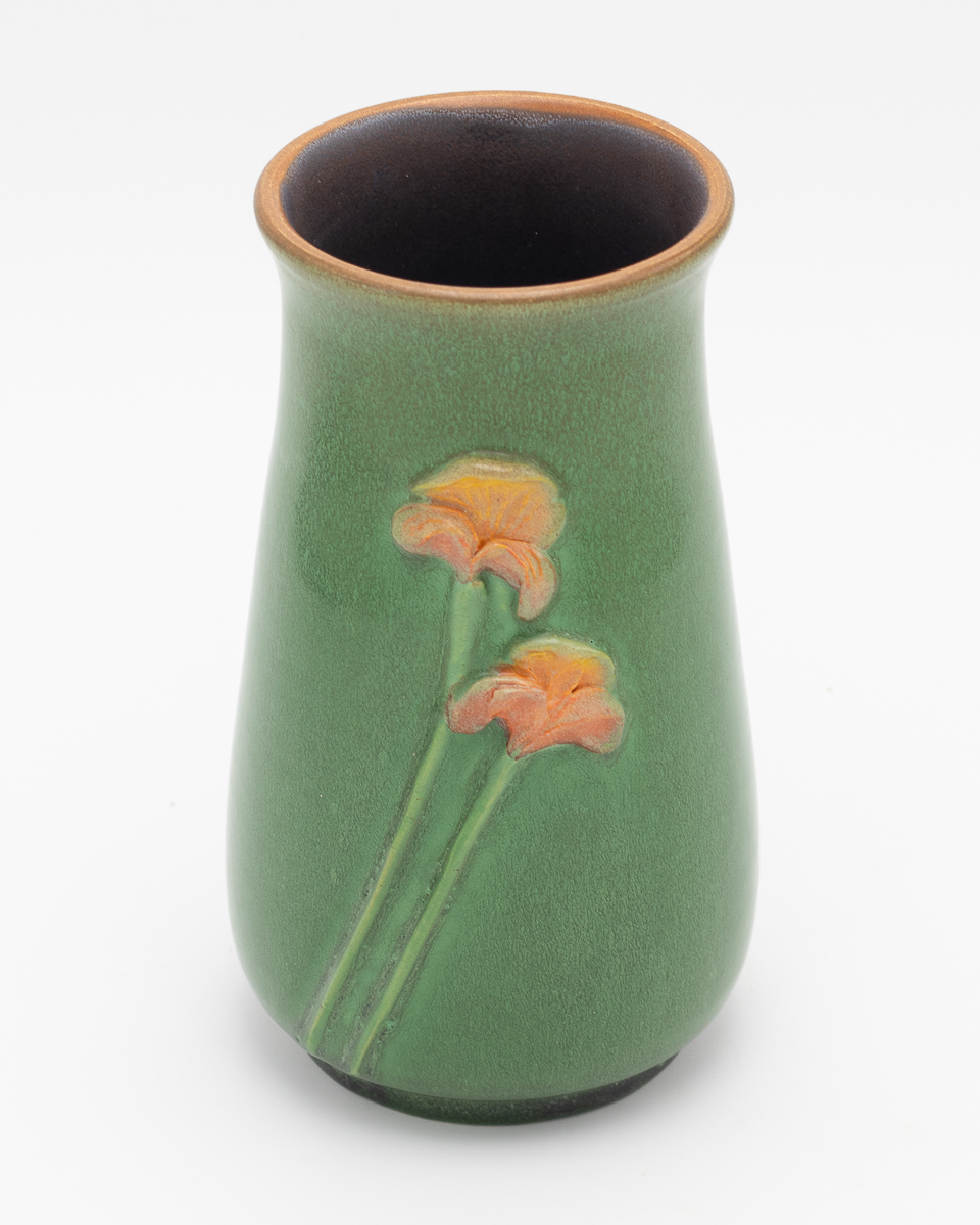Celebrating the vibrant beauty of California poppies, this piece features low relief sculptural florals in coral and peach balanced with deep oranges against a rich jade green background. The classic vase form provides generous space for fresh arrangements while serving as a standalone work of art.