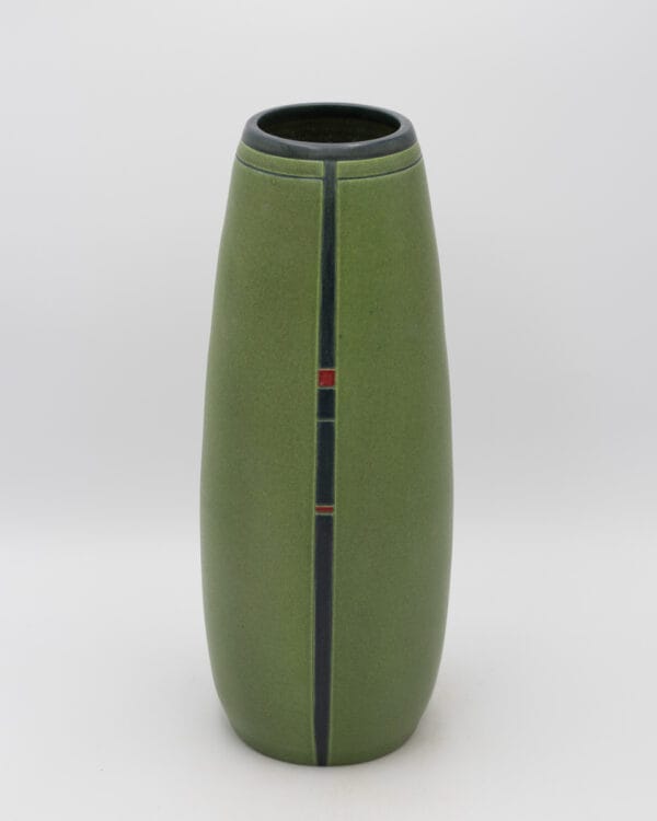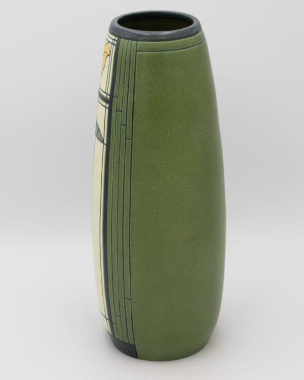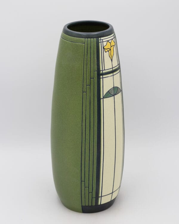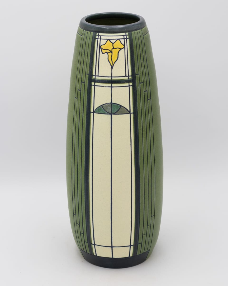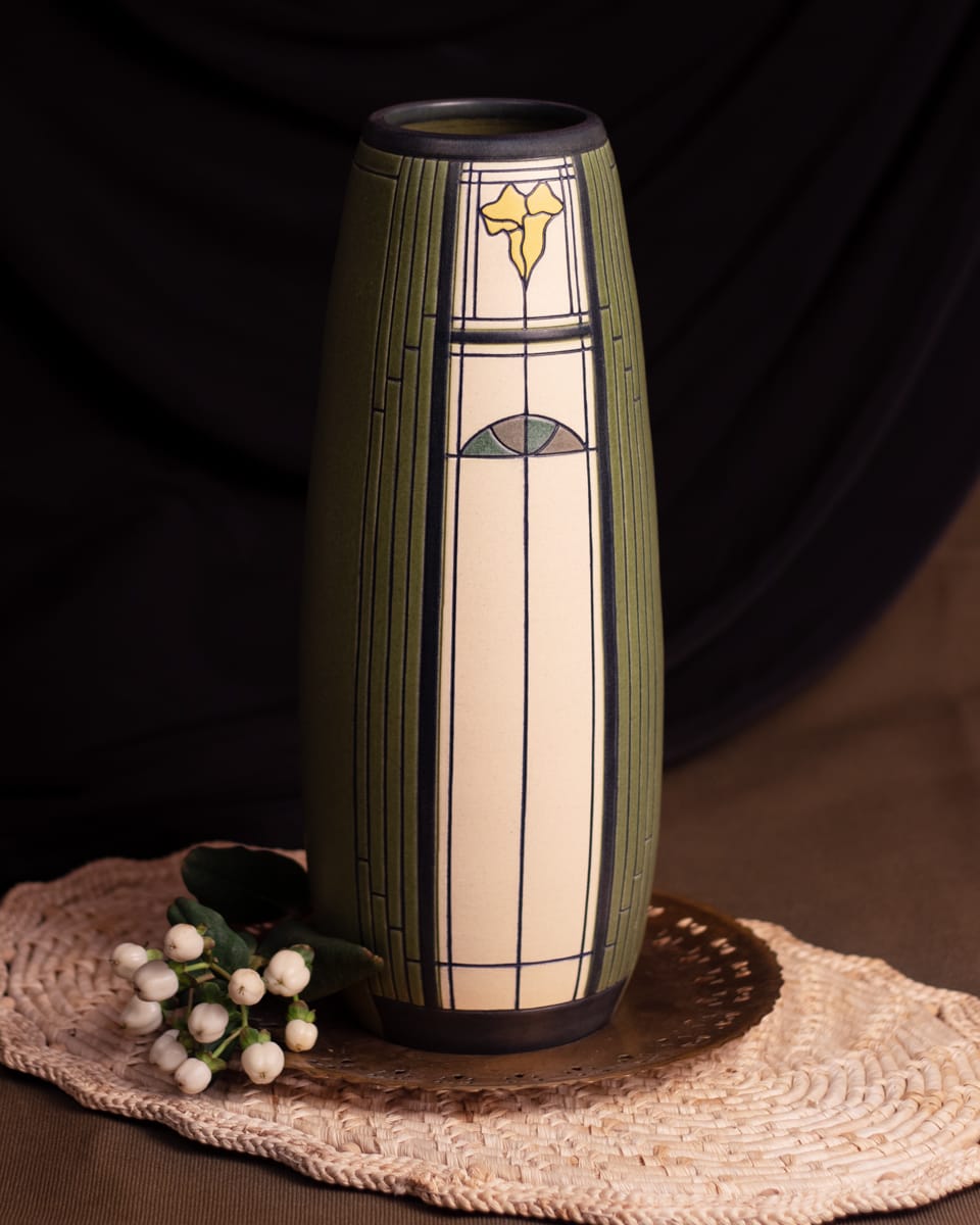 The Prairie Light Vase pairs a rising Arts & Crafts form with bold, confident hand-carving. Inspired by Frank Lloyd Wright architecture and Prairie School stained glass, this design features a yellow poppy, framed by parallel black lines. Glaze scheme and design work together to evoke a leaded window. This piece is a must have for the serious Arts & Crafts collector.