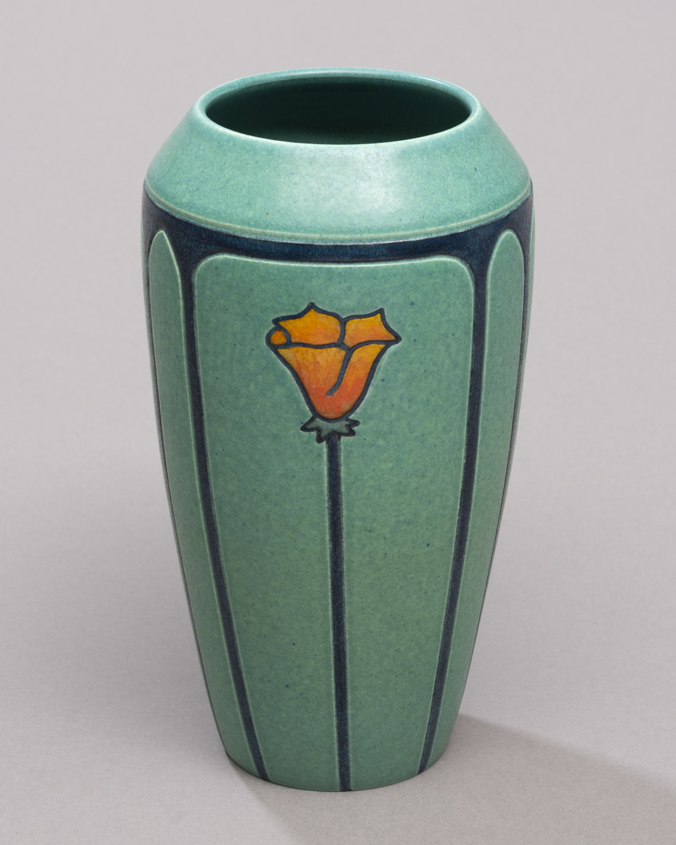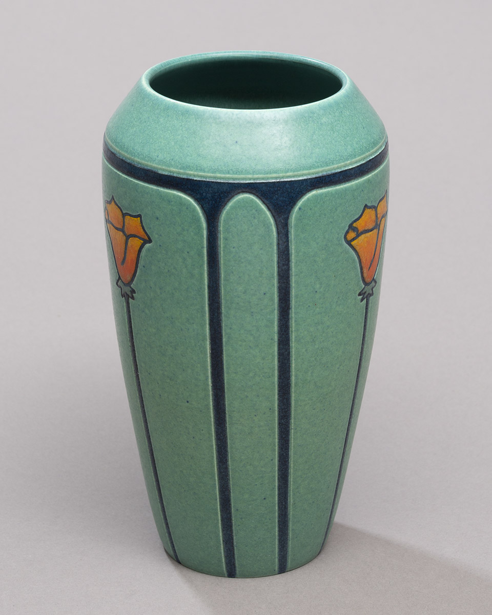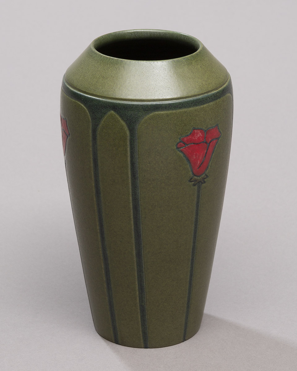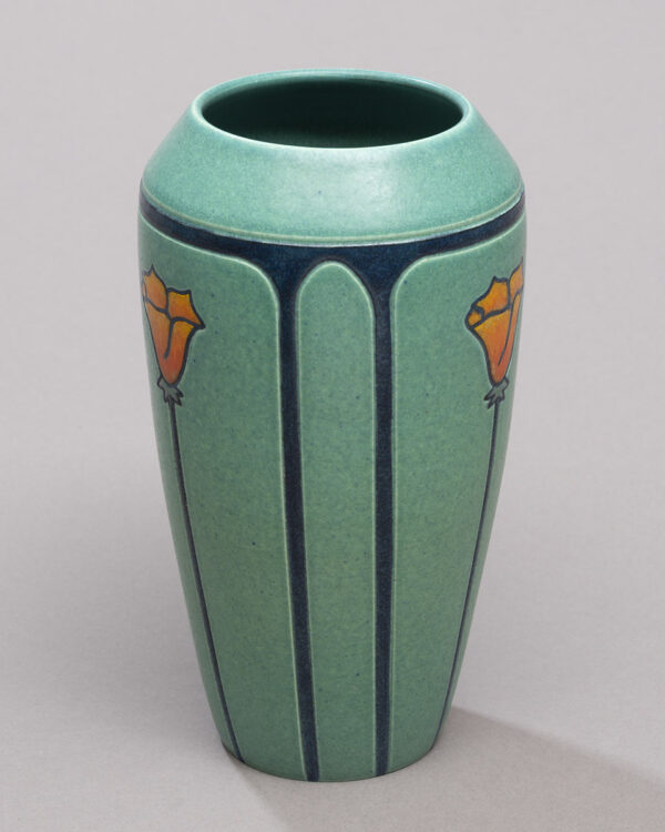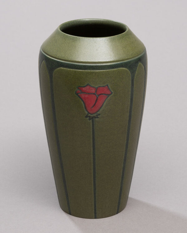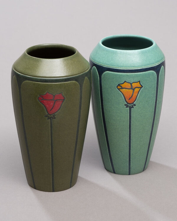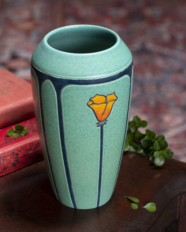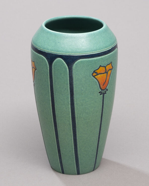 This elegant poppy design adds to our growing Rhythm Line. The pieces in this collection forego traditional sculptural elements in favor of streamlined forms, artistic abstractions, and incised, patterned black linework reminiscent of a musical staff. The Regency Poppy Vase channels graceful 1920’s Deco style to represent the state flower of California—the California Poppy.