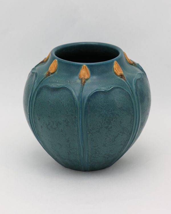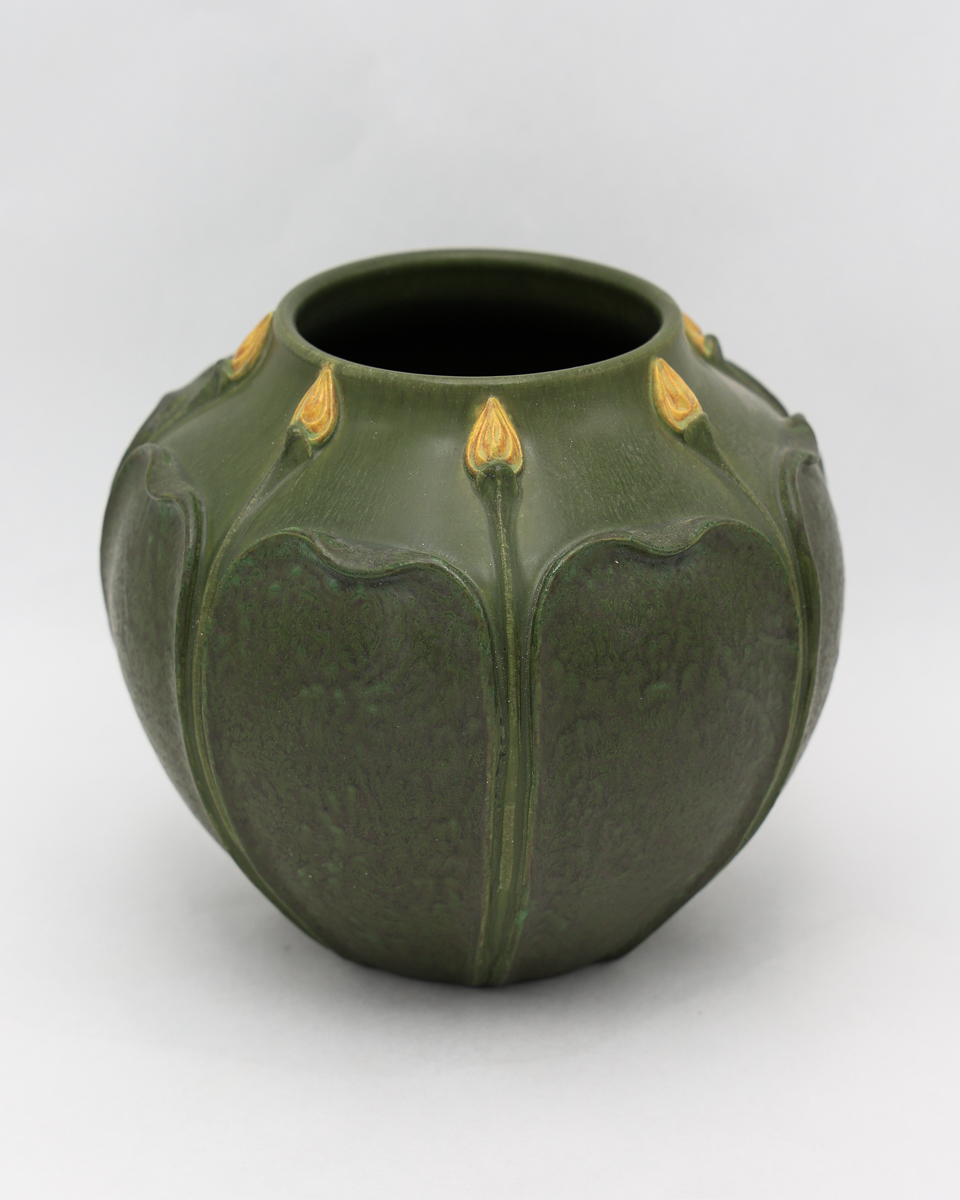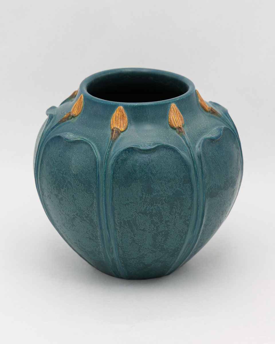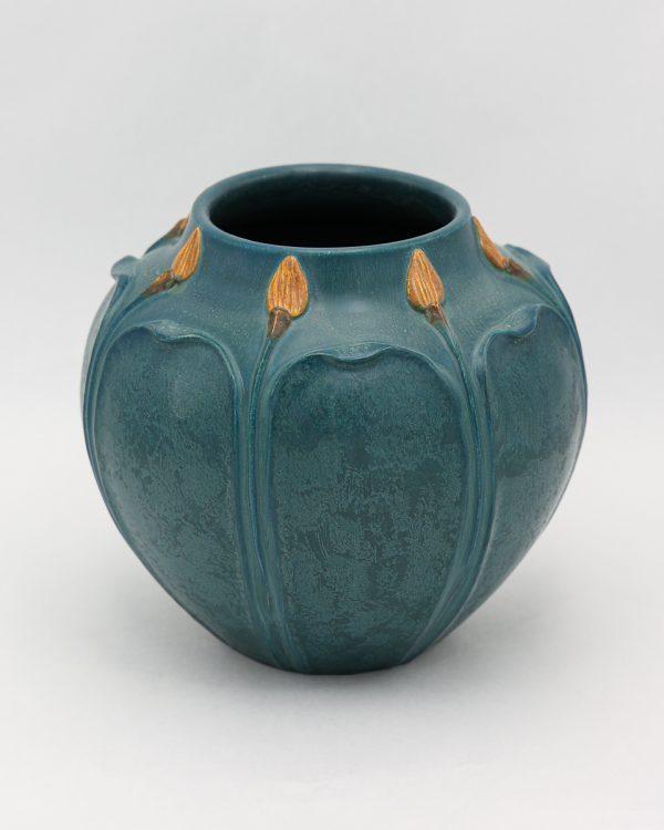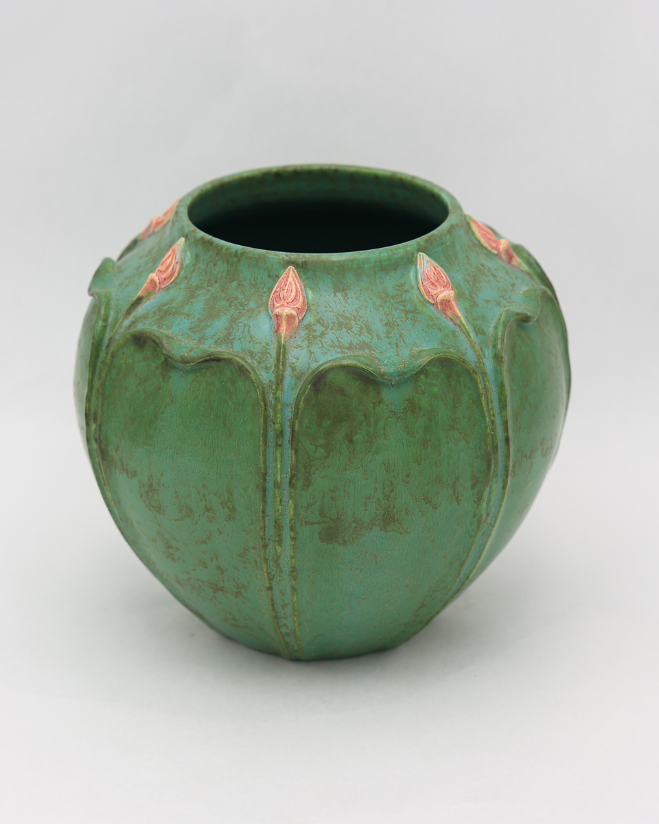 Broad, sculpted leaves rise from the base to cradle this rounded form, each one crowned by a simple budding flower at the shoulder. The Reverie Vase draws inspiration from the historic Grueby Faience Pottery, whose organic forms, low-relief leaf-and-bud sculpture, and signature matte glazes have influenced our studio since its founding. Offered in five of our house-developed glazes, each colorway brings a distinct character to this classic design — a fitting tribute as we celebrate thirty years of honoring and building on the Arts & Crafts tradition.