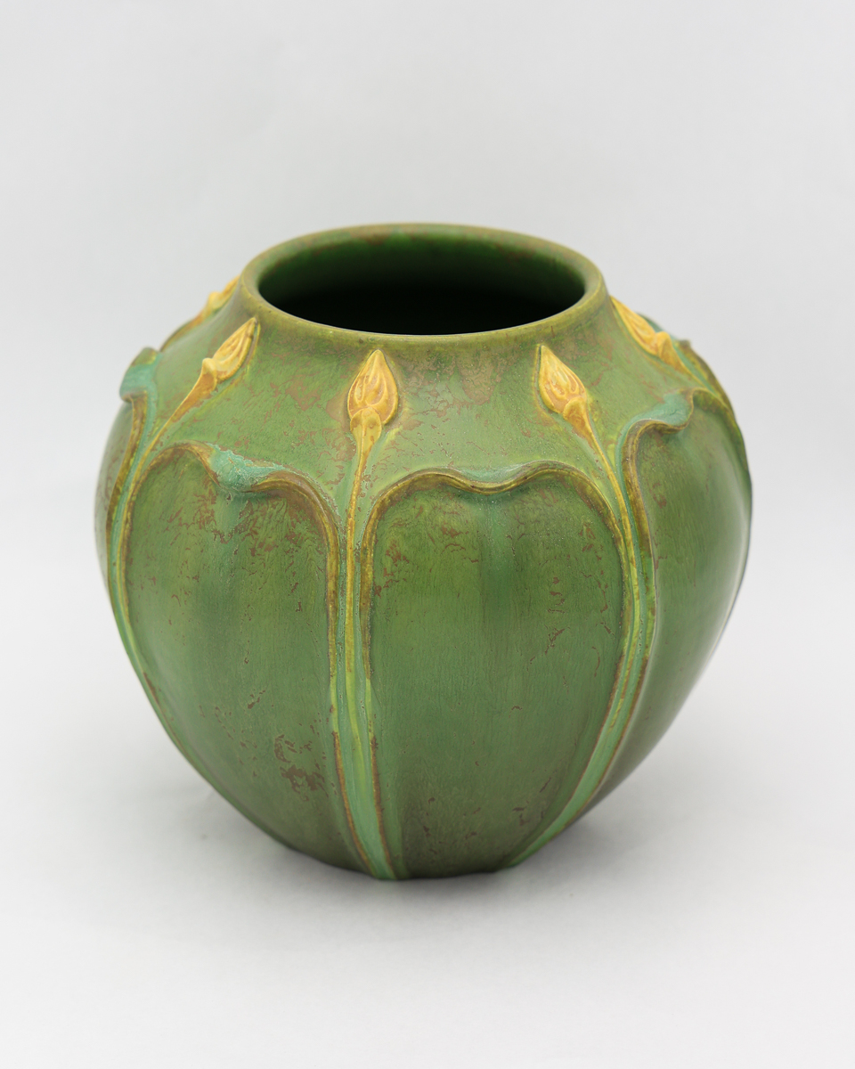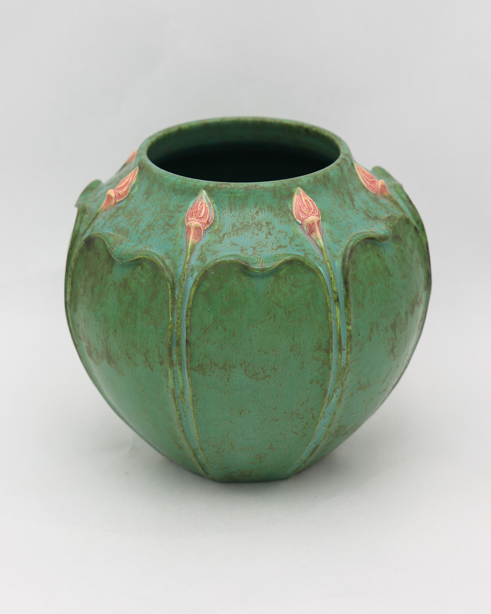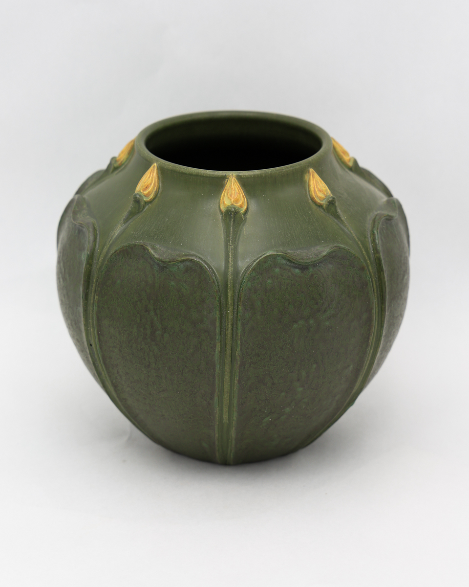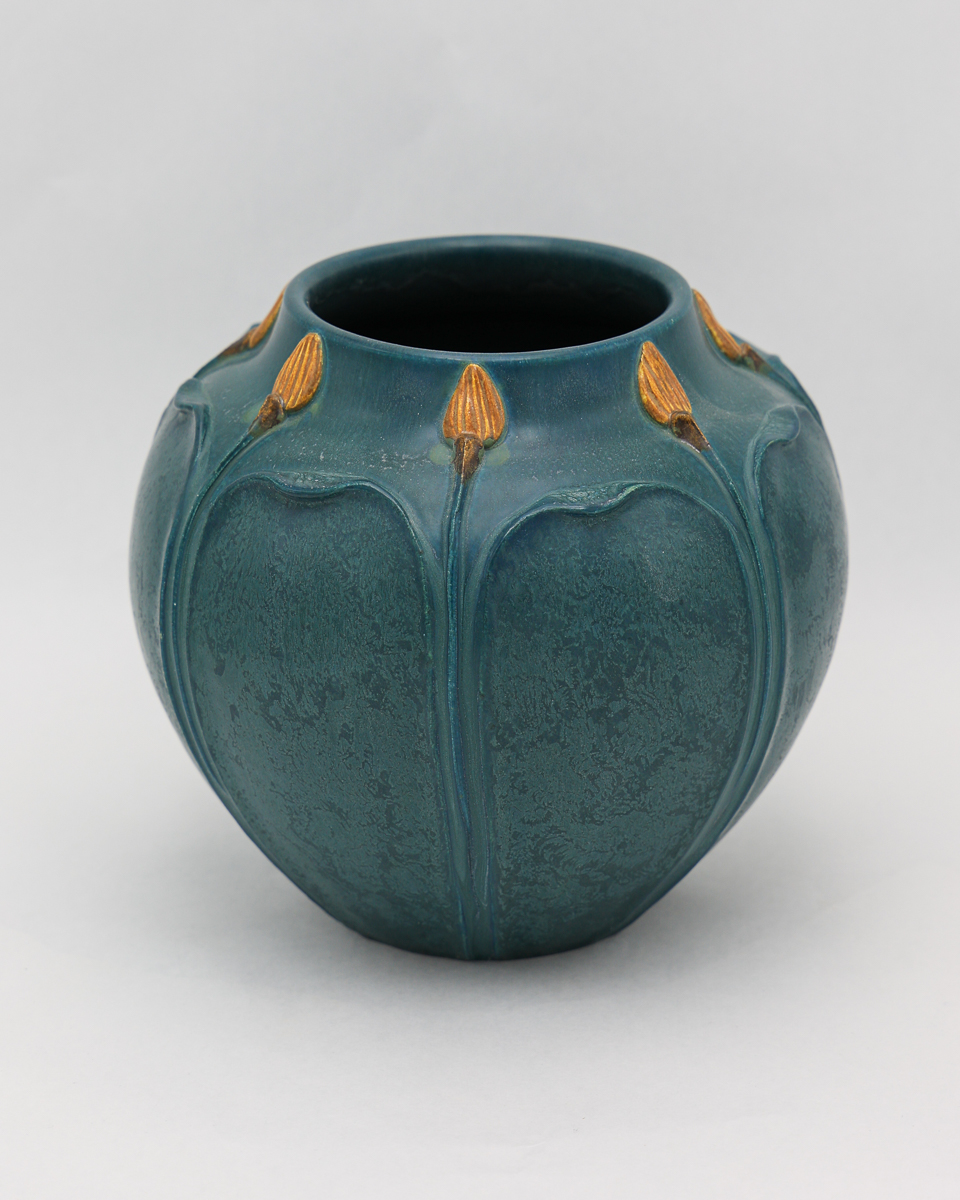 Broad, sculpted leaves rise from the base to cradle this rounded form, each one crowned by a simple budding flower at the shoulder. The Reverie Vase draws inspiration from the historic Grueby Faience Pottery, whose organic forms, low-relief leaf-and-bud sculpture, and signature matte glazes have influenced our studio since its founding. Offered in five of our house-developed glazes, each colorway brings a distinct character to this classic design — a fitting tribute as we celebrate thirty years of honoring and building on the Arts & Crafts tradition.