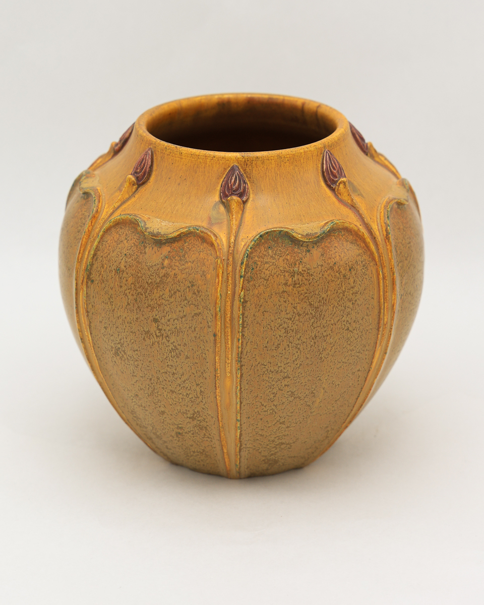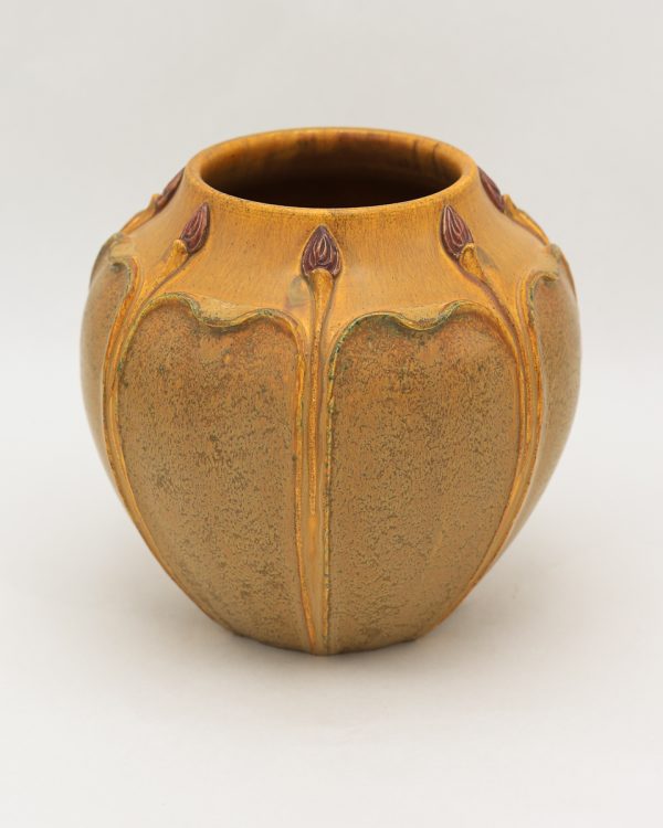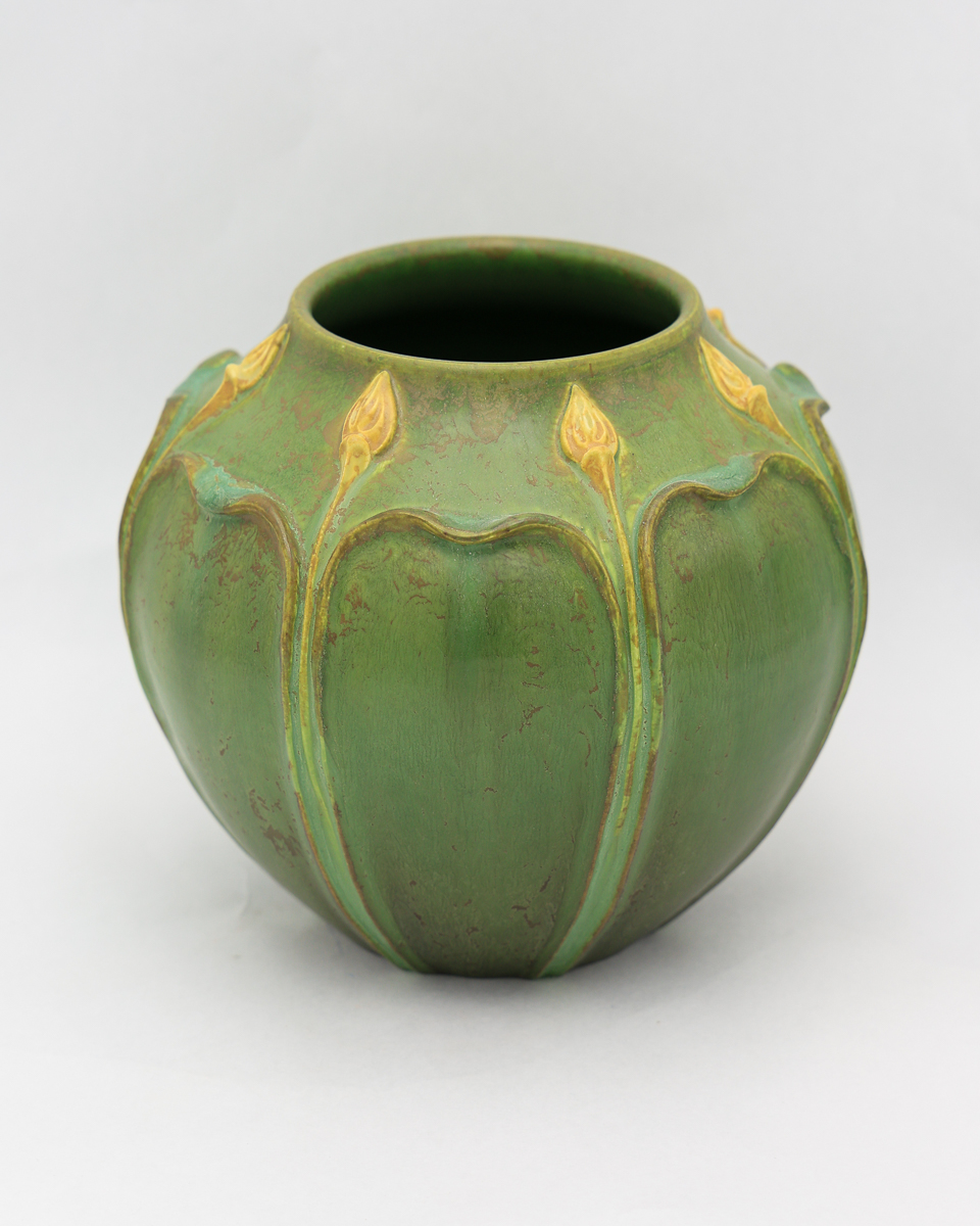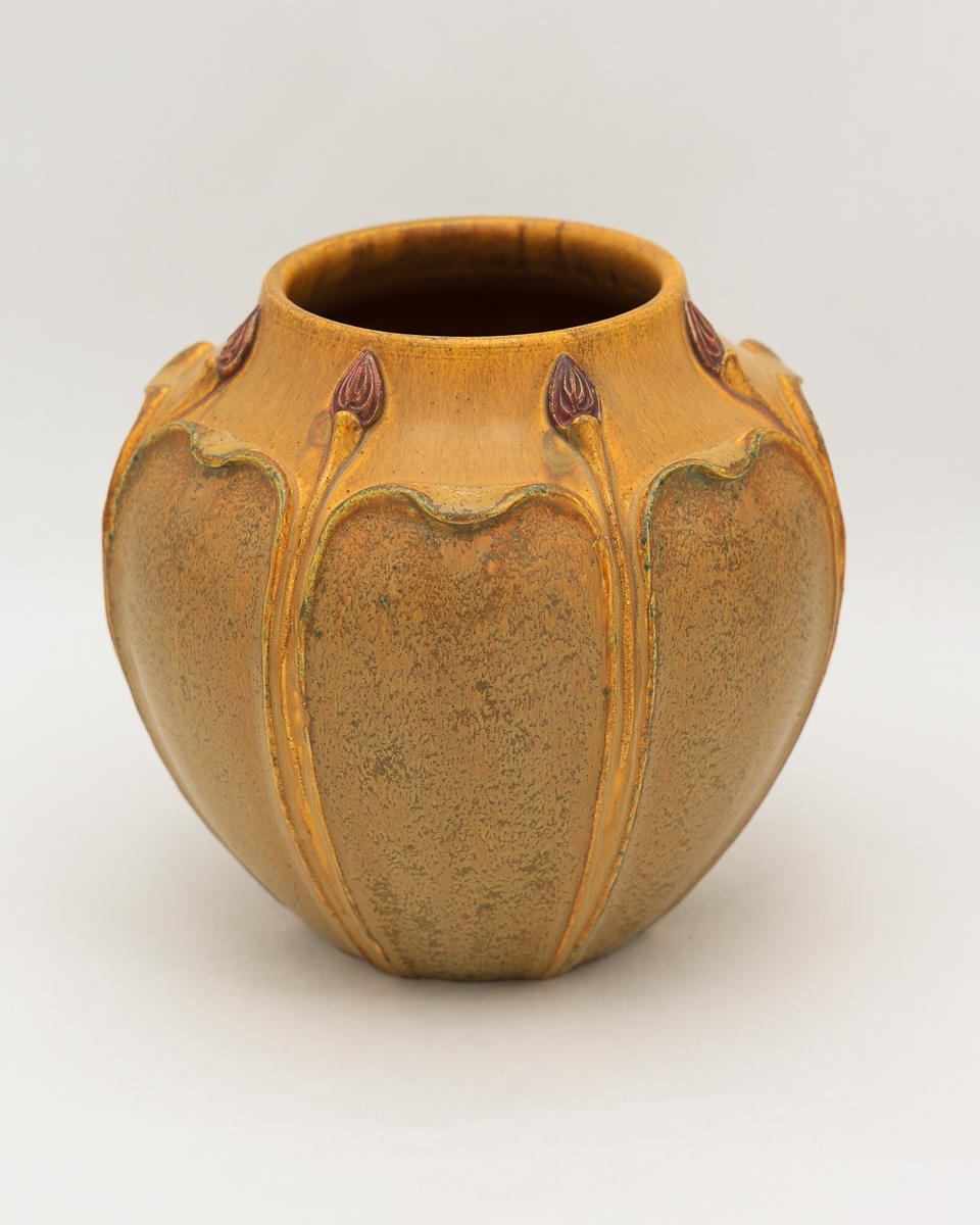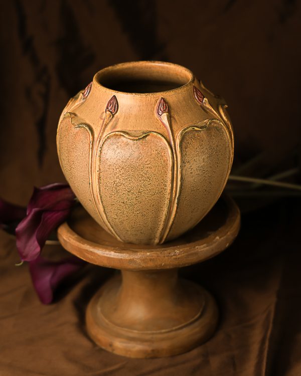 Broad, sculpted leaves rise from the base to cradle this rounded form, each one crowned by a simple budding flower at the shoulder. The Reverie Vase draws inspiration from the historic Grueby Faience Pottery, whose organic forms, low-relief leaf-and-bud sculpture, and signature matte glazes have influenced our studio since its founding. Offered in five of our house-developed glazes, each colorway brings a distinct character to this classic design — a fitting tribute as we celebrate thirty years of honoring and building on the Arts & Crafts tradition.