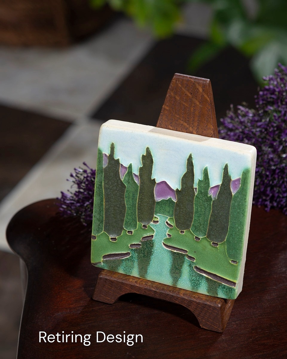 Italian Cypress trees line the banks of a river, reflecting into the clear blue water. This tile offers a complex landscape in small scale – the perfect choice for those who love miniatures! Stand not included.