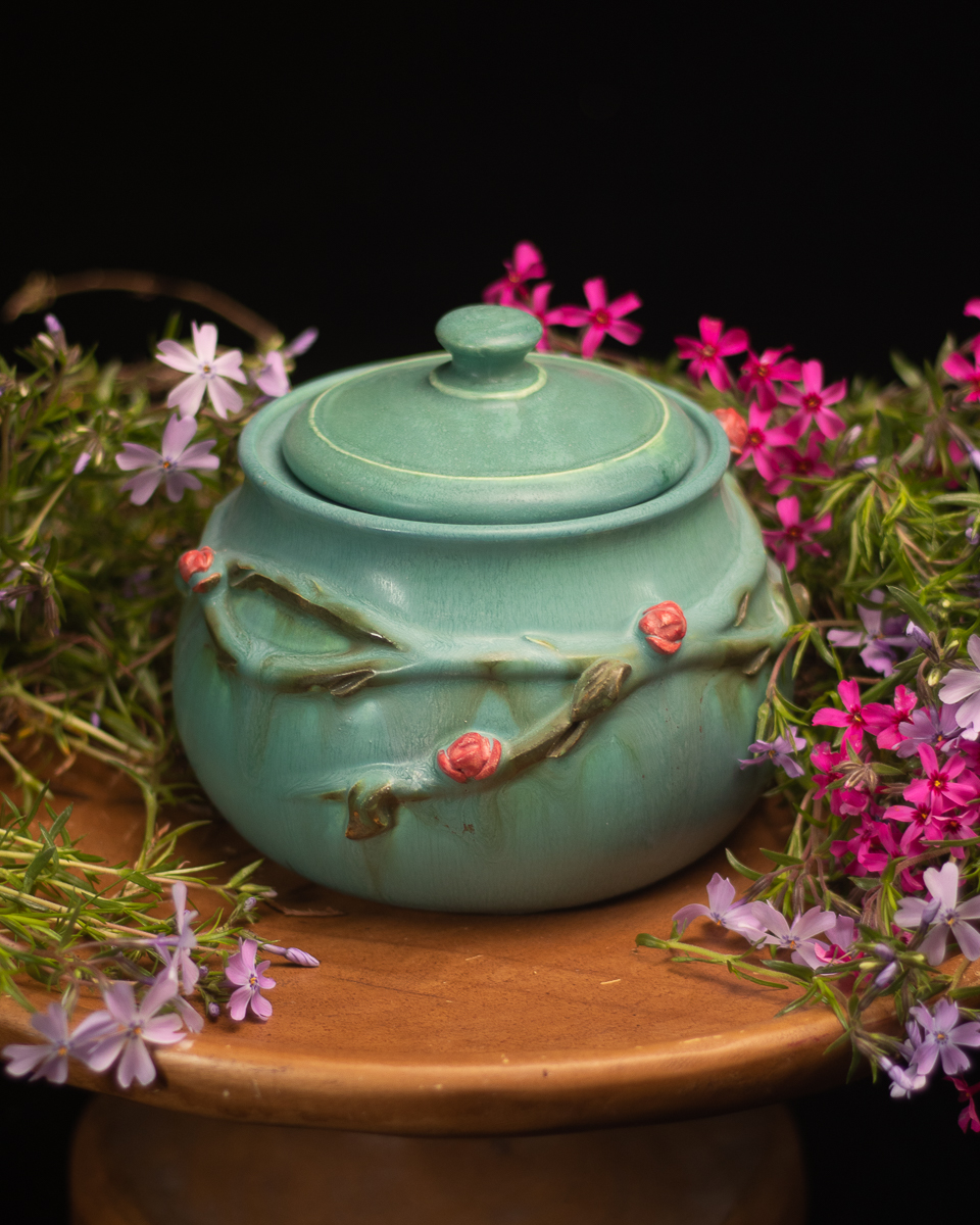 Whispers of spring encircle this intimate lidded vessel, where sculpted miniature roses rest in quiet anticipation of bloom. The soft, rounded form cradles these precious moments of nature’s promise, each bud a testament to life’s enduring beauty.