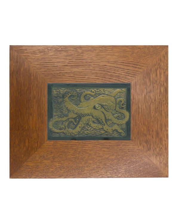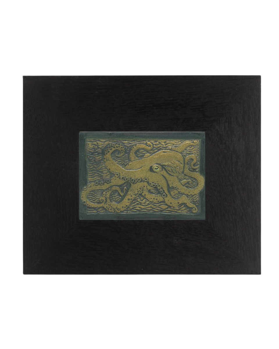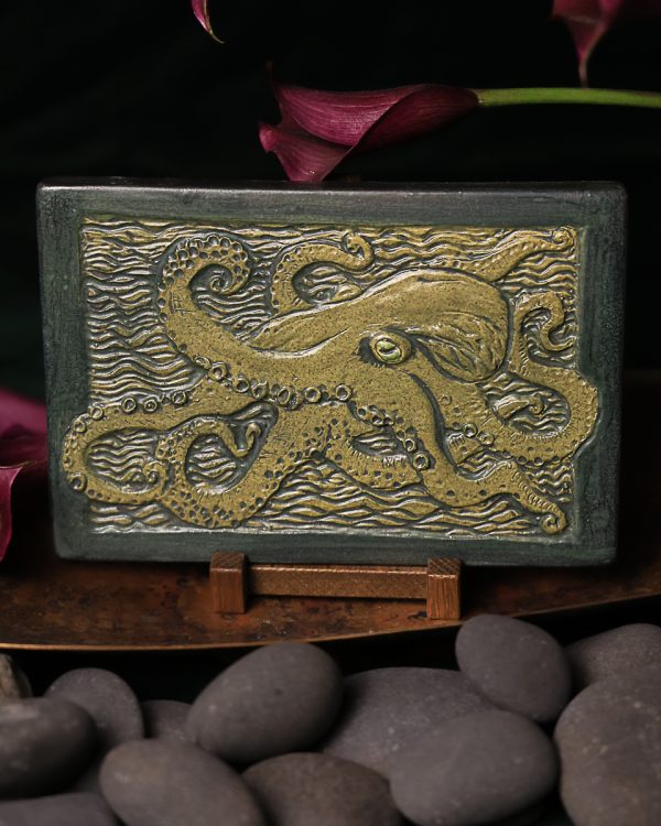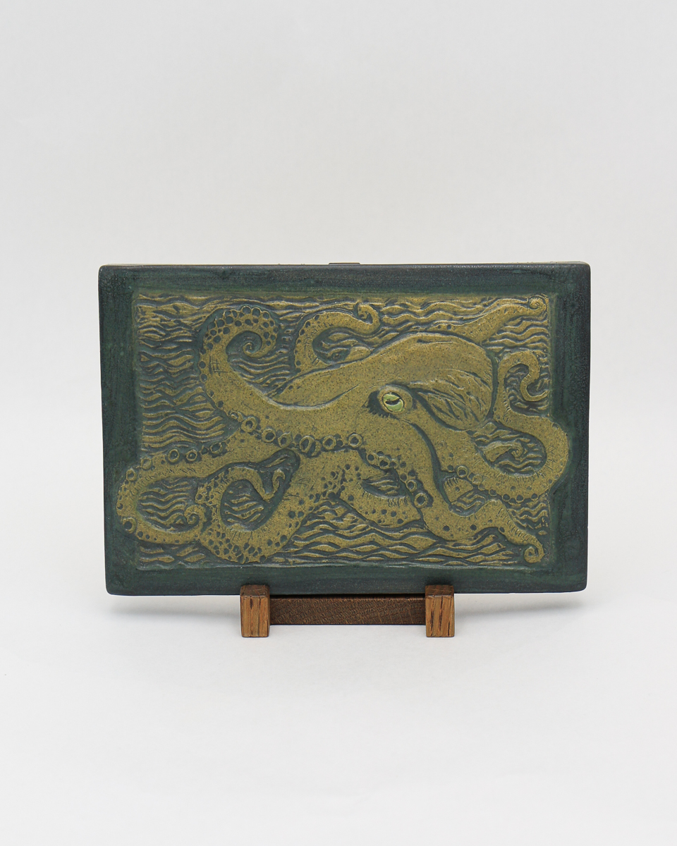 An octopus stretches its curling tentacles across a field of carved waves in this striking tile. Drawing inspiration from historic Batchelder tiles and traditional woodcuts — the same graphic style introduced with last year’s popular Magpie Tile — the composition is rich with texture and movement, from the detailed suckers on each arm to the rippling water that fills every inch of the background. The octopus has long been a favorite motif in our studio, and the bold, carved style gives this enigmatic creature a new sense of drama and presence.