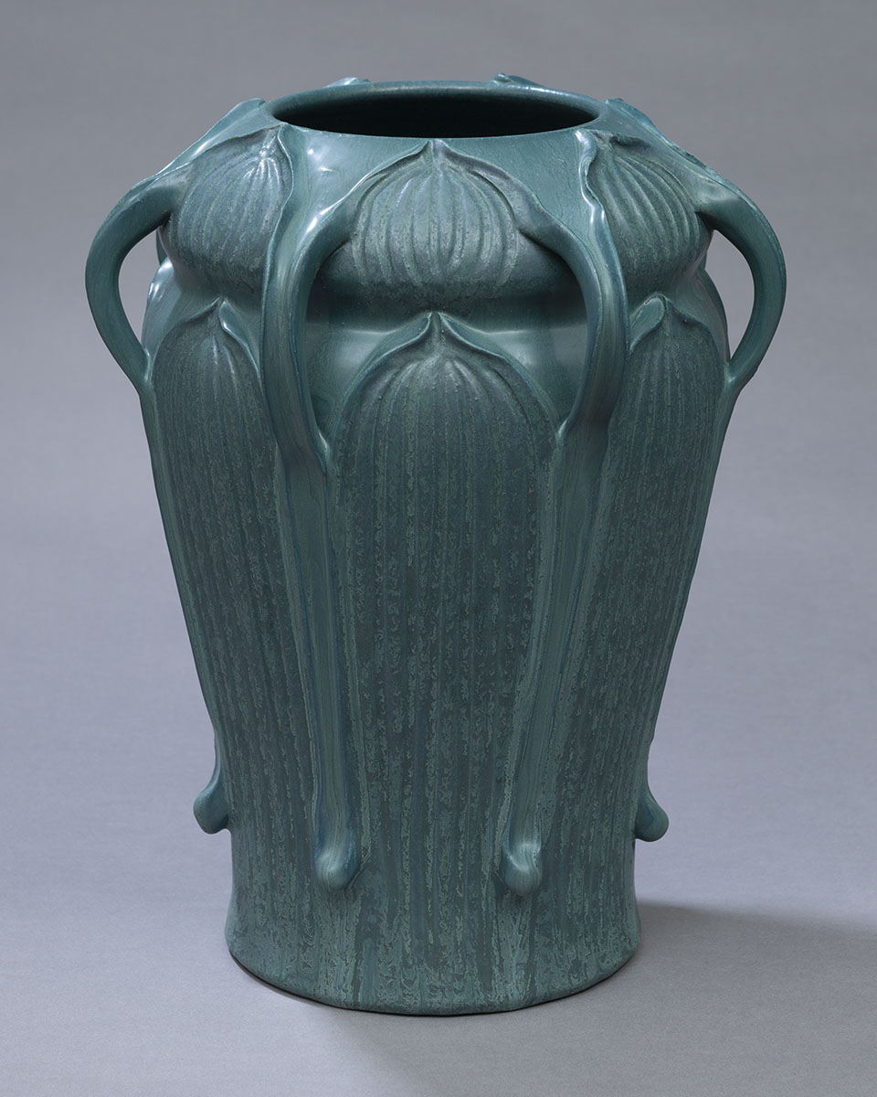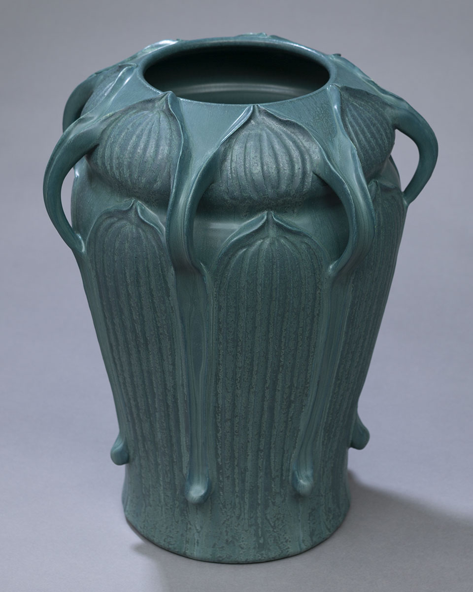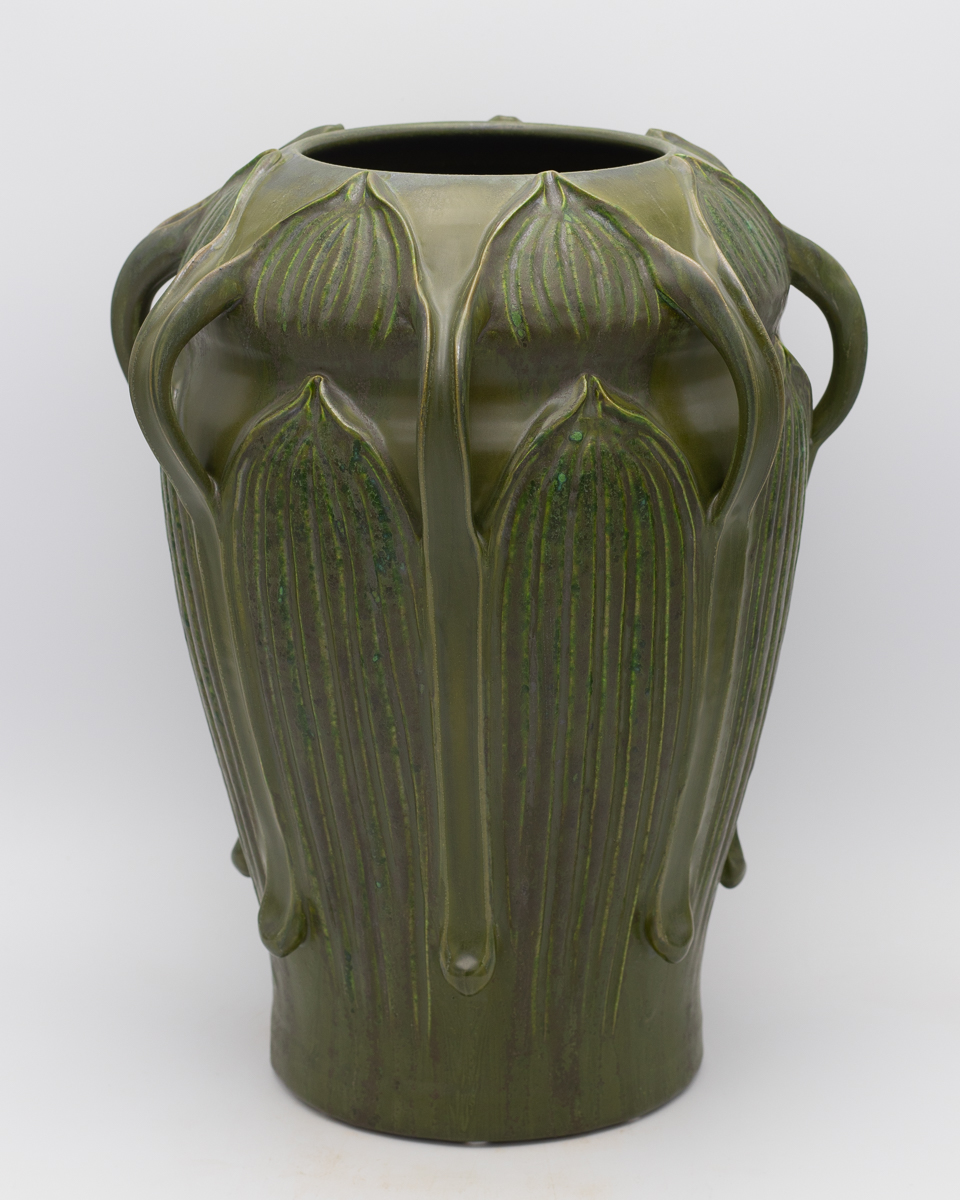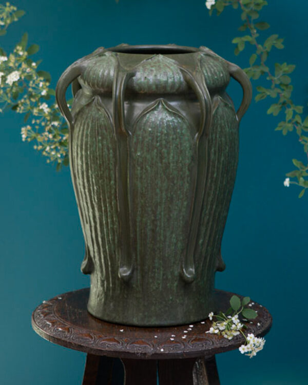Ephraim artists first created this classic Grueby Faience Pottery reproduction piece in 1999. This monumental vase has remained a part of our line ever since. Once only available occasionally in our galleries and upon request, we are pleased to present the Seven Handled Vase—the favorite of Arts & Crafts enthusiasts—glazed in house-made organic green or curdled teal.