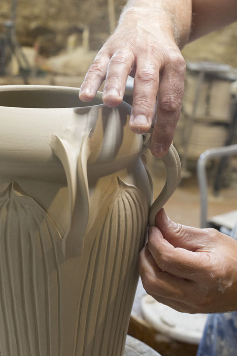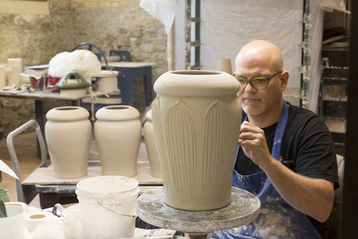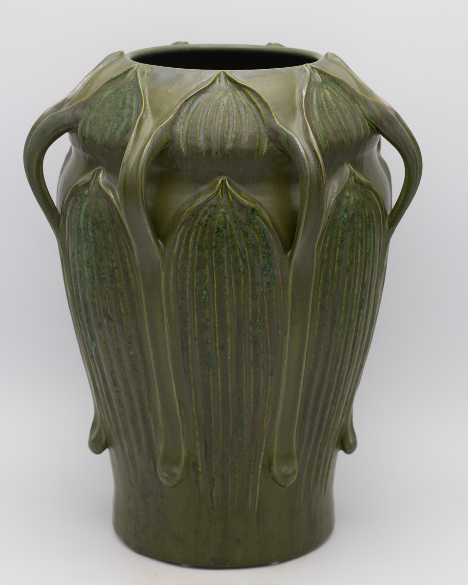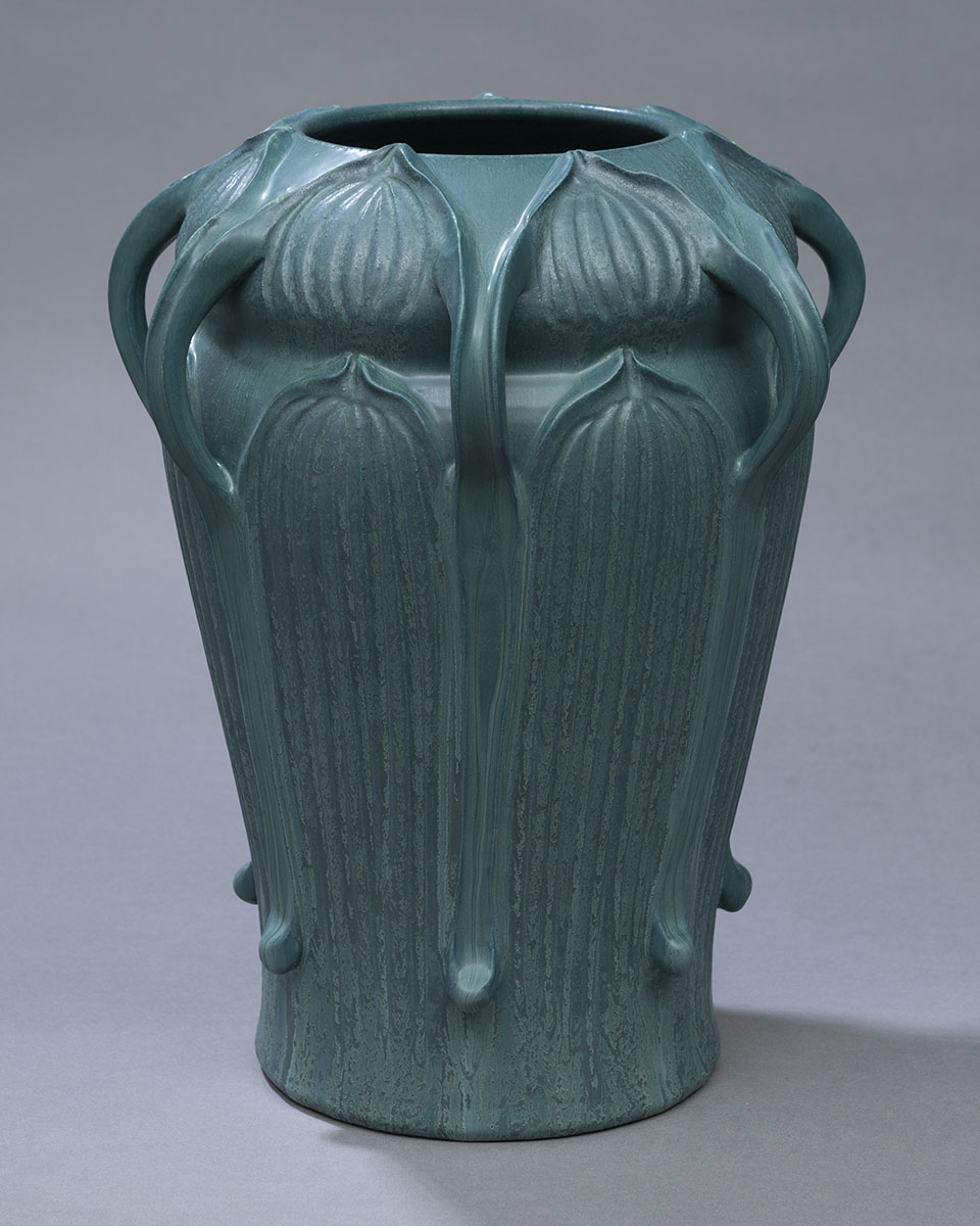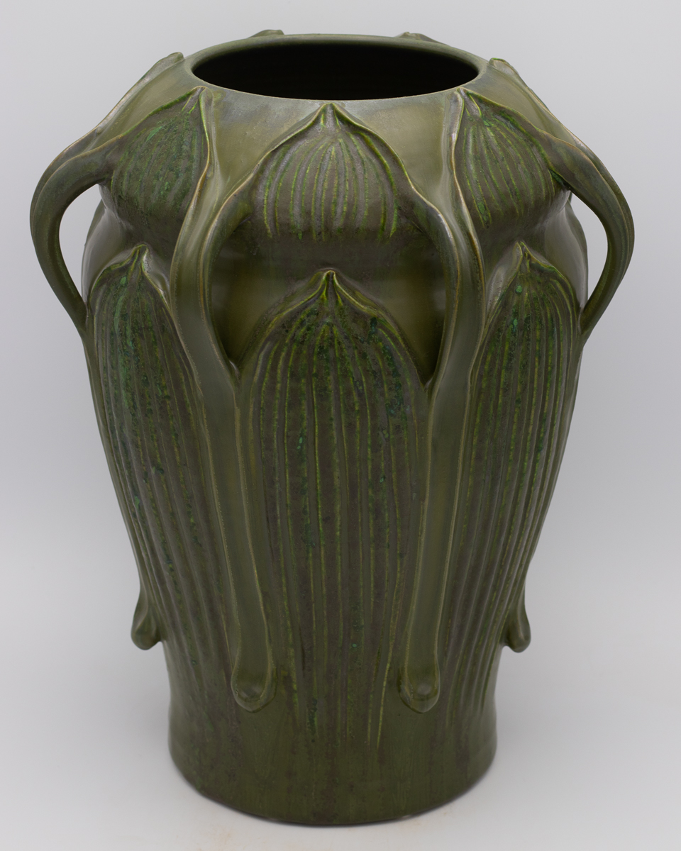 Ephraim artists first created this classic Grueby Faience Pottery reproduction piece in 1999. This monumental vase has remained a part of our line ever since. Once only available occasionally in our galleries and upon request, we are pleased to present the Seven Handled Vase—the favorite of Arts & Crafts enthusiasts—glazed in house-made organic green or curdled teal.