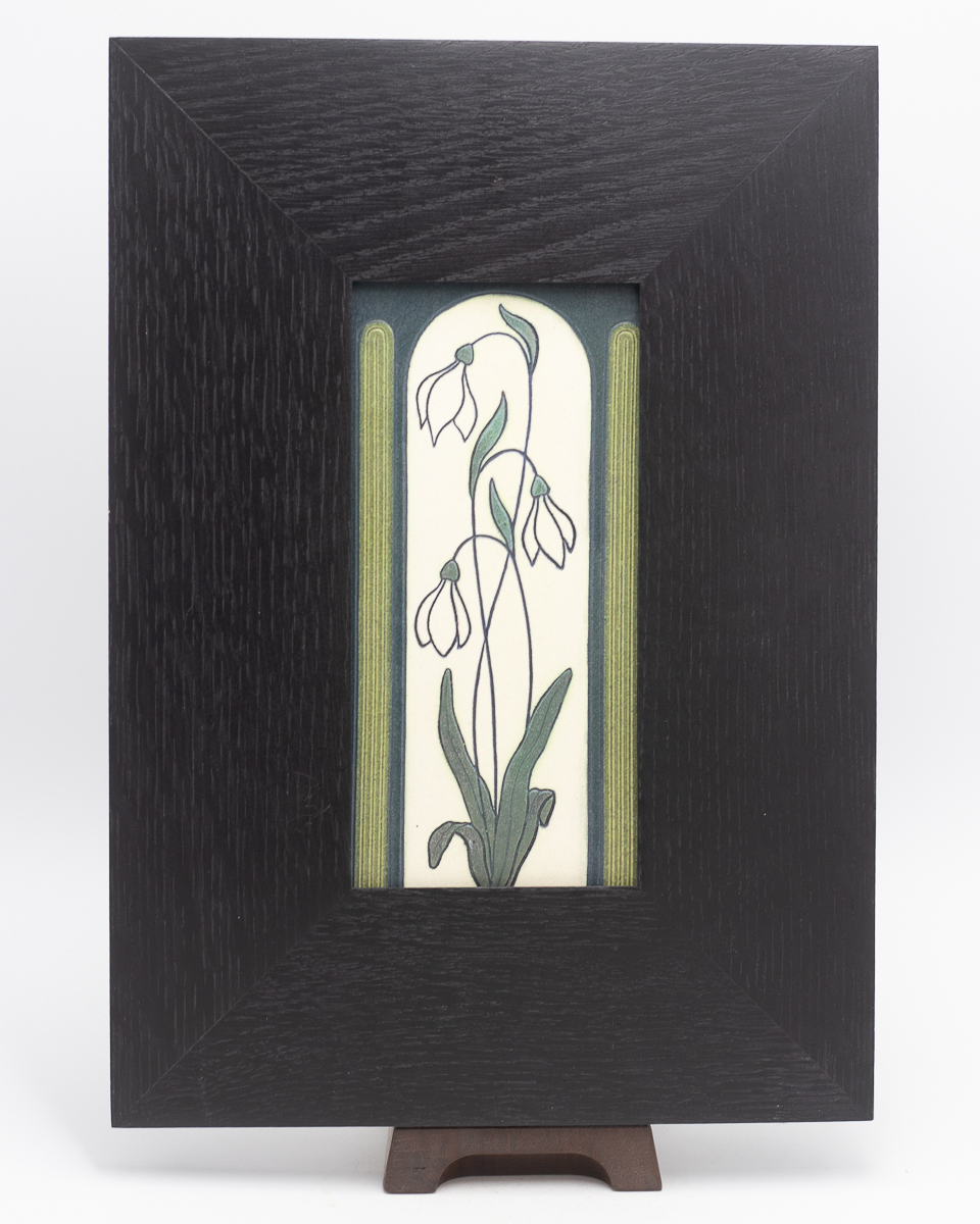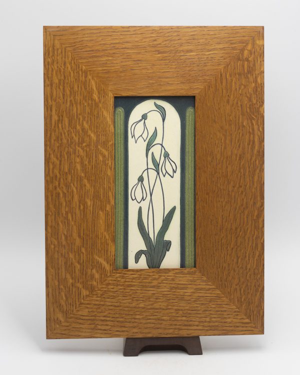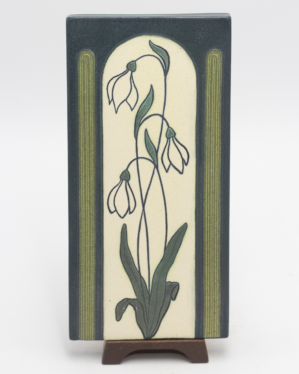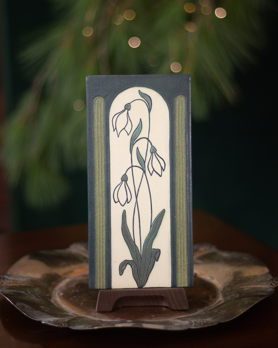 The Snowdrop Trio Tile celebrates one of winter’s most hopeful blooms—the delicate snowdrop that emerges through the snow, heralding spring’s promise even in the coldest months. This Arts and Crafts-inspired design features three gracefully drooping bell-shaped flowers rendered in elegant relief against a cream background, framed by vertical bands of chestnut green with subtle incised detailing. The charcoal blue border adds depth to this timeless piece. Display it year-round as a reminder that beauty persists through every season.