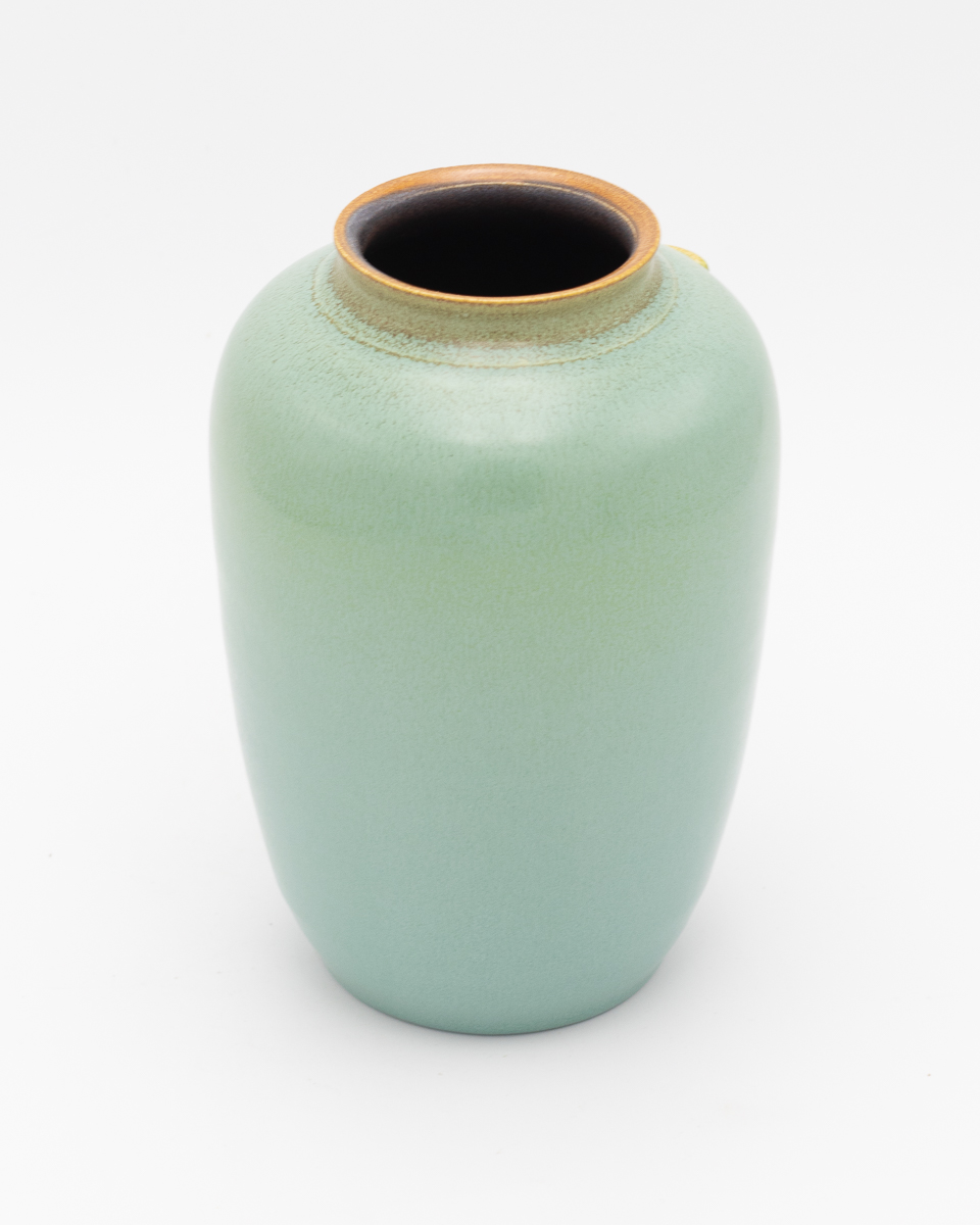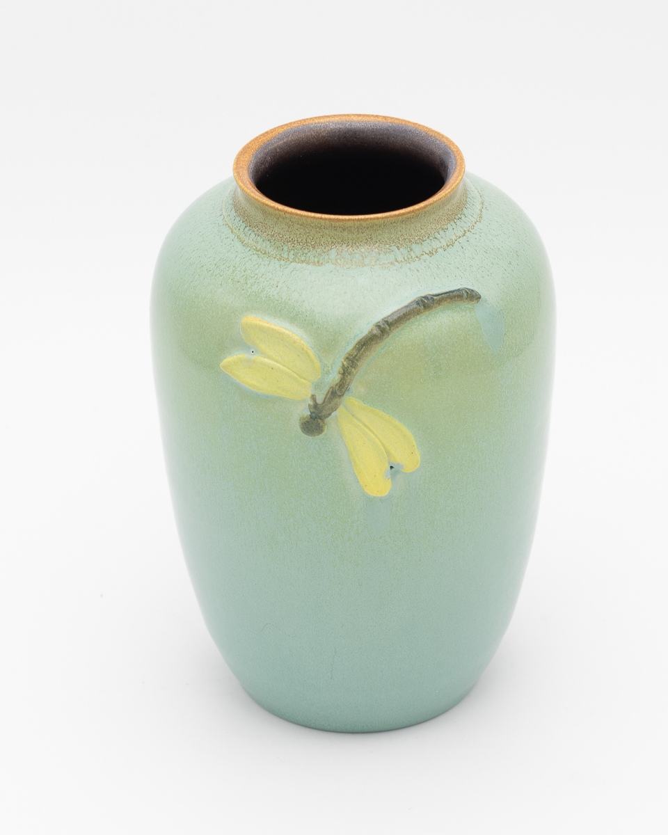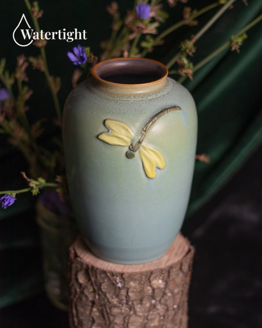 A golden dragonfly alights on this serene vessel, its delicate wings catching light against the soft sage glaze. The graceful ovoid form evokes calm water surfaces and quiet garden moments. Ideal for wildflowers or as a meditative accent piece.