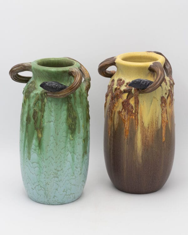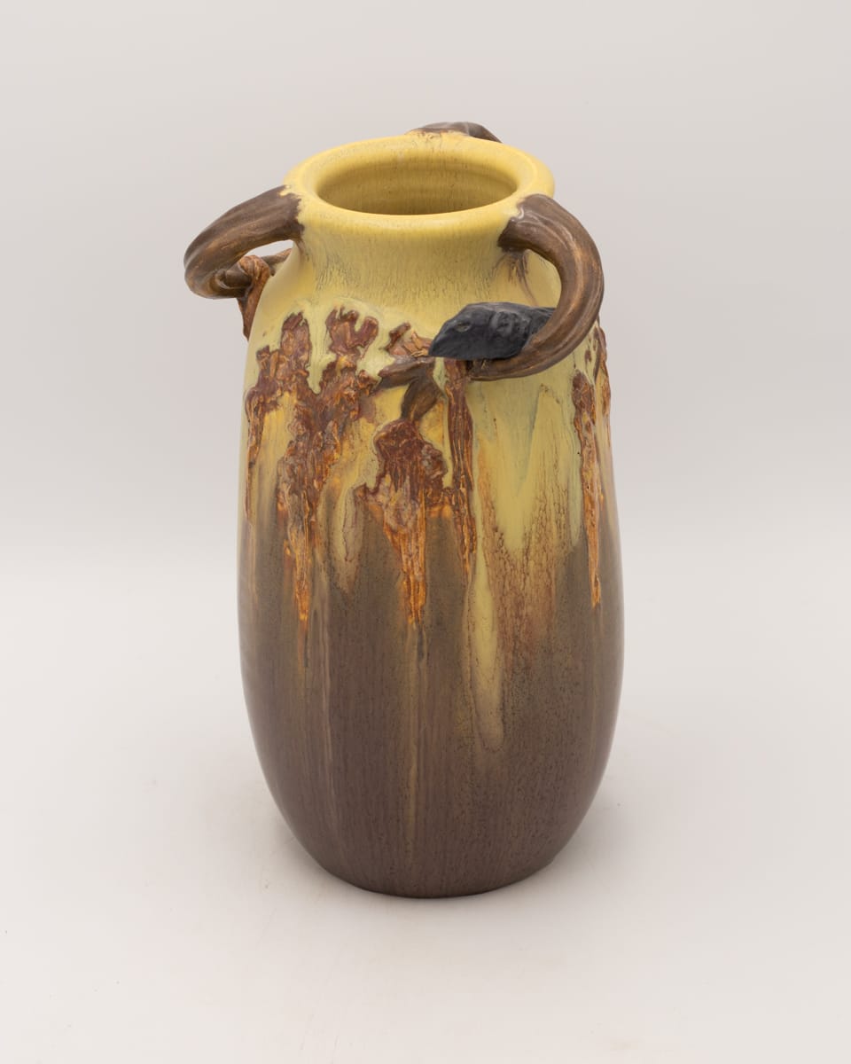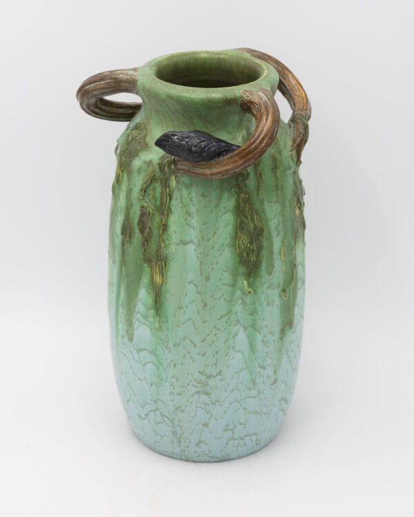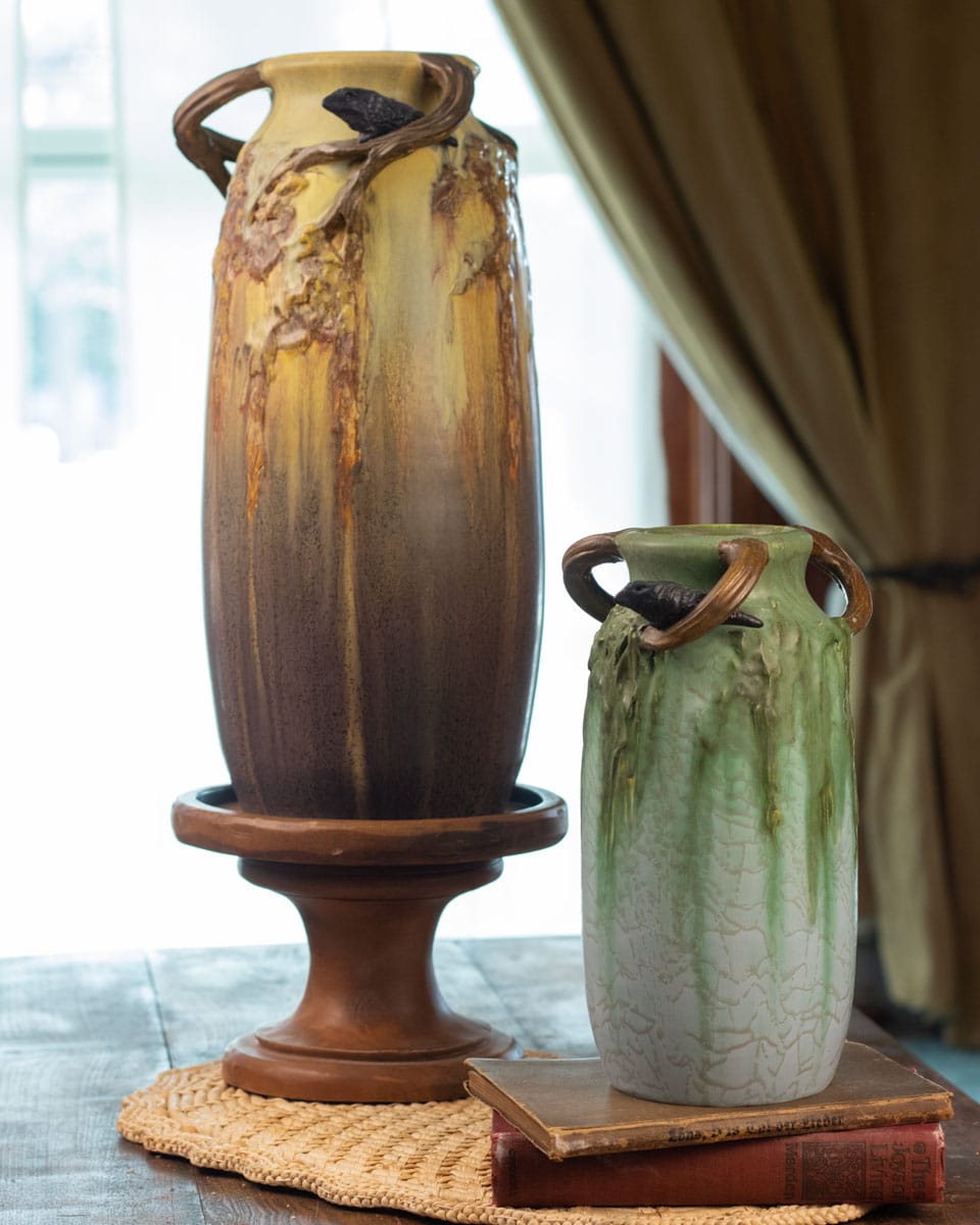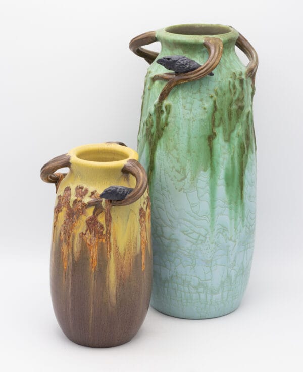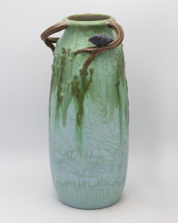 A lone crow poses on one of three branch handles, overlooking a moody and mysterious vista, framed by draping lichen. This piece was inspired by Ephraim artists’ trip to the West Coast, where soaring Monterey pine trees with lichen—so different from fir trees here in Wisconsin—fascinated them. The Lookout Vase is offered in two sizes and two glaze options.