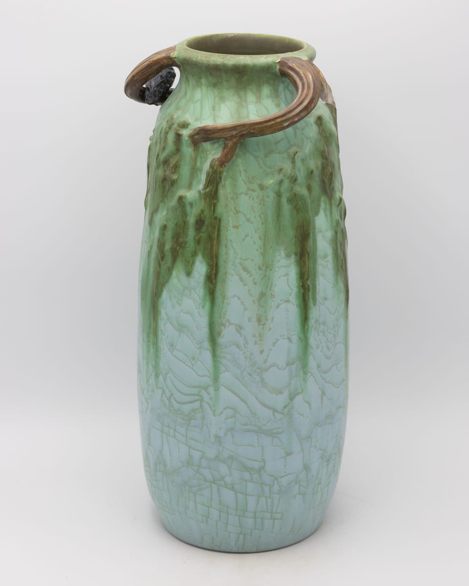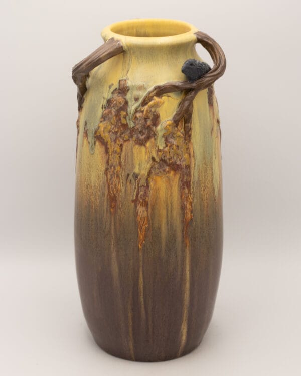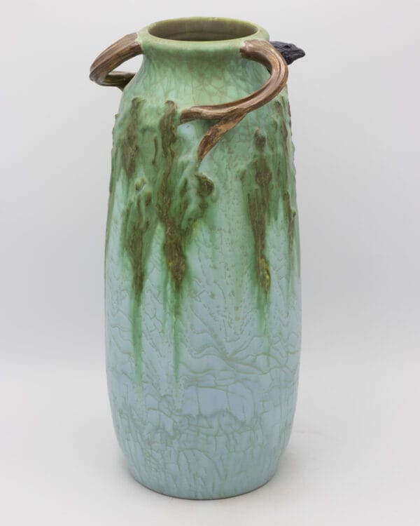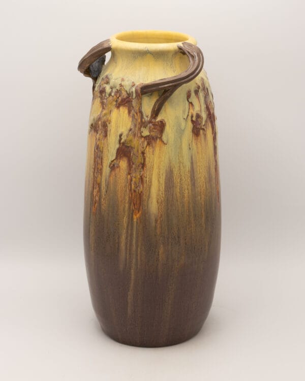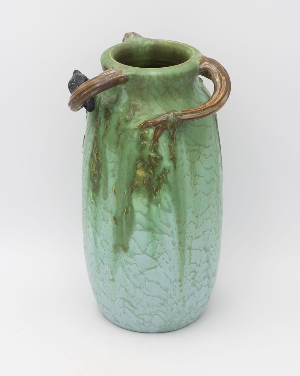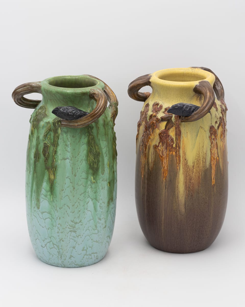 A lone crow poses on one of three branch handles, overlooking a moody and mysterious vista, framed by draping lichen. This piece was inspired by Ephraim artists’ trip to the West Coast, where soaring Monterey pine trees with lichen—so different from fir trees here in Wisconsin—fascinated them. The Lookout Vase is offered in two sizes and two glaze options.